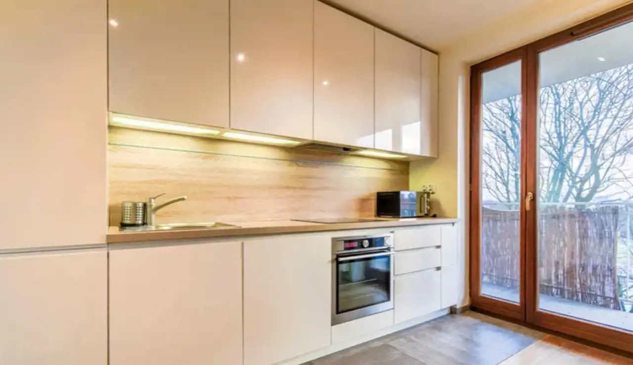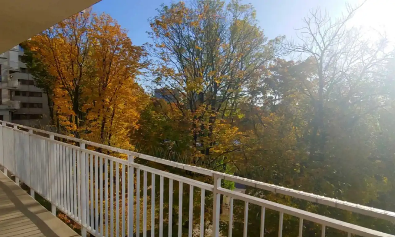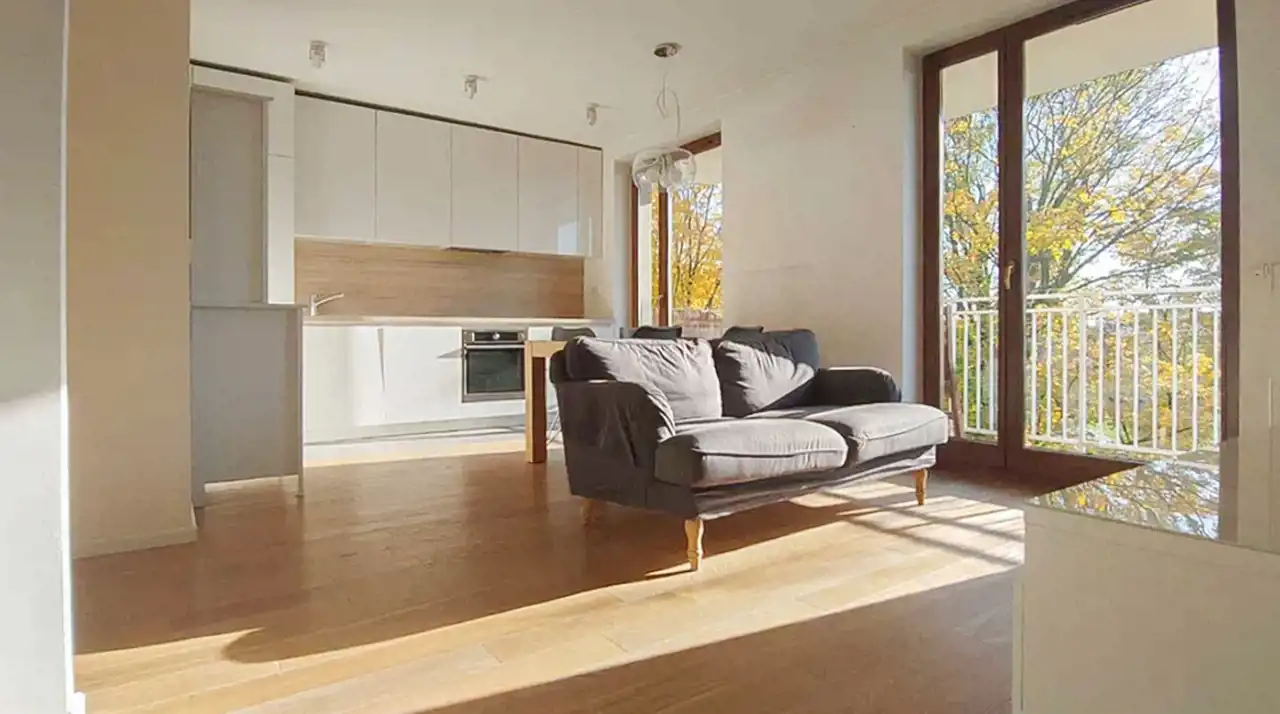 The apartment has an area of 50 m2, is spacious, fully furnished, and ready to move in from April. Large glazing provides excellent natural light, and the balcony running along the entire width of the apartment offers a beautiful view of green areas. The exposure is south-west.
