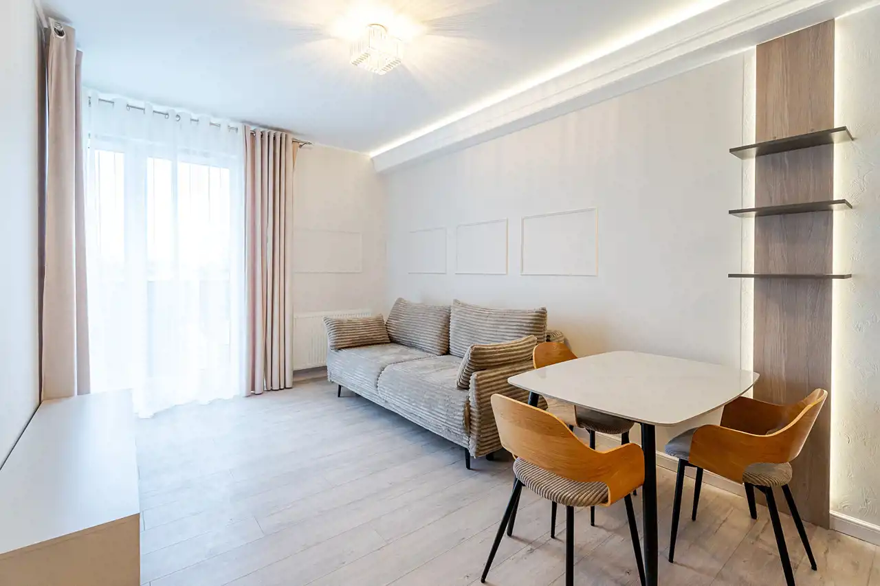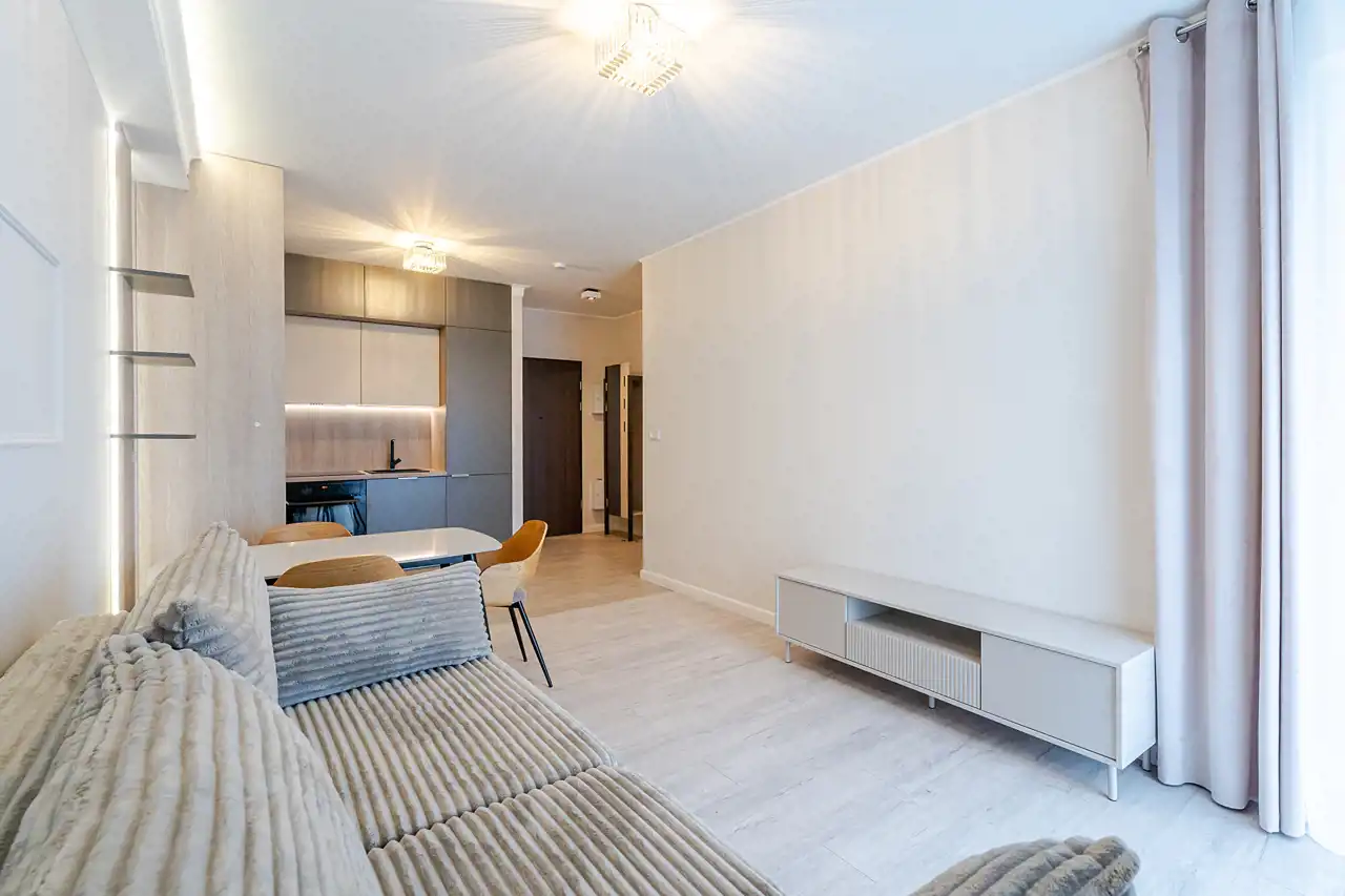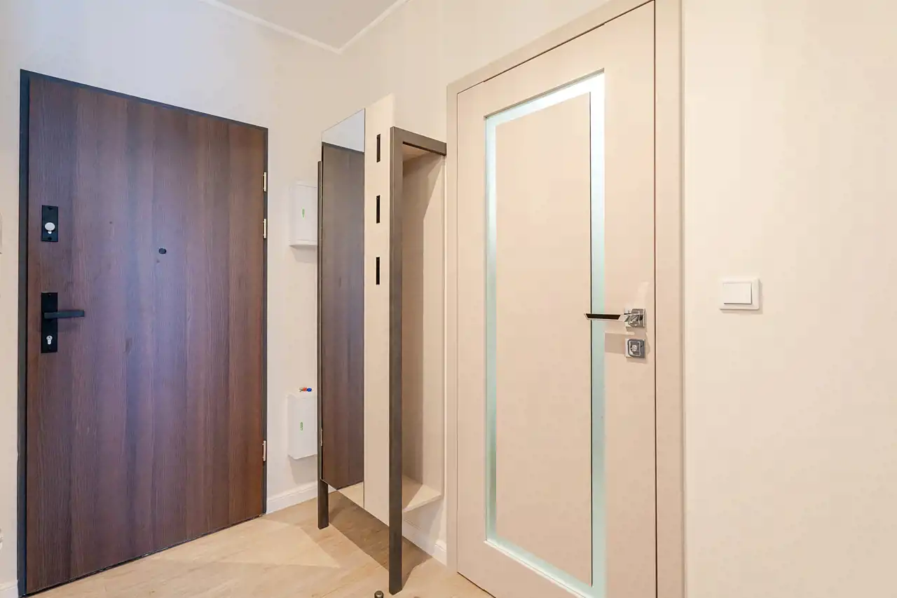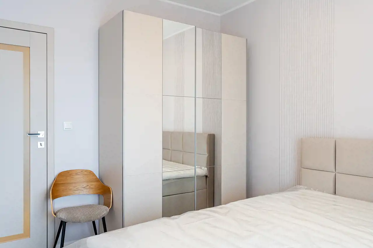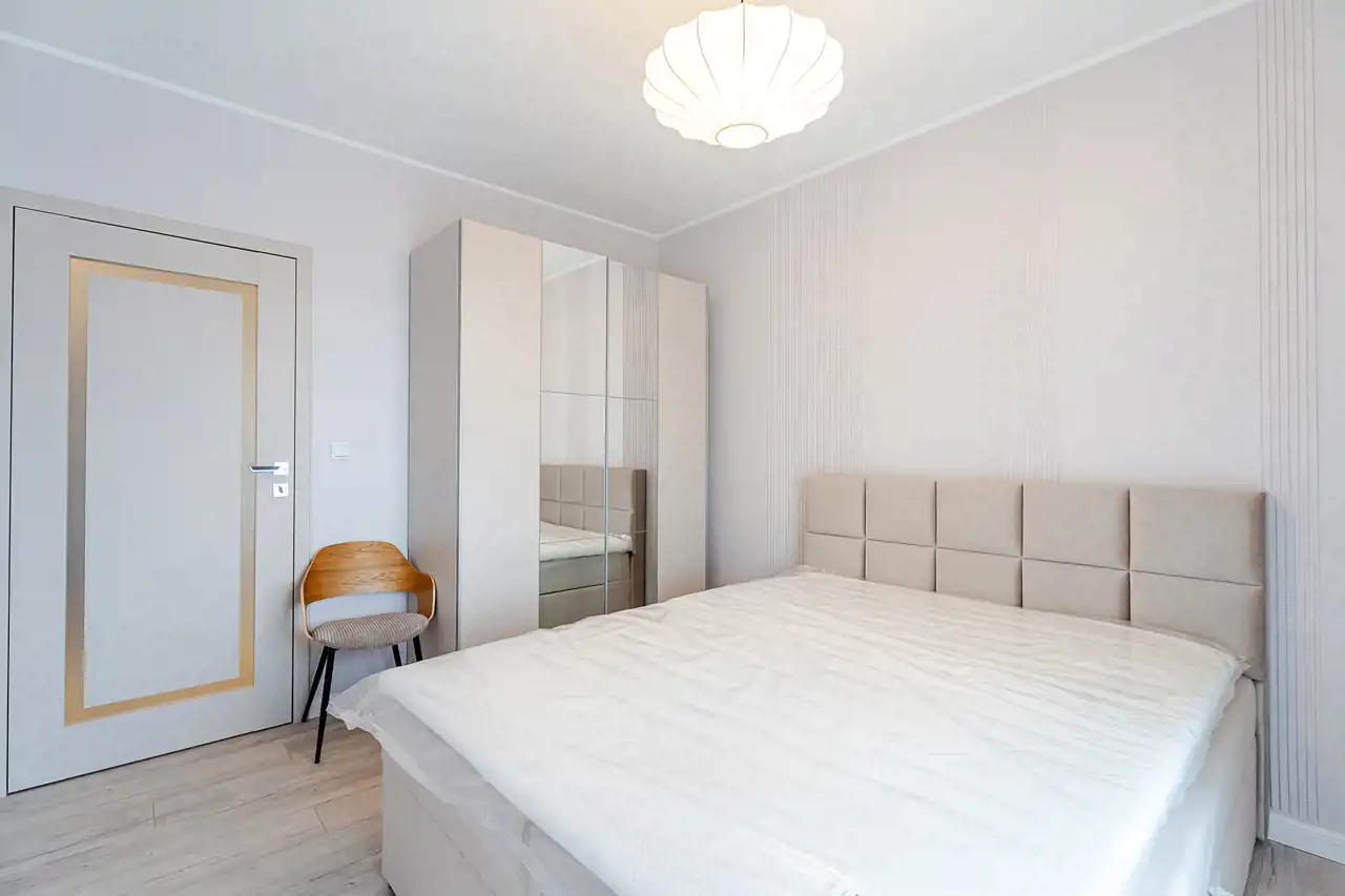 Mieszkanie jest w pełni wyposażone i gotowe do zamieszkania - właściciel zadbał o materiały dobrej jakości i zabudowy na wymiar, aby optymalnie wykorzystać dostępną przestrzeń. Do naszej dyspozycji na miejscu są nowe sprzęty AGD takie jak pralka, zmywarka 45cm, piekarnik, płyta indukcyjna, lodówko-zamrażarka czy okap. Łazienka została wyposażona w kabinę walk-in z deszczownicą oraz słuchawką prysznicową, toaletę z podręczną słuchawką do podmywania, umywalkę z lustrem i szafkami, które ułatwią codzienne zagospodarowanie. W sypialni znajdziemy łoże małżeńskie o wymiarach 200x160cm, oraz optymalnych gabarytów szafę z lustrem. Ściany i podłogi zostały wykończone materiałami o wzmocnionej odporności, takie jak panele klasy 5tej, czy farby zmywalne firmy Flugger, co pozwoli nam na łatwiejsze utrzymanie czystości w mieszkaniu.