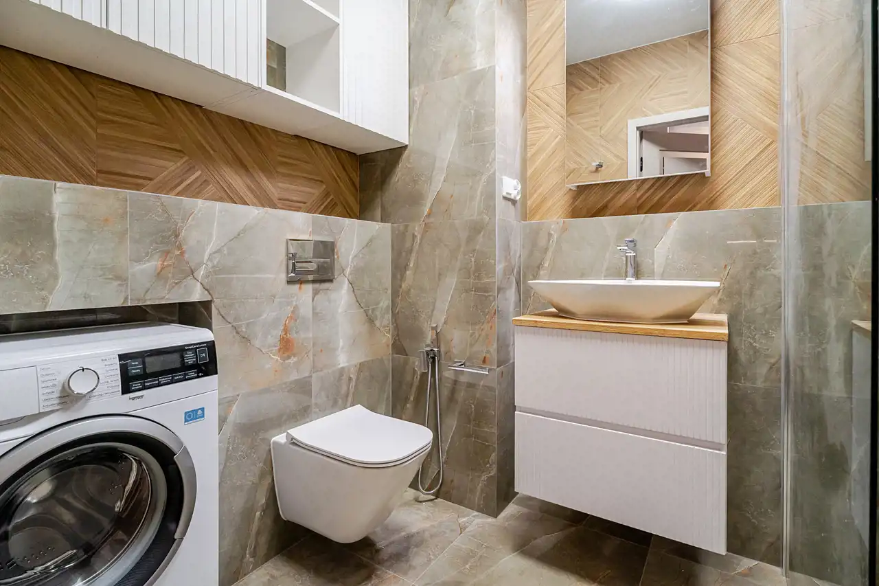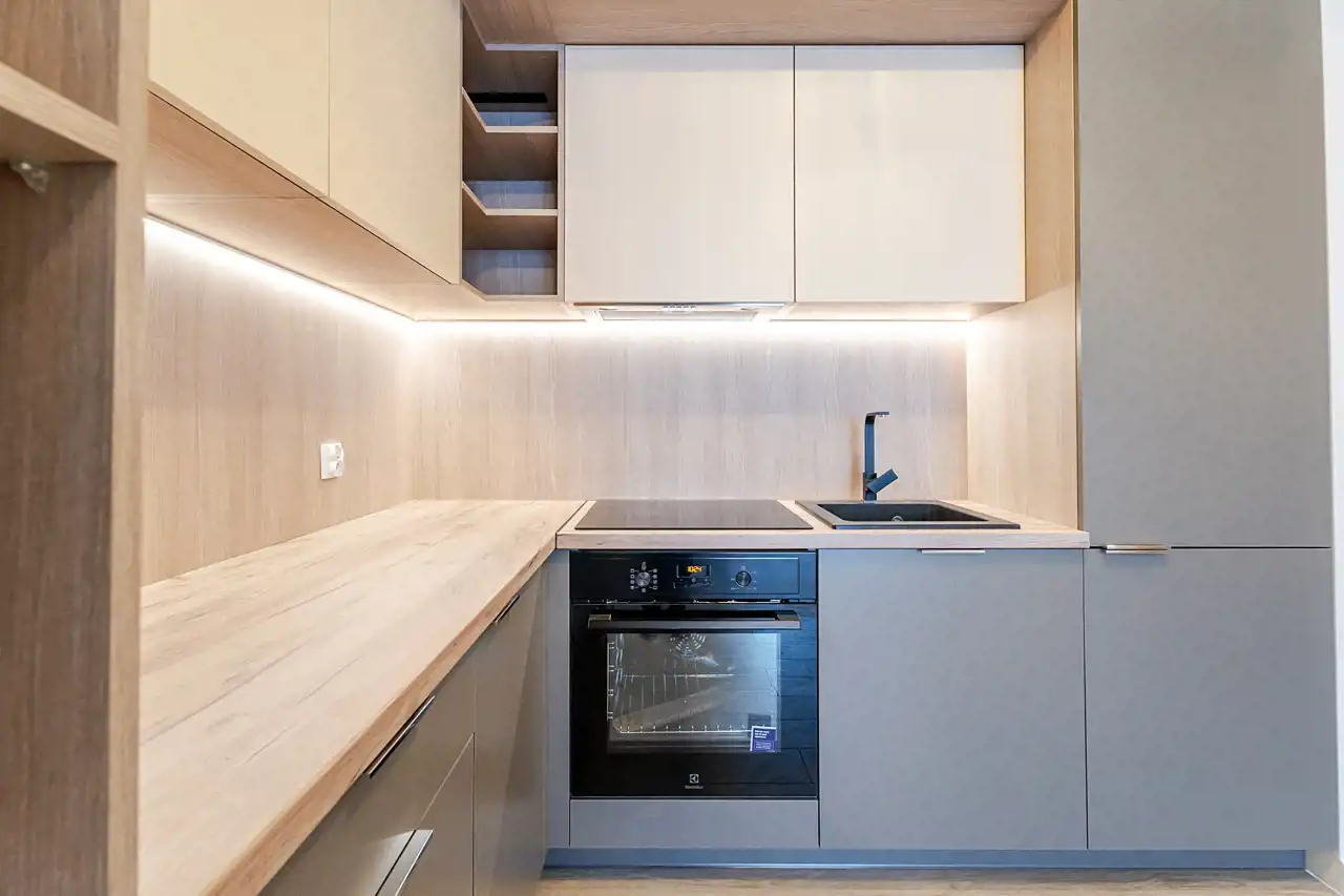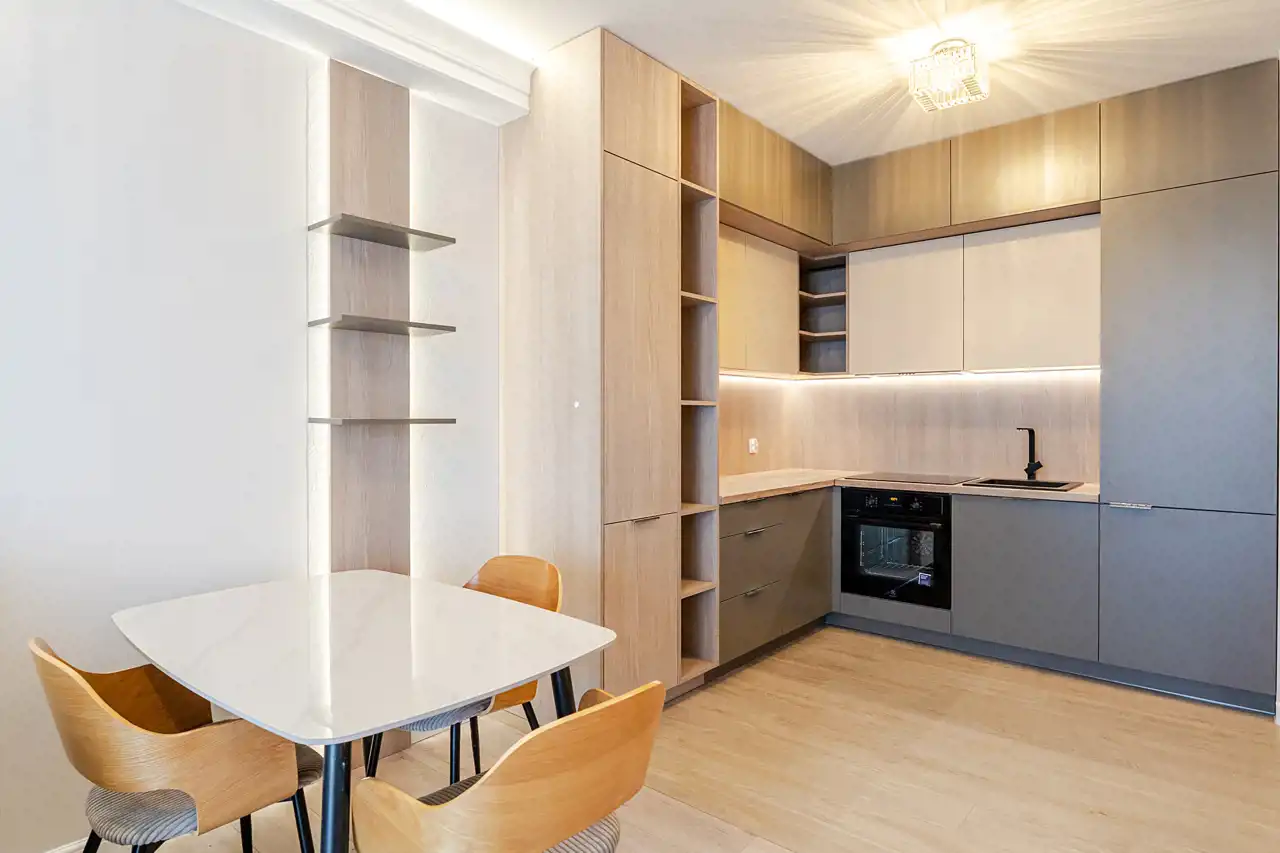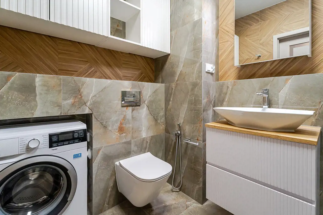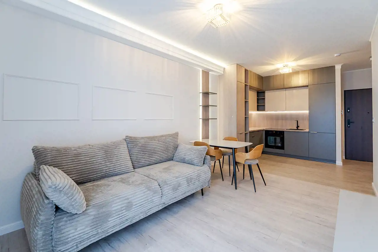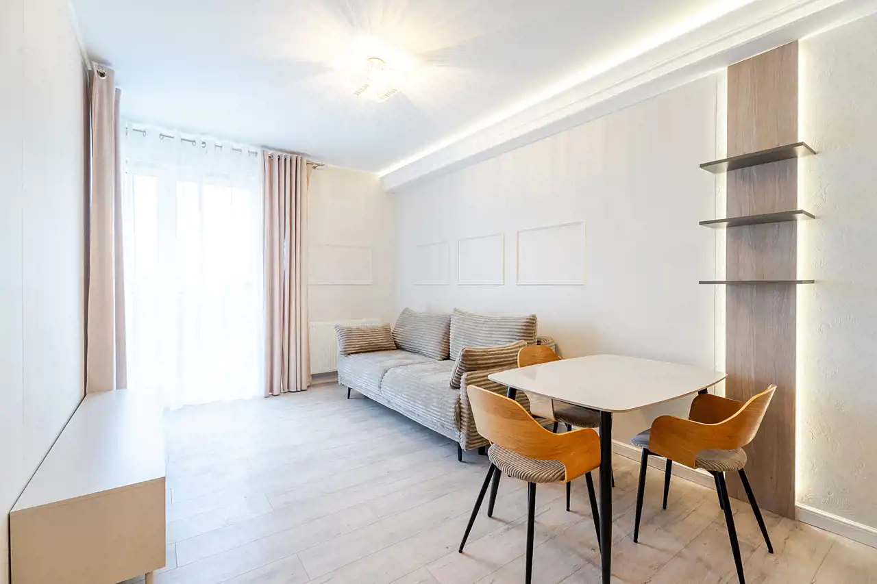 Mieszkanie jest w pełni wyposażone i gotowe do zamieszkania - właściciel zadbał o materiały dobrej jakości i zabudowy na wymiar, aby optymalnie wykorzystać dostępną przestrzeń. Do naszej dyspozycji na miejscu są nowe sprzęty AGD takie jak pralka, zmywarka 45cm, piekarnik, płyta indukcyjna, lodówko-zamrażarka czy okap. Łazienka została wyposażona w kabinę walk-in z deszczownicą oraz słuchawką prysznicową, toaletę z podręczną słuchawką do podmywania, umywalkę z lustrem i szafkami, które ułatwią codzienne zagospodarowanie. W sypialni znajdziemy łoże małżeńskie o wymiarach 200x160cm, oraz optymalnych gabarytów szafę z lustrem. Ściany i podłogi zostały wykończone materiałami o wzmocnionej odporności, takie jak panele klasy 5tej, czy farby zmywalne firmy Flugger, co pozwoli nam na łatwiejsze utrzymanie czystości w mieszkaniu.