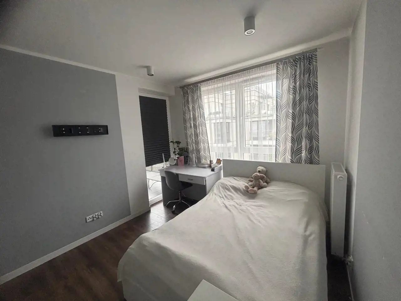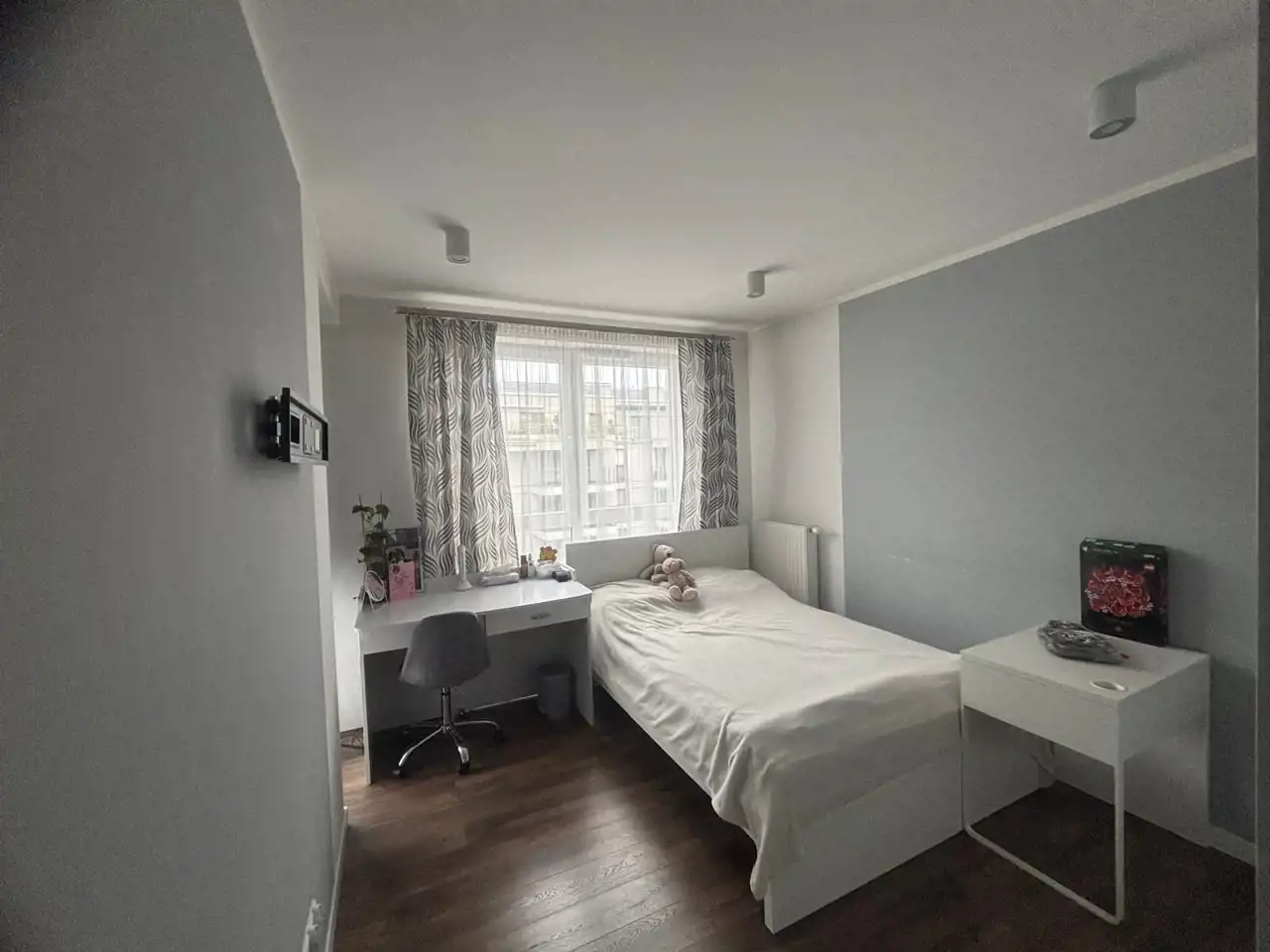 Mieszkanie wyposażone i umeblowane w wysokim standardzie. W sypialni znajduje się łóżko, szafy oraz stelaża z możliwością zawieszenia telewizora. Z tej sypialni jest wyjście na balkon