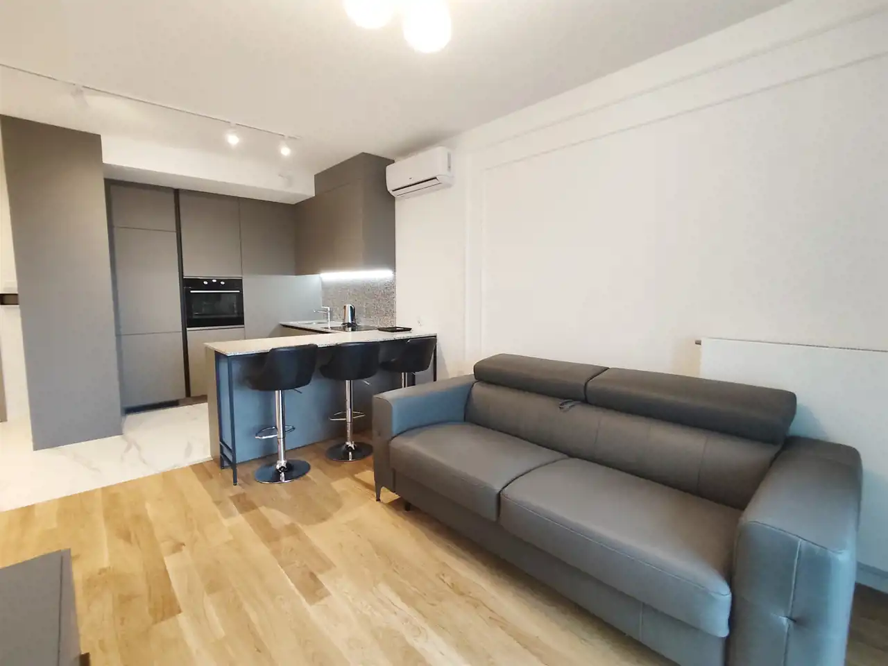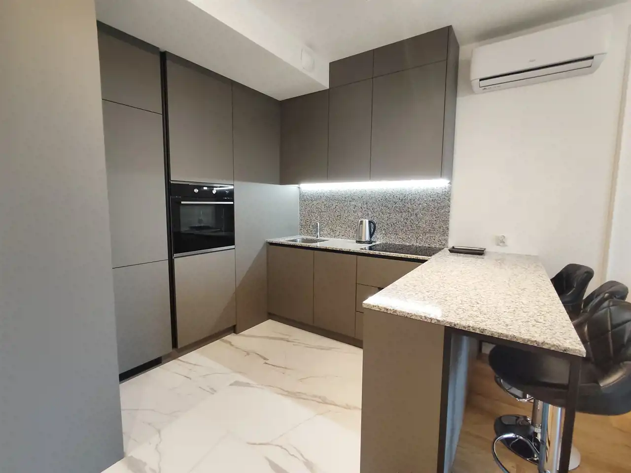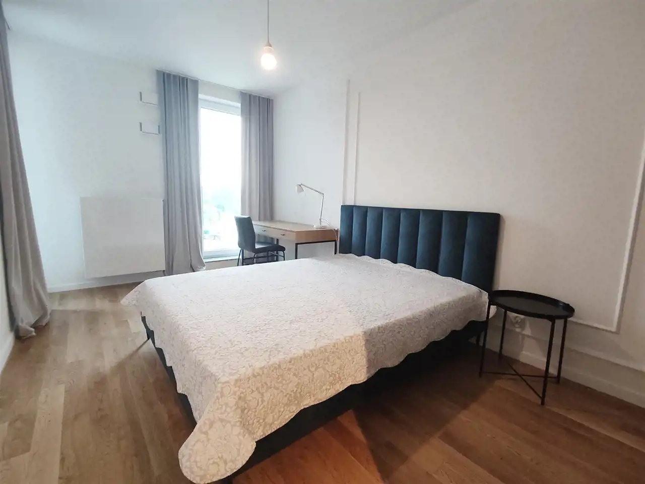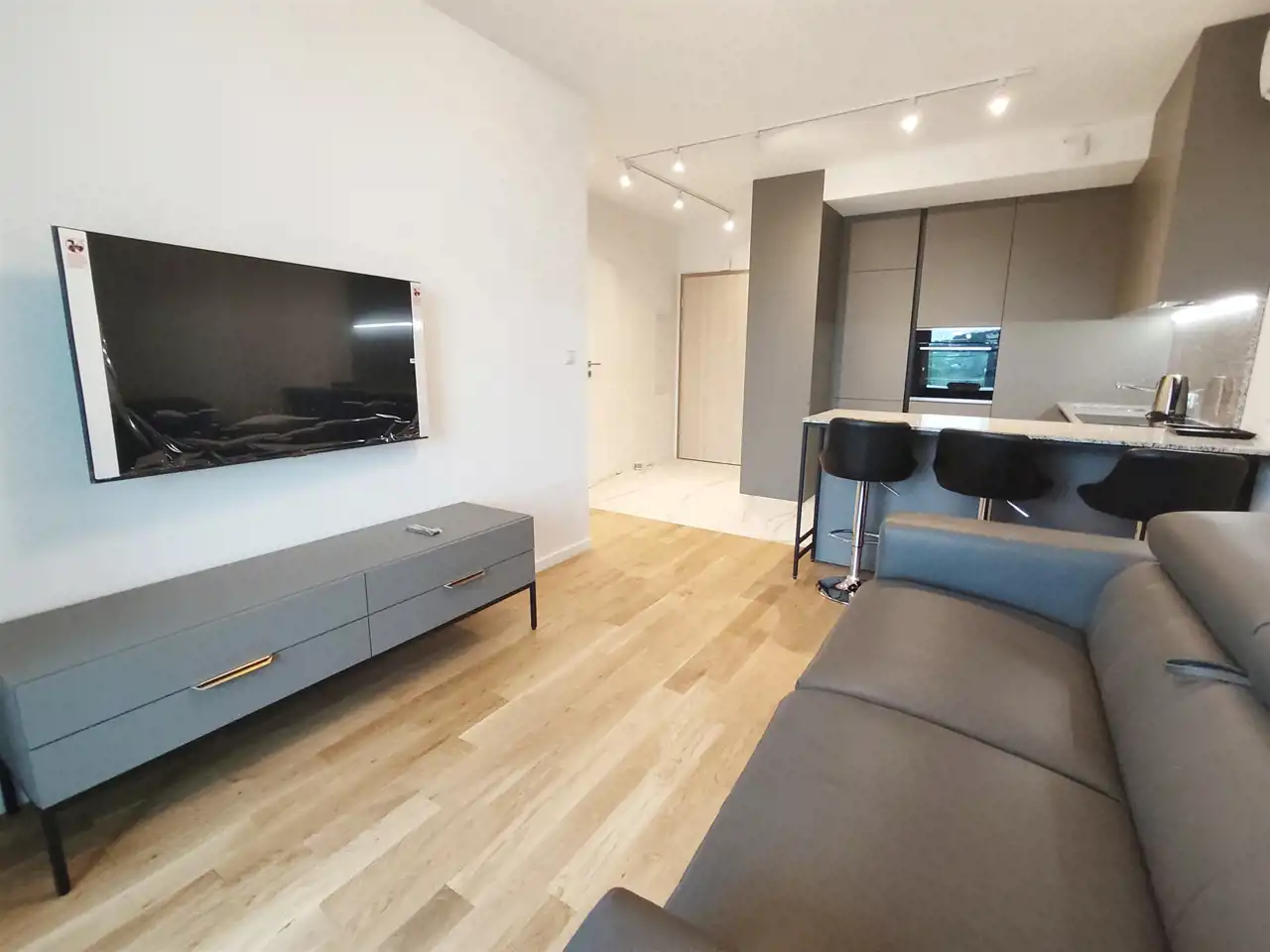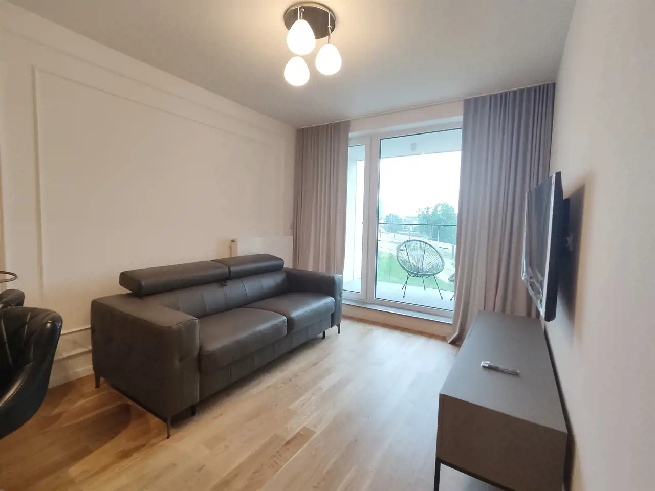Mieszkanie wyposażone i umeblowane w wysokim standardzie wg. projektu architekta. W salonie znajduje się komplet wypoczynkowy z możliwością rozłożenia, stół z krzesłami, meblościanka oraz telewizor. Z salonu jest wyjście na balkon.