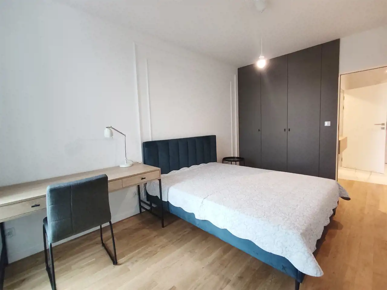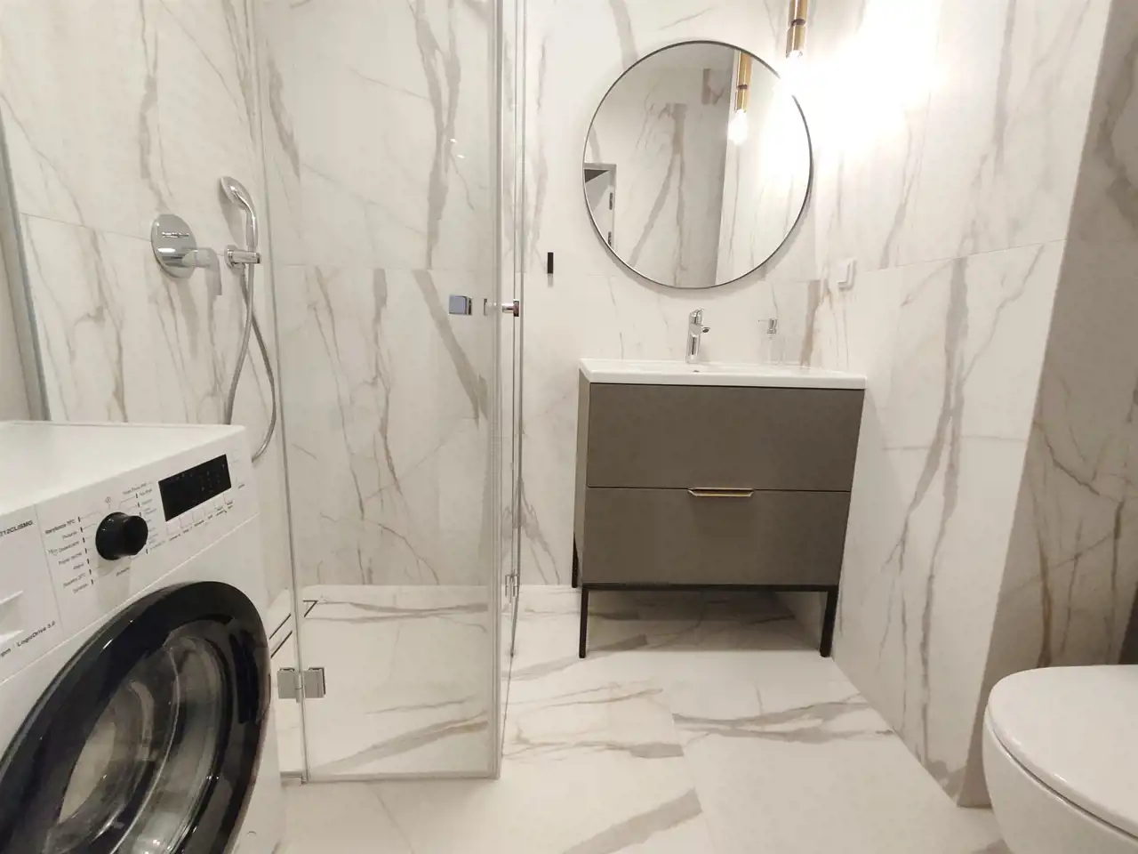 W sypialni znajduje się dwuosobowe łóżko z materacem, pojemna szafa oraz miejsce do pracy. W łazience znajduje się kabina prysznicowa, pralka, toaleta oraz półki. W przedpokoju jest duża pojemna szafa