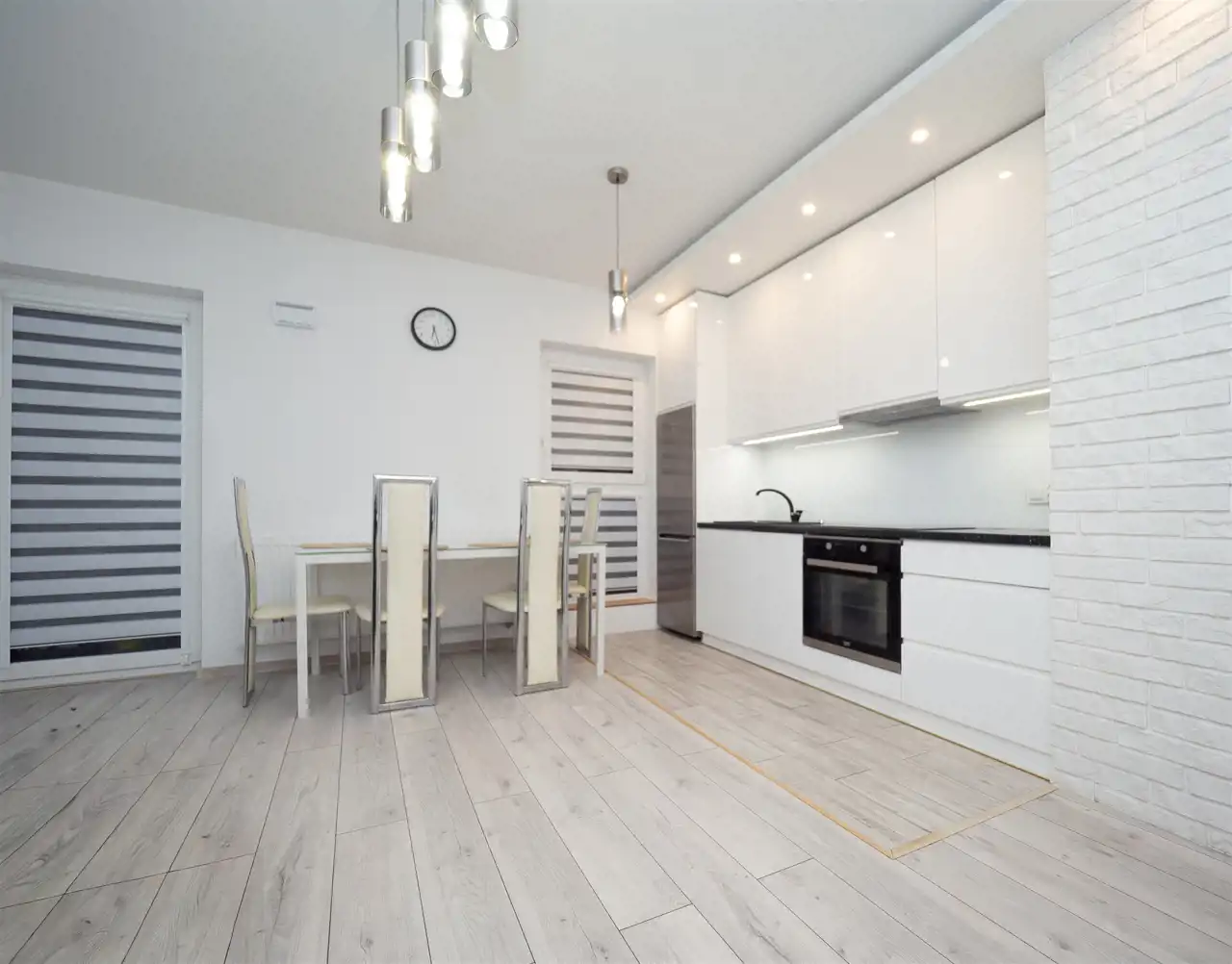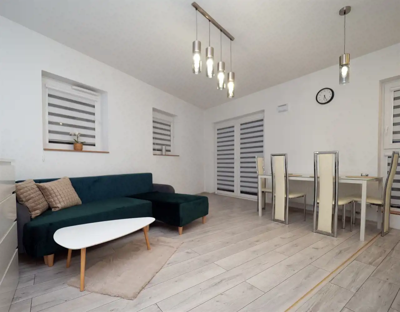 - salon z aneksem kuchennym (lodówka, piekarnik, zmywarka, płyta indukcyjna),