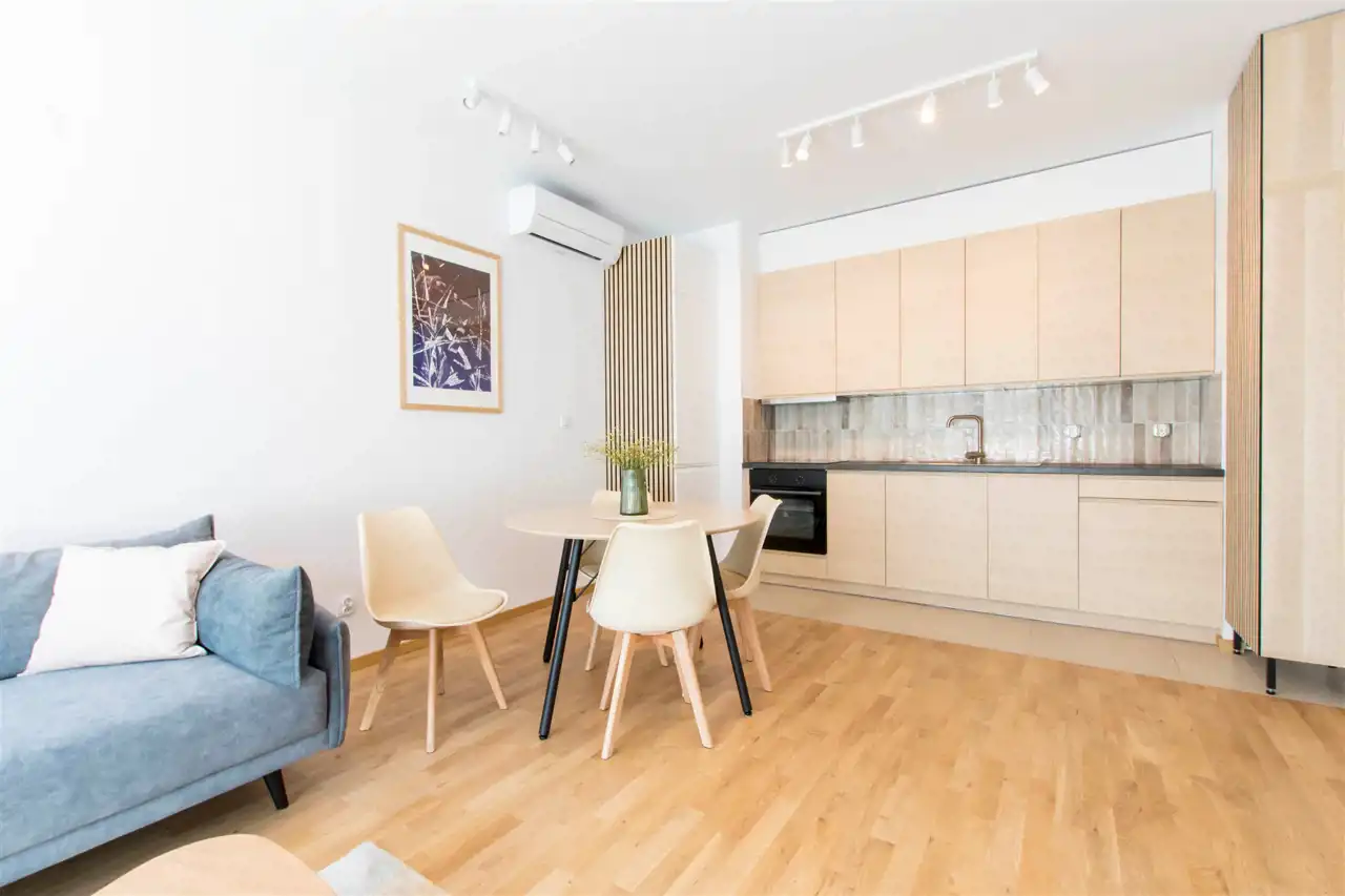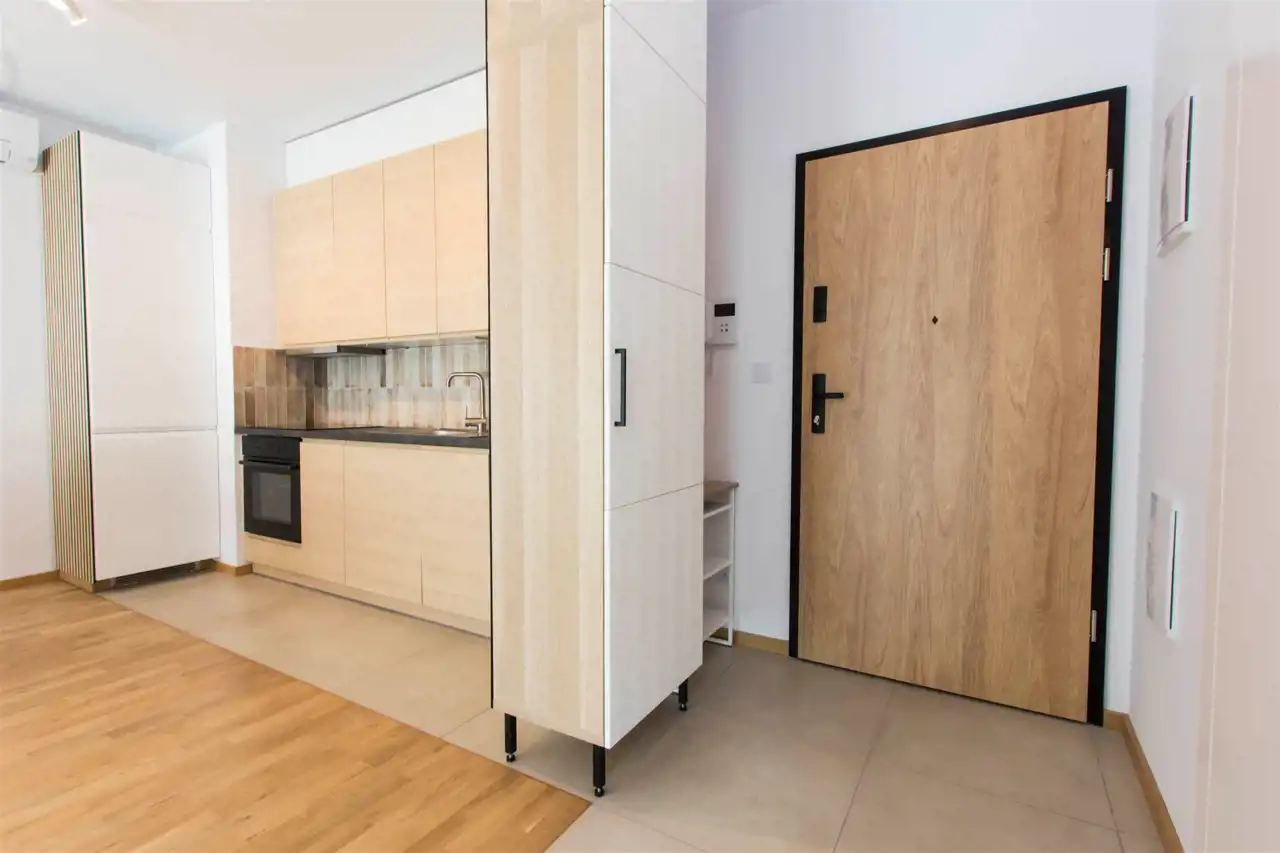 Mieszkanie jest bardzo jasne, z ekspozycją południowo-zachodnią. W salonie jest sofa, stół z krzesłami, szafka rtv, stoliki kawowe. W kuchni jest lodówko-zamrażarka, zmywarka, płyta grzewcza, piekarnik, okap, zlew. W sypialni jest łóżko dwuosobowe, komoda, szafki nocne i duża szafa. W przedpokoju również szafa oraz szafka na buty. W łazience jest prysznic, pralka, zlew, toaleta, szafki do przechowywania. Mieszkanie jest bardzo ciche.