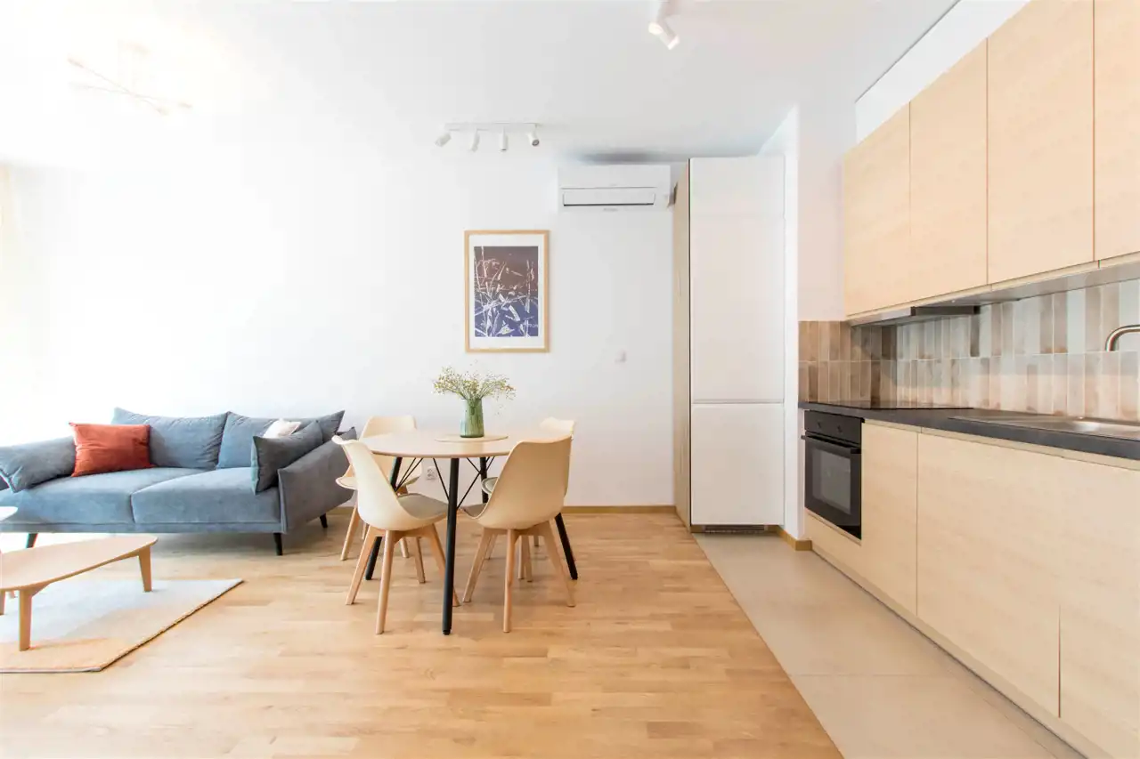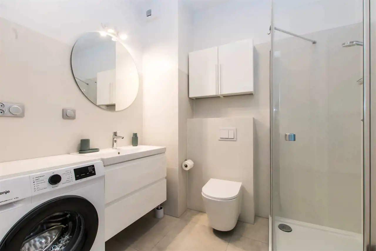 Mieszkanie jest bardzo jasne, z ekspozycją południowo-zachodnią. W salonie jest sofa, stół z krzesłami, szafka rtv, stoliki kawowe. W kuchni jest lodówko-zamrażarka, zmywarka, płyta grzewcza, piekarnik, okap, zlew. W sypialni jest łóżko dwuosobowe, komoda, szafki nocne i duża szafa. W przedpokoju również szafa oraz szafka na buty. W łazience jest prysznic, pralka, zlew, toaleta, szafki do przechowywania. Mieszkanie jest bardzo ciche.