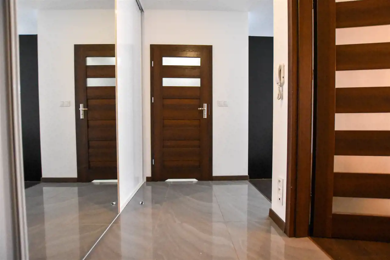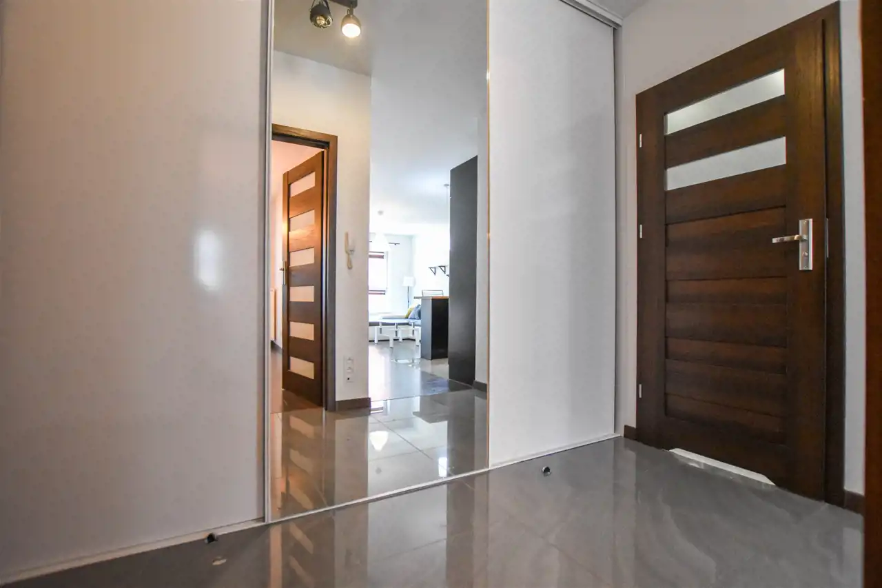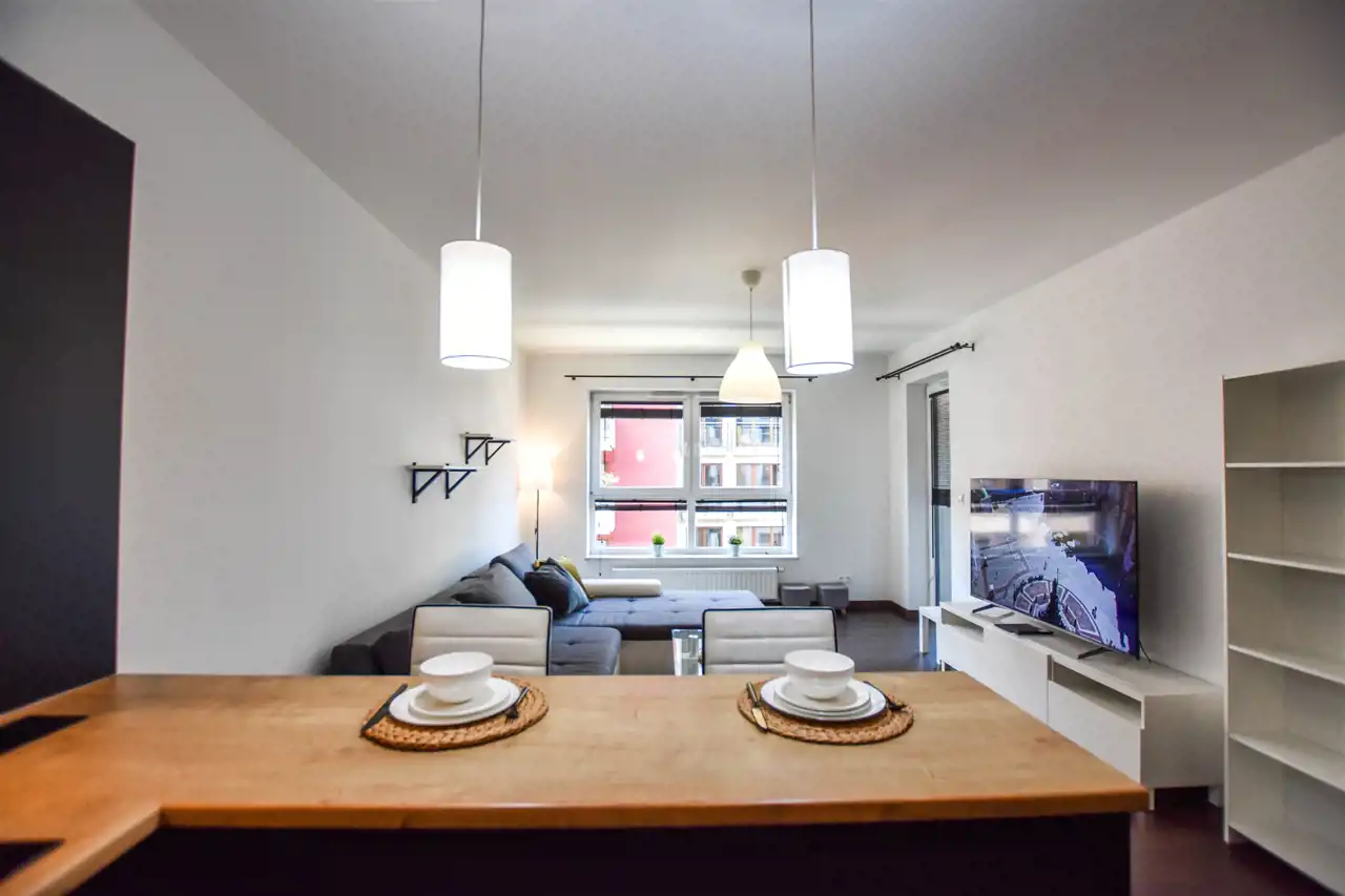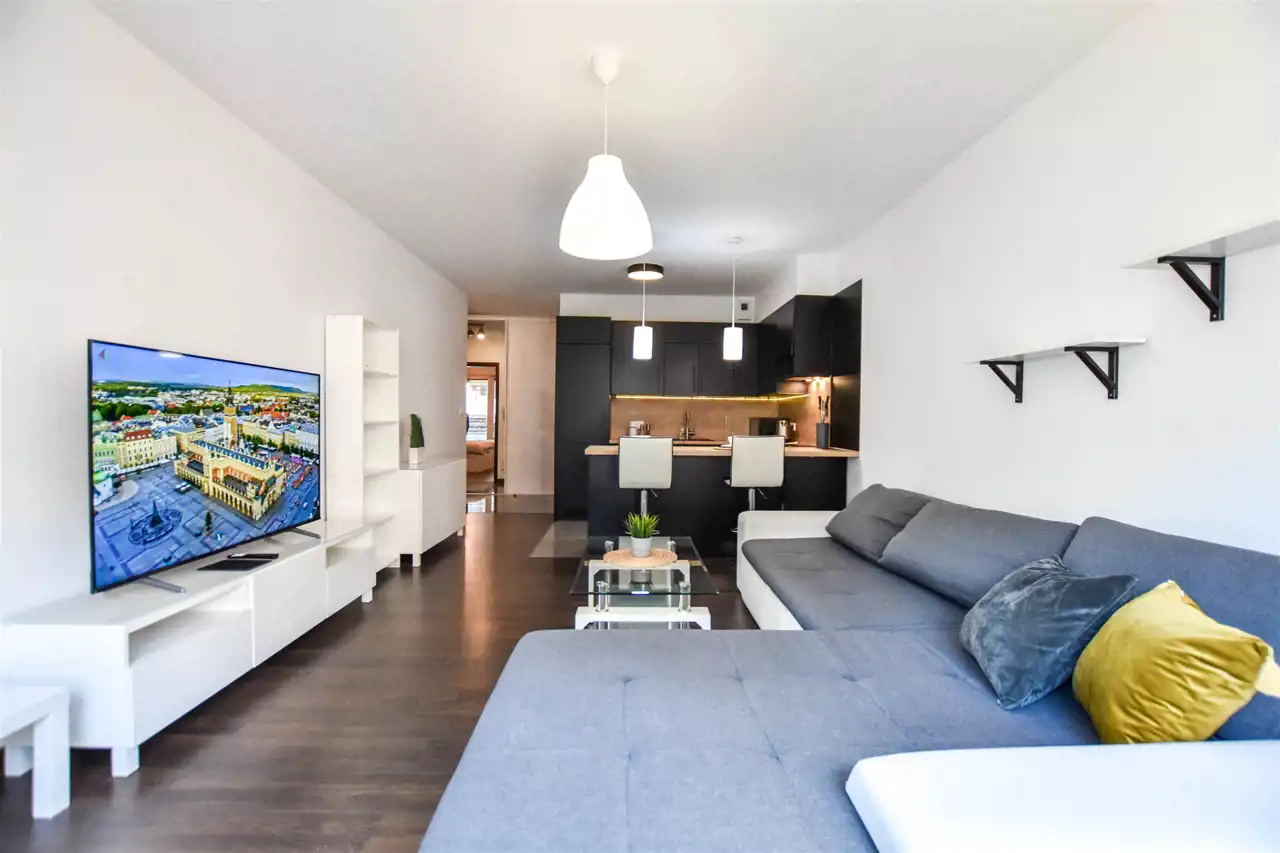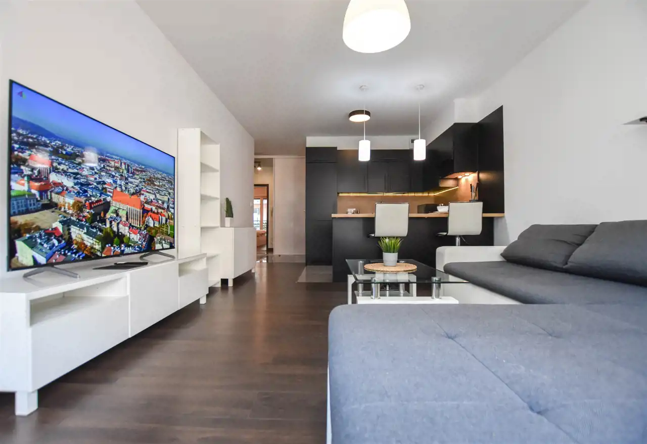 Salon jest wyposażony w duży narożnik z opcja rozłożenia oraz stolik, lampę, komodę oraz szafkę RTV z dużym Tv. W wyposażeniu kuchennym jest : lodówka, zamrażarka, piekarnik, okap, płyta oraz wyspa z hokerami jak i zabudową z dużą ilością szafek. Przestronny przedpokój jest wyposażony w bardzo dużą trzydrzwiową szafę z lustrzanymi drzwiami. Gustownie urządzona łazienka posiada umywalkę, prysznic z deszczownicą, pralkę, tv oraz zabudowę meblową z koszem na pranie. W sypialni znajduje się dwuosobowe łóżko z materacem, biurko z krzesłem do pracy, stoliki nocne oraz szafa. Zarówno z salonu jak i z sypialni jest wyjście na zabudowany balkon. Mieszkanie jest w pełni wyposażone i umeblowane, gotowe do zamieszkania.