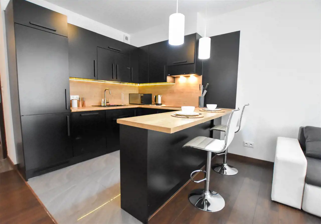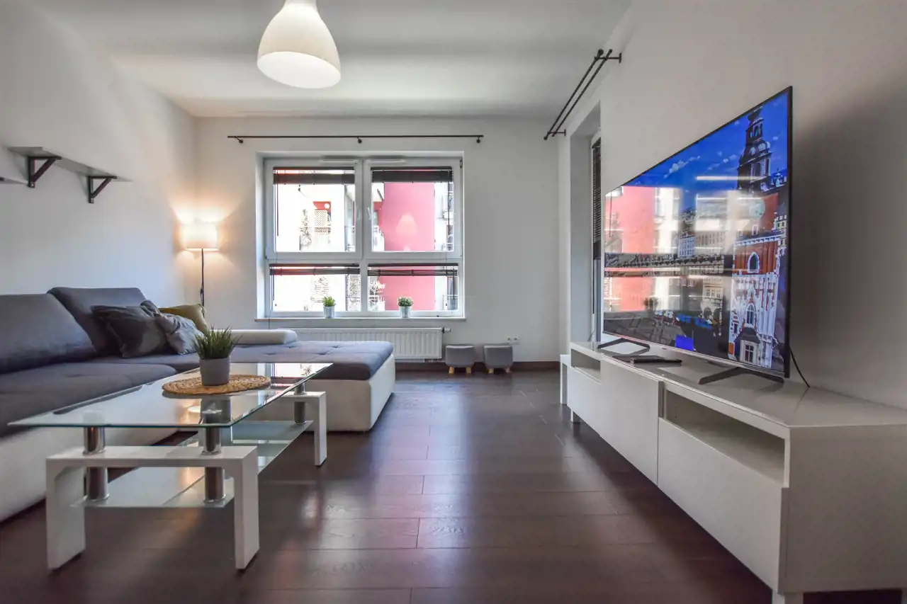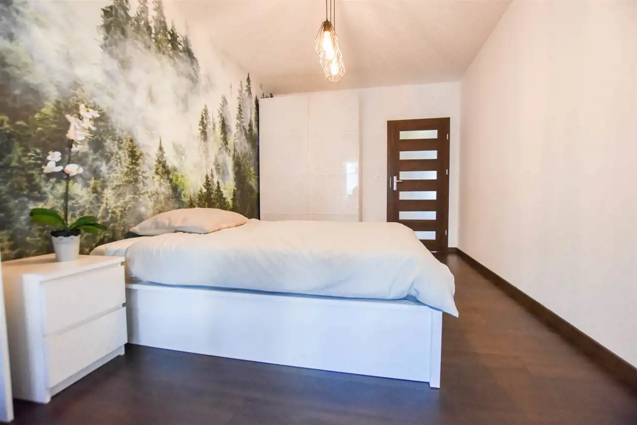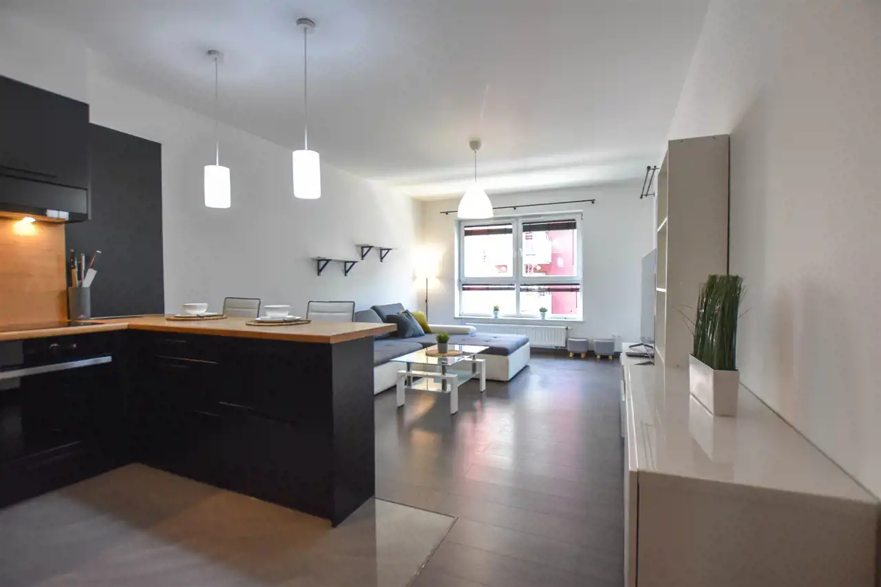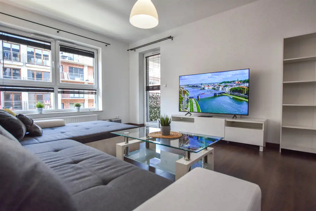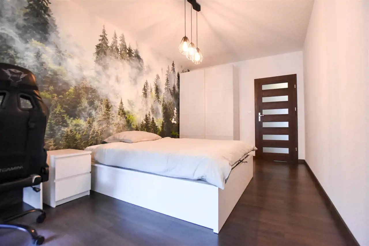 Salon jest wyposażony w duży narożnik z opcja rozłożenia oraz stolik, lampę, komodę oraz szafkę RTV z dużym Tv. W wyposażeniu kuchennym jest : lodówka, zamrażarka, piekarnik, okap, płyta oraz wyspa z hokerami jak i zabudową z dużą ilością szafek. Przestronny przedpokój jest wyposażony w bardzo dużą trzydrzwiową szafę z lustrzanymi drzwiami. Gustownie urządzona łazienka posiada umywalkę, prysznic z deszczownicą, pralkę, tv oraz zabudowę meblową z koszem na pranie. W sypialni znajduje się dwuosobowe łóżko z materacem, biurko z krzesłem do pracy, stoliki nocne oraz szafa. Zarówno z salonu jak i z sypialni jest wyjście na zabudowany balkon. Mieszkanie jest w pełni wyposażone i umeblowane, gotowe do zamieszkania.