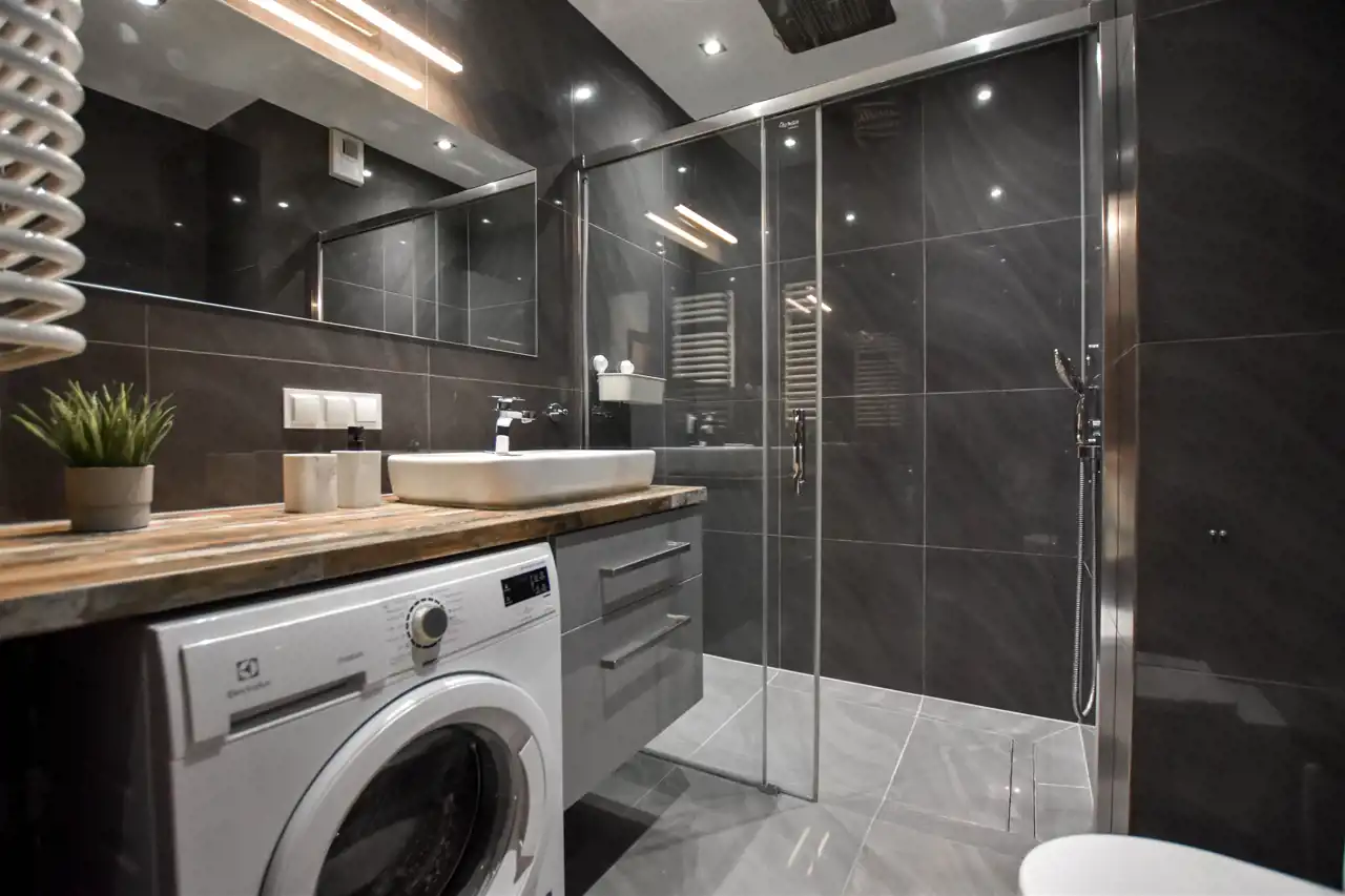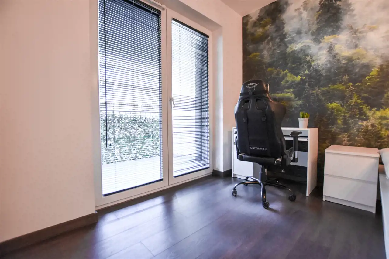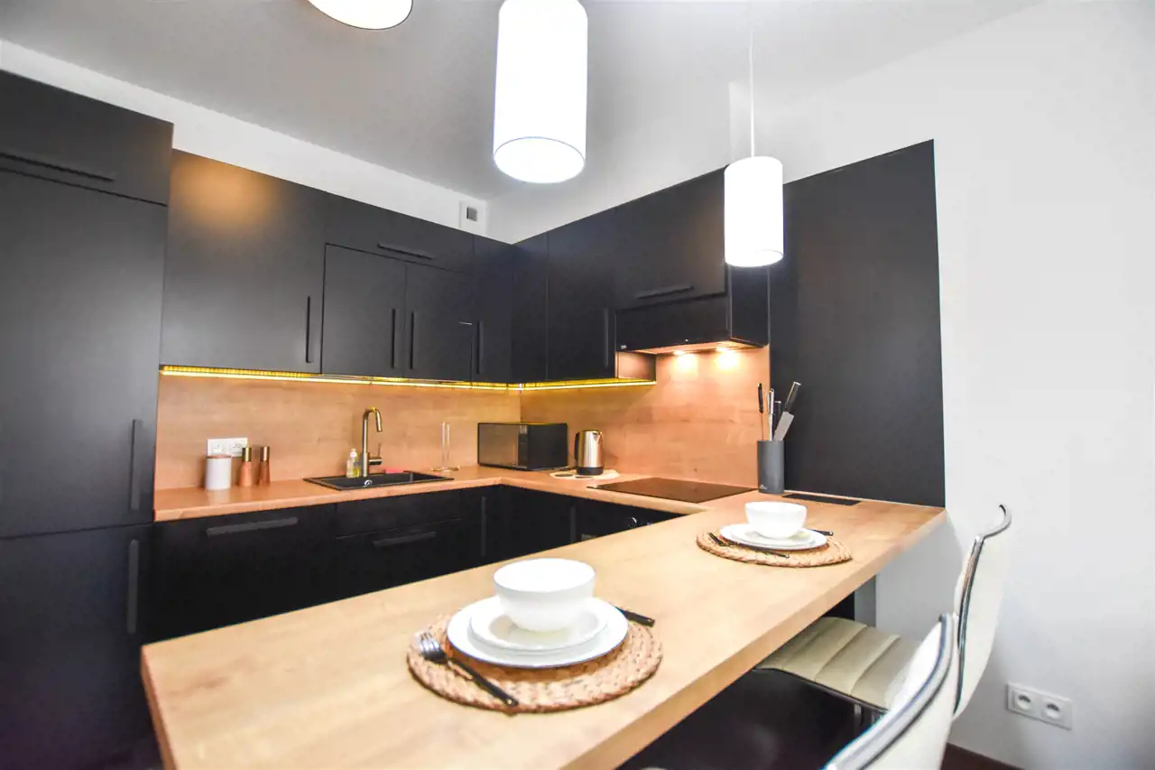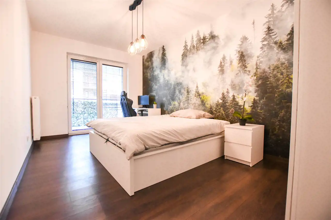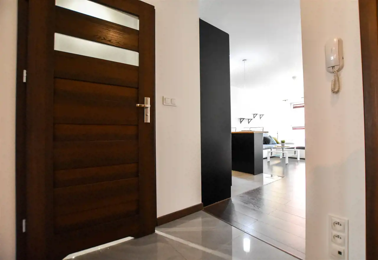 Salon jest wyposażony w duży narożnik z opcja rozłożenia oraz stolik, lampę, komodę oraz szafkę RTV z dużym Tv. W wyposażeniu kuchennym jest : lodówka, zamrażarka, piekarnik, okap, płyta oraz wyspa z hokerami jak i zabudową z dużą ilością szafek. Przestronny przedpokój jest wyposażony w bardzo dużą trzydrzwiową szafę z lustrzanymi drzwiami. Gustownie urządzona łazienka posiada umywalkę, prysznic z deszczownicą, pralkę, tv oraz zabudowę meblową z koszem na pranie. W sypialni znajduje się dwuosobowe łóżko z materacem, biurko z krzesłem do pracy, stoliki nocne oraz szafa. Zarówno z salonu jak i z sypialni jest wyjście na zabudowany balkon. Mieszkanie jest w pełni wyposażone i umeblowane, gotowe do zamieszkania.