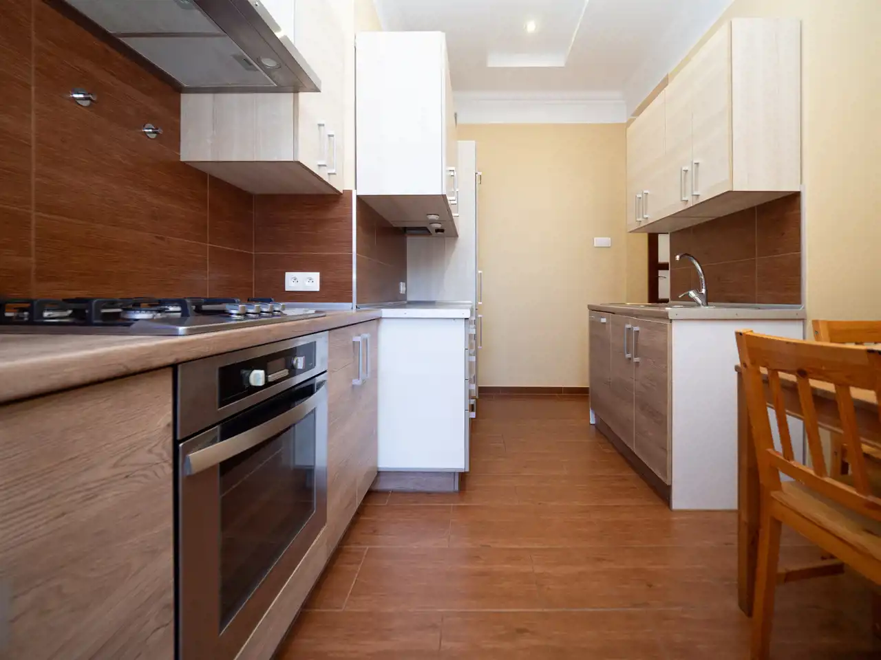 The rooms will be furnished. In the kitchen, bathroom, and hall there is underfloor water heating, and the apartment is heated by a dual-function gas furnace.