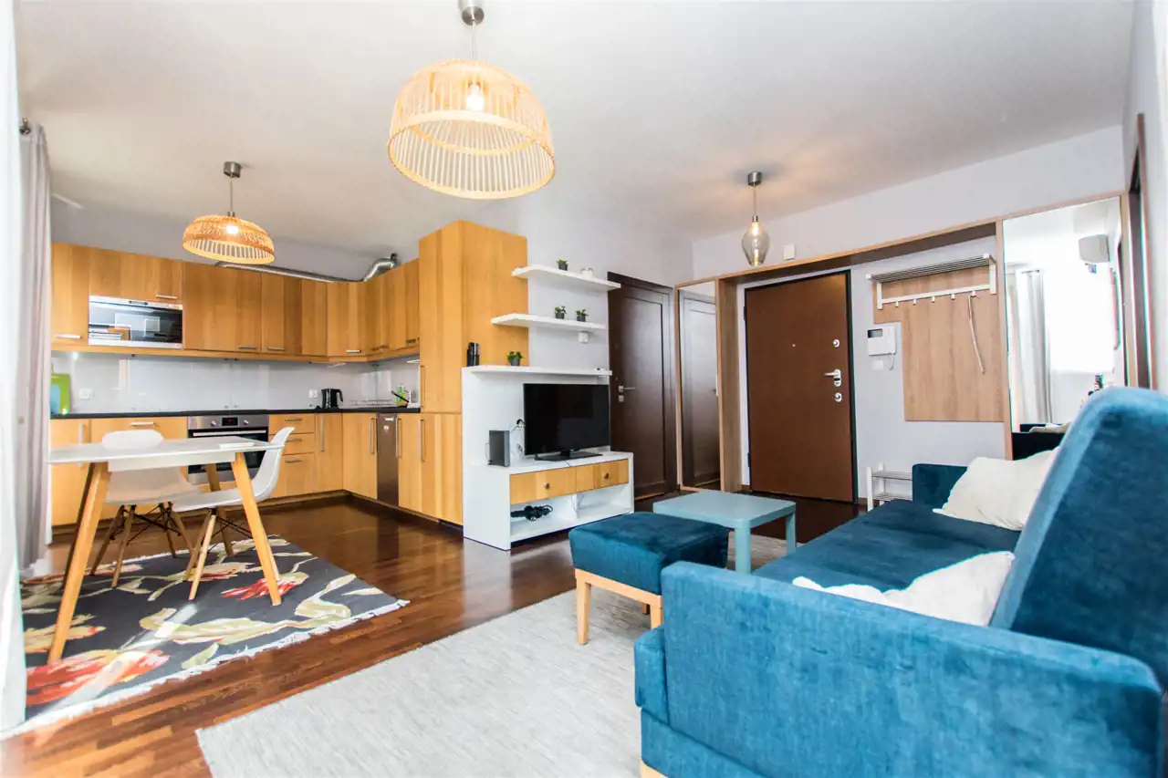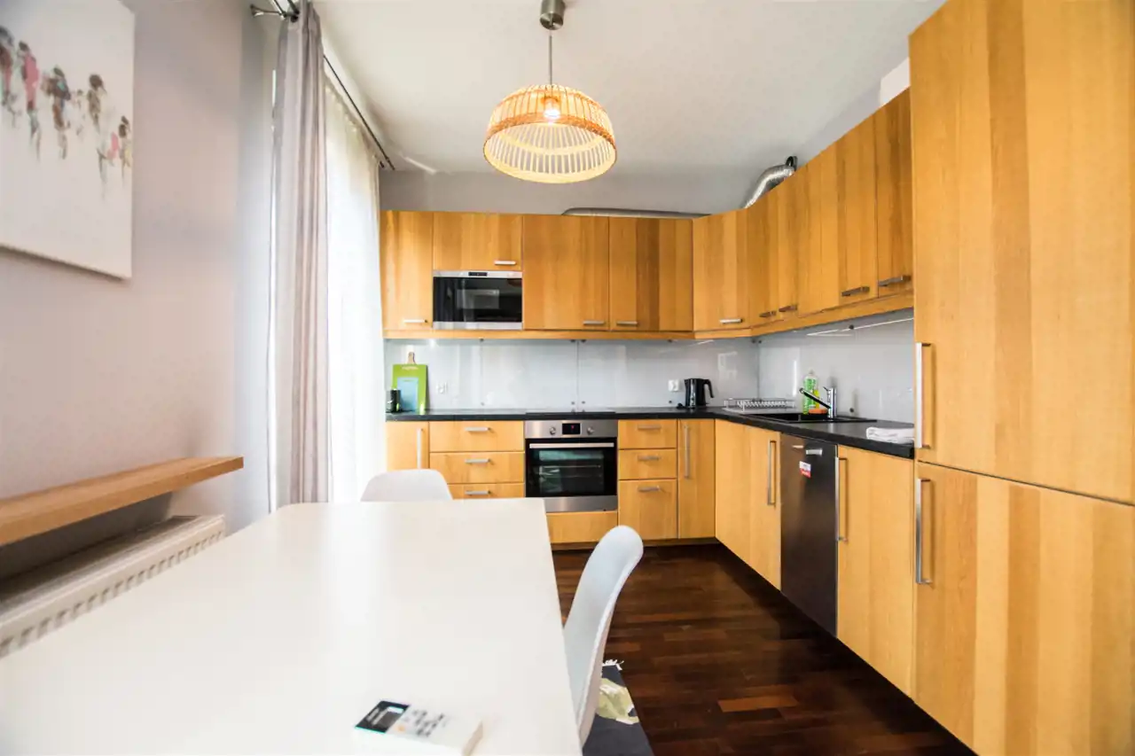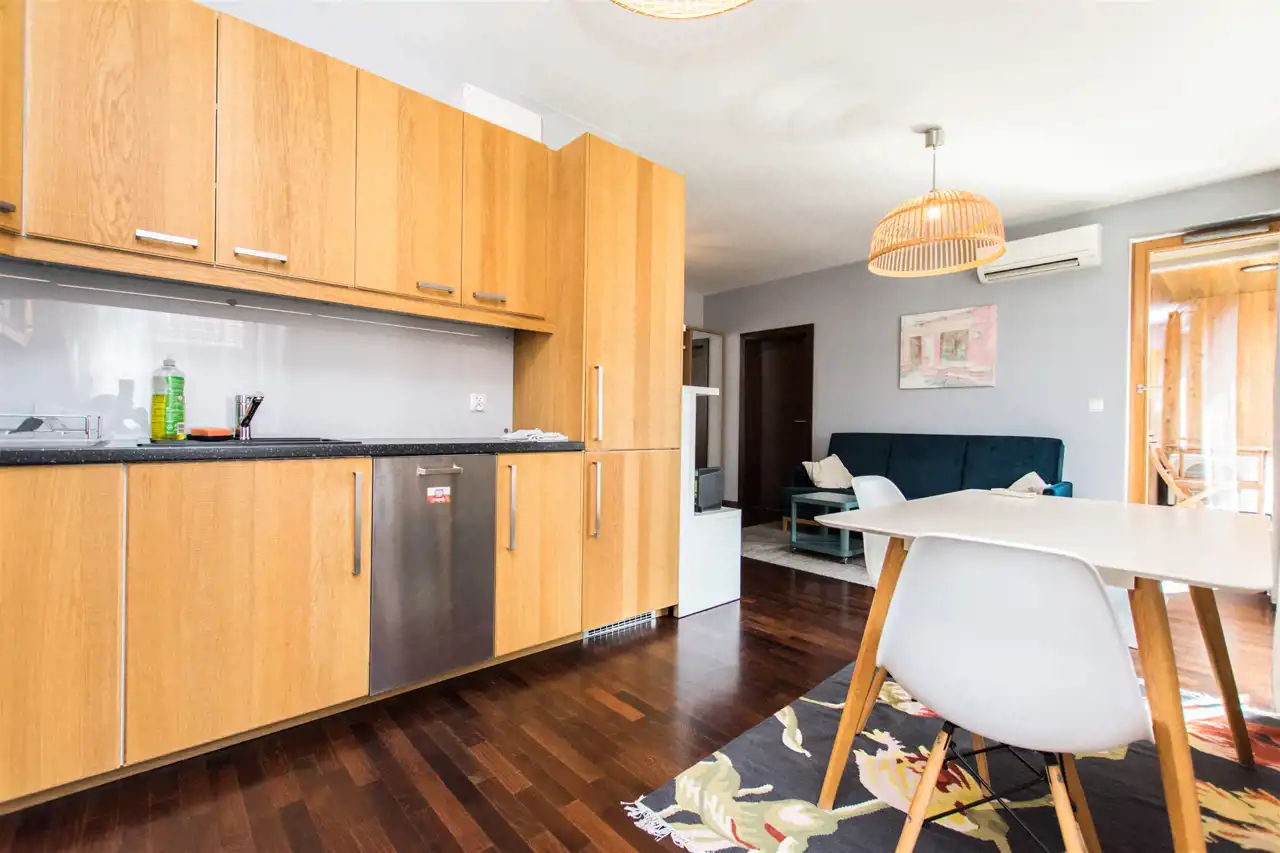 Apartament o powierzchni ok 44 m2 znajduje się na 1 piętrze. Nowocześnie wykończony i wyposażony. W jednej z sypialni podwójne łóżko i szafy. Łazienka z nowoczesną kabiną prysznicową. Salon przestronny, jasny z wyjściem na balkon. Stół jadalniany z krzesłami i w pełni wyposażony aneks kuchenny. Meble kuchenne w wysokim standardzie (lodówka z zamrażalnikiem, płyta indukcyjna, piekarnik, zmywarka, mikrofalówka).