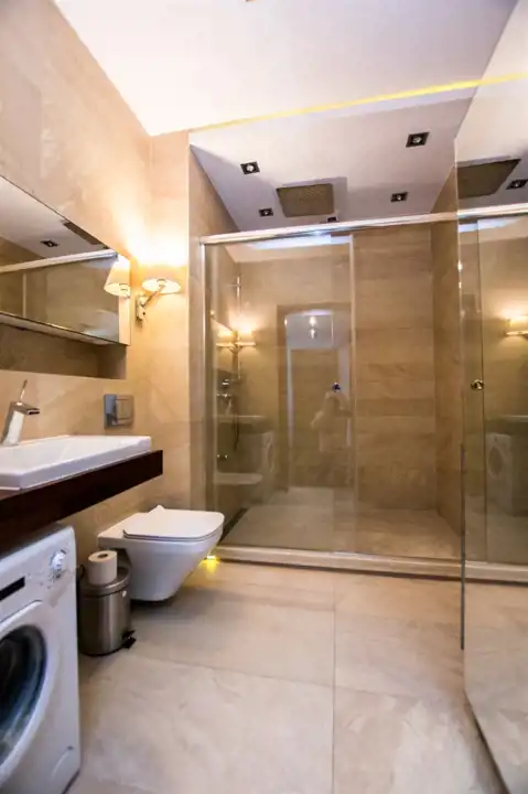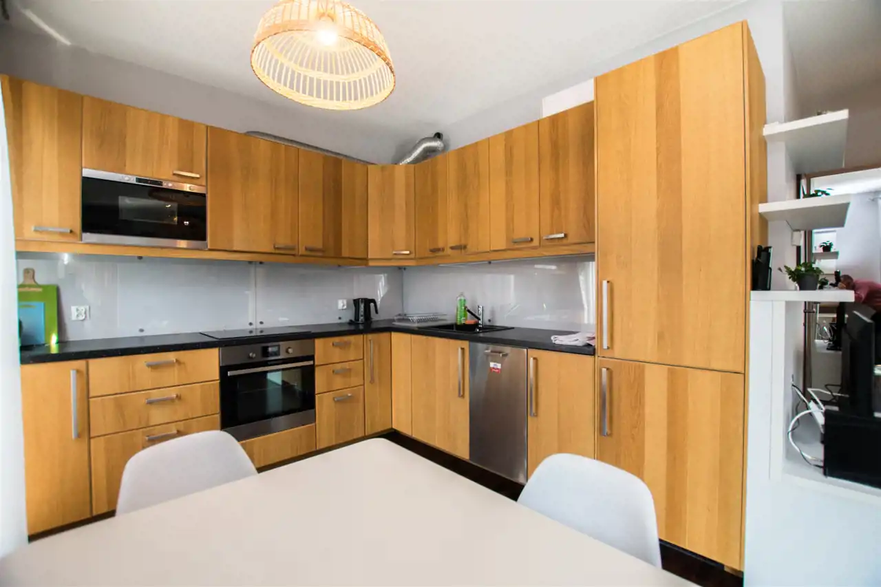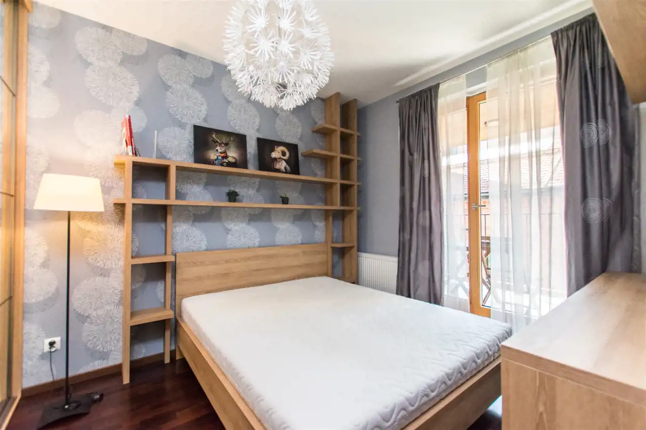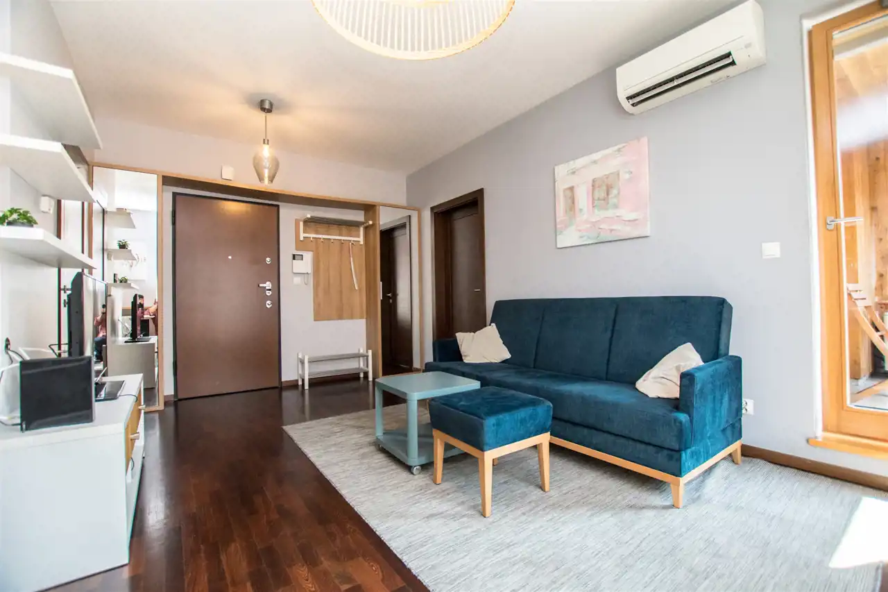 Apartament o powierzchni ok 44 m2 znajduje się na 1 piętrze. Nowocześnie wykończony i wyposażony. W jednej z sypialni podwójne łóżko i szafy. Łazienka z nowoczesną kabiną prysznicową. Salon przestronny, jasny z wyjściem na balkon. Stół jadalniany z krzesłami i w pełni wyposażony aneks kuchenny. Meble kuchenne w wysokim standardzie (lodówka z zamrażalnikiem, płyta indukcyjna, piekarnik, zmywarka, mikrofalówka).