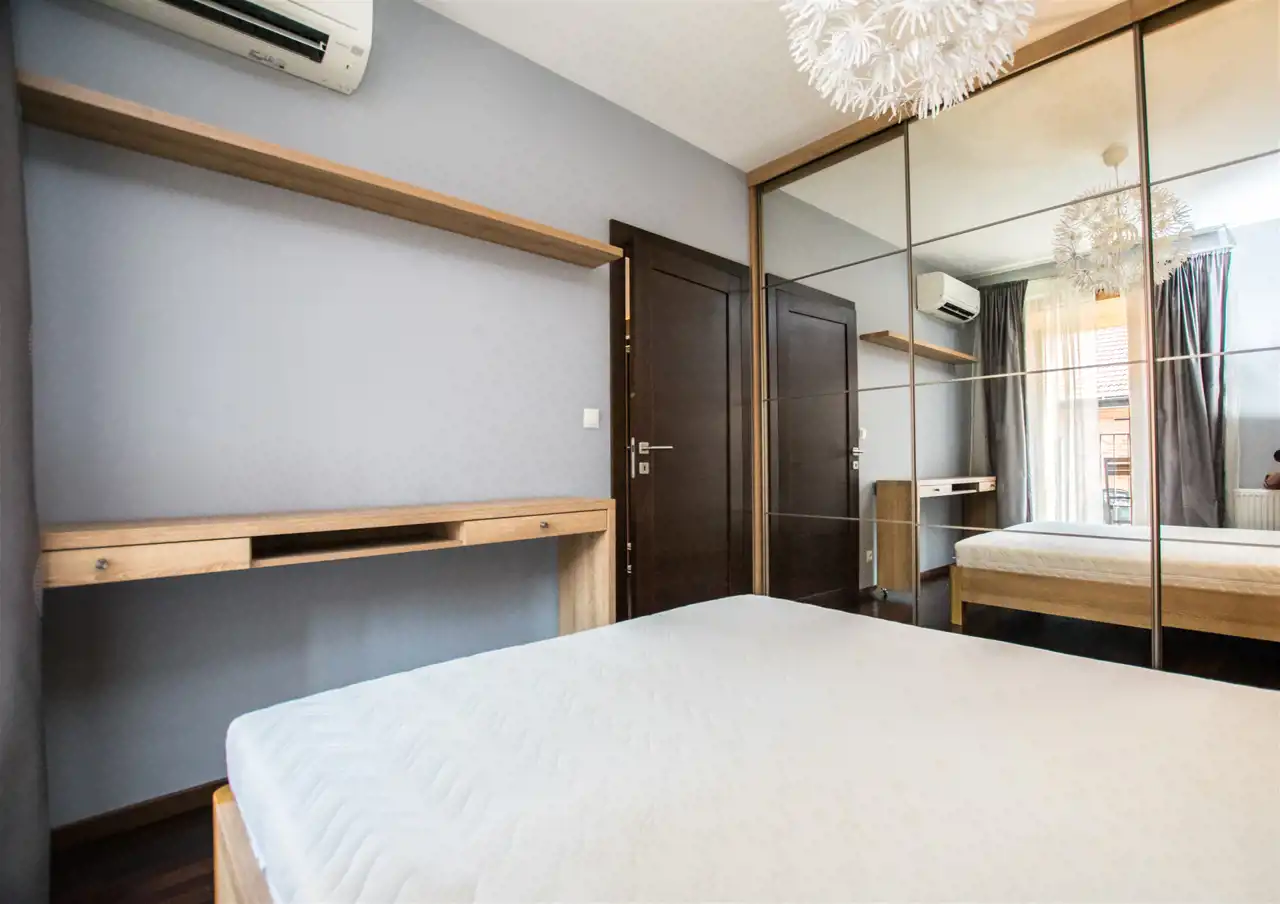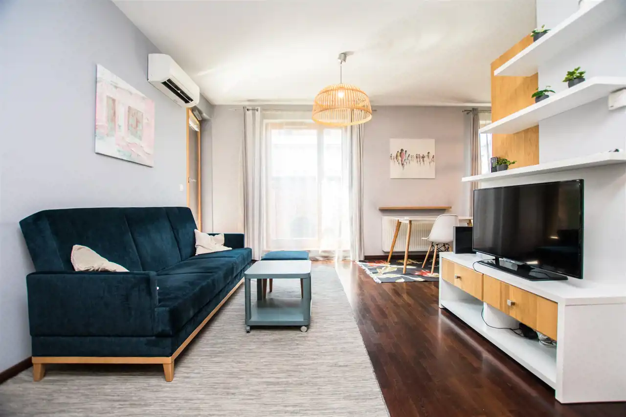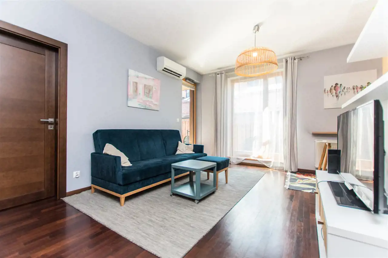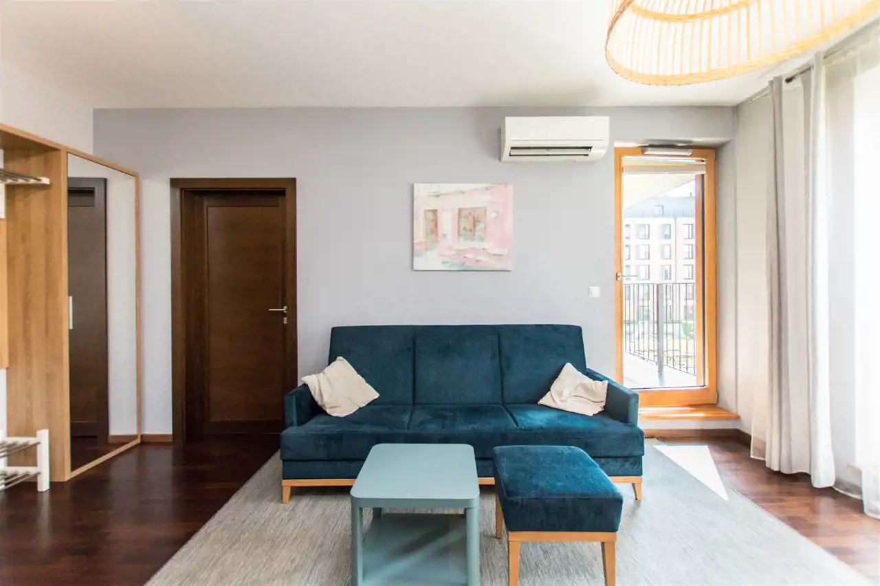 Mieszkanie dwustronne. Jasne i ciche. Dodatkowo w mieszkaniu jest zainstalowana klimatyzacja w salonie oraz sypialni.