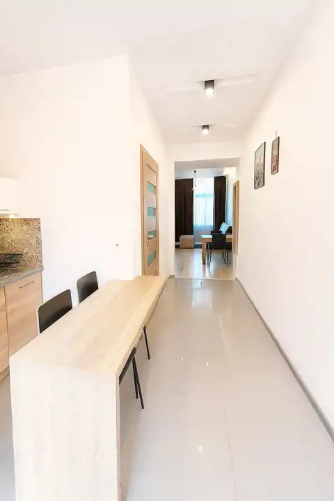 Układ pomieszczeń obejmuje dwa niezależne pokoje: salon z aneksem kuchennym oraz oddzielną, komfortową sypialnię. Przestrzeń dzienna została zaprojektowana w sposób praktyczny i wygodny, umożliwiając zarówno relaks, jak i pracę zdalną czy spotkania towarzyskie. Kuchnia jest funkcjonalna i dobrze zorganizowana, co pozwala na wygodne przygotowywanie posiłków.