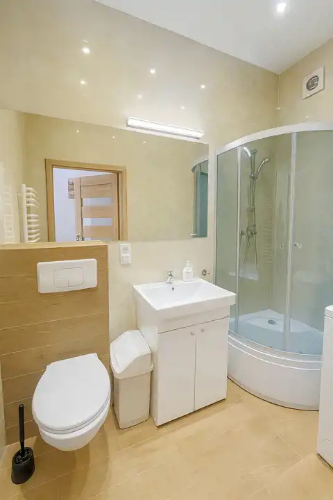 Łazienka wyposażona jest w prysznic, jest obszerna i estetycznie wykończona, zapewniając wysoki komfort użytkowania.