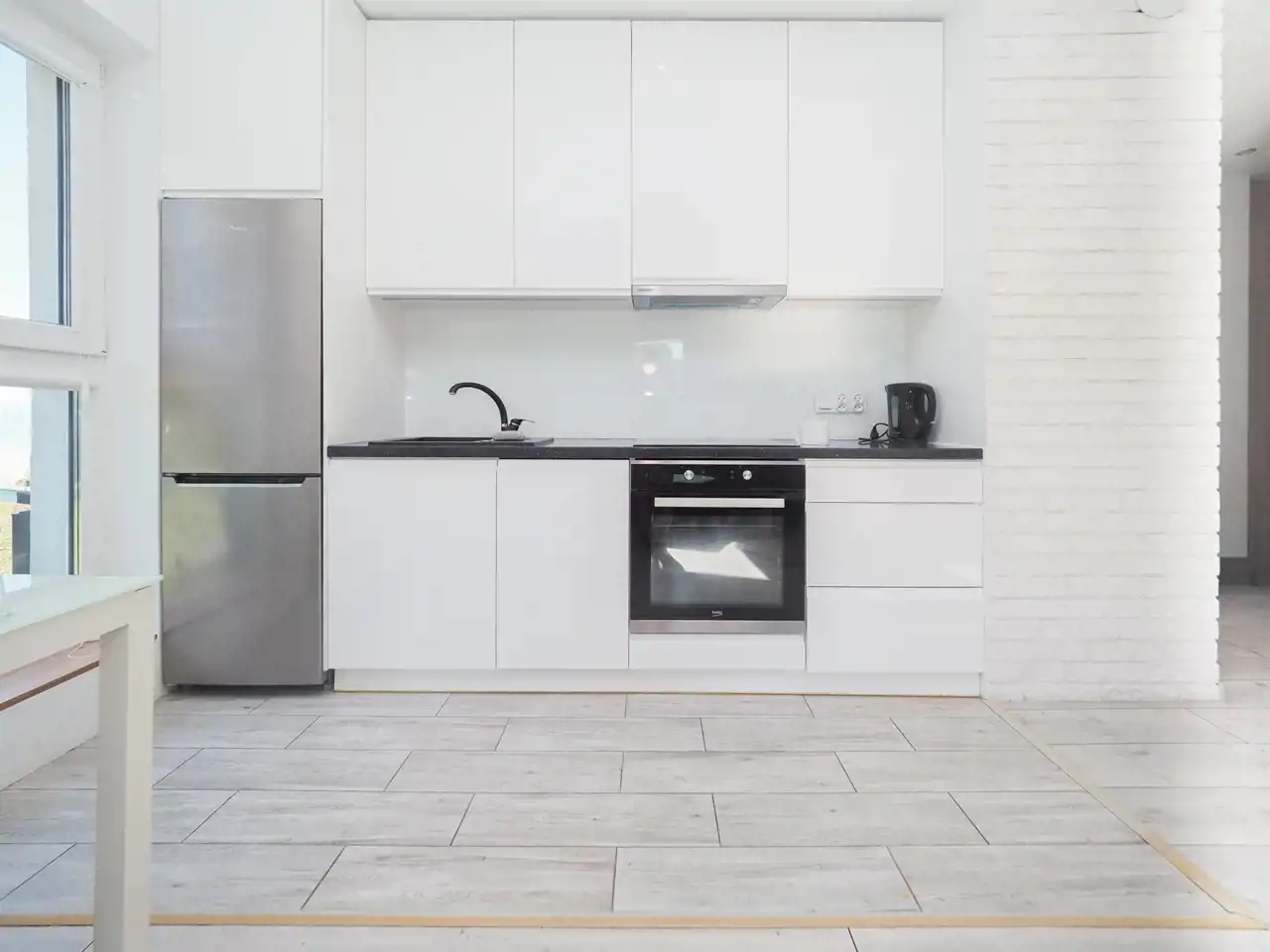 - salon z aneksem kuchennym (lodówka, piekarnik, zmywarka, płyta indukcyjna),