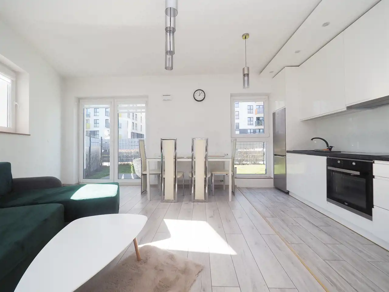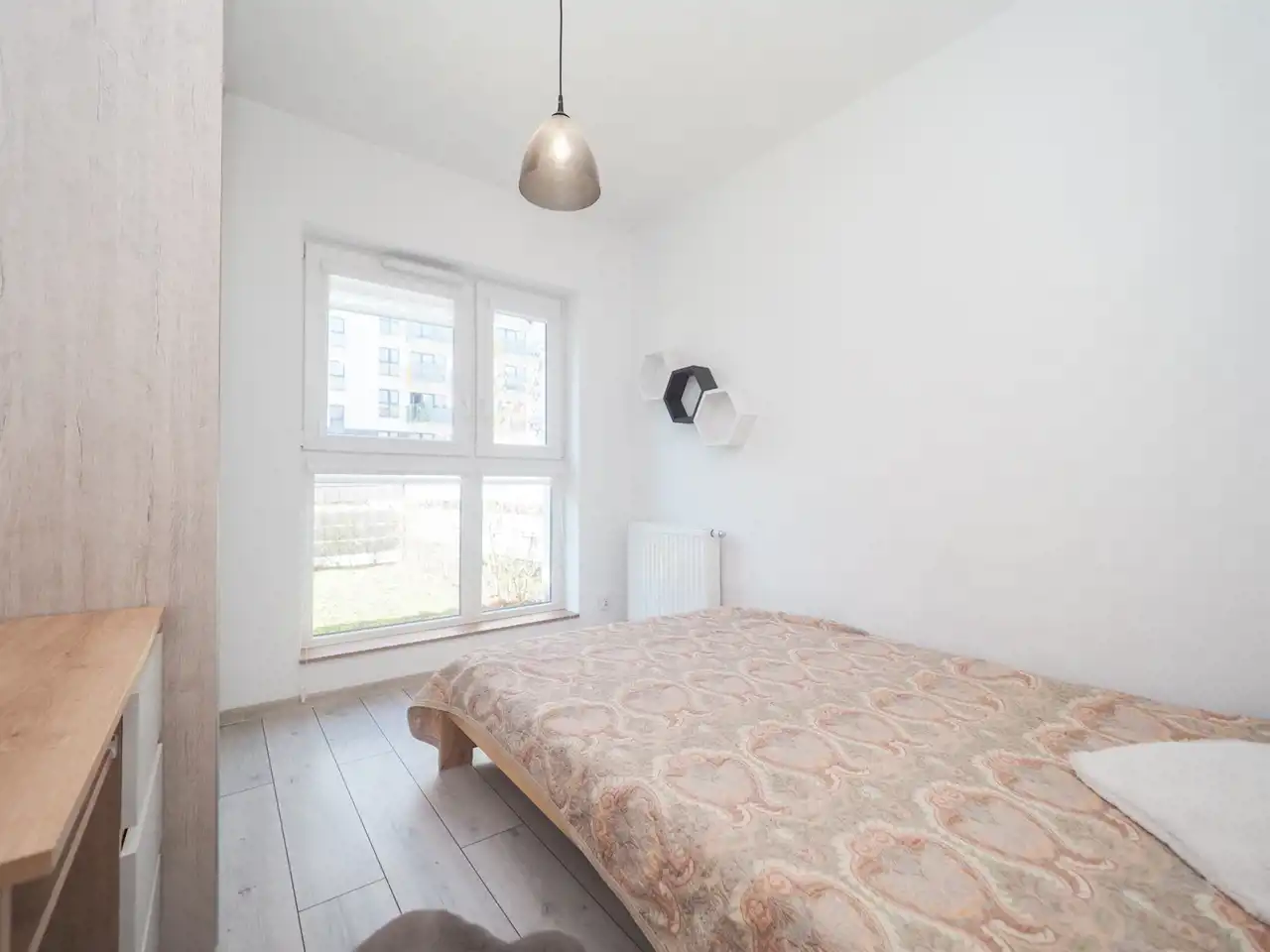 Located on the ground floor, the apartment is fully furnished and equipped, finished to a good standard, and ready to move in. An assigned outdoor parking space is available under the building for 150 PLN/month.