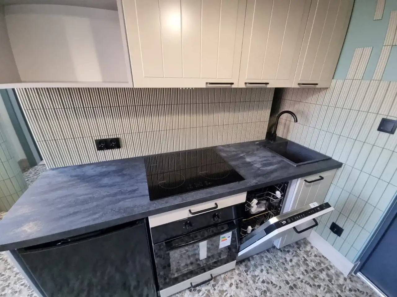 - Pełne wyposażenie: W kuchni znajduje się zmywarka, piekarnik, lodówka oraz pralka. Łazienka wyposażona w wygodną kabinę prysznicową.