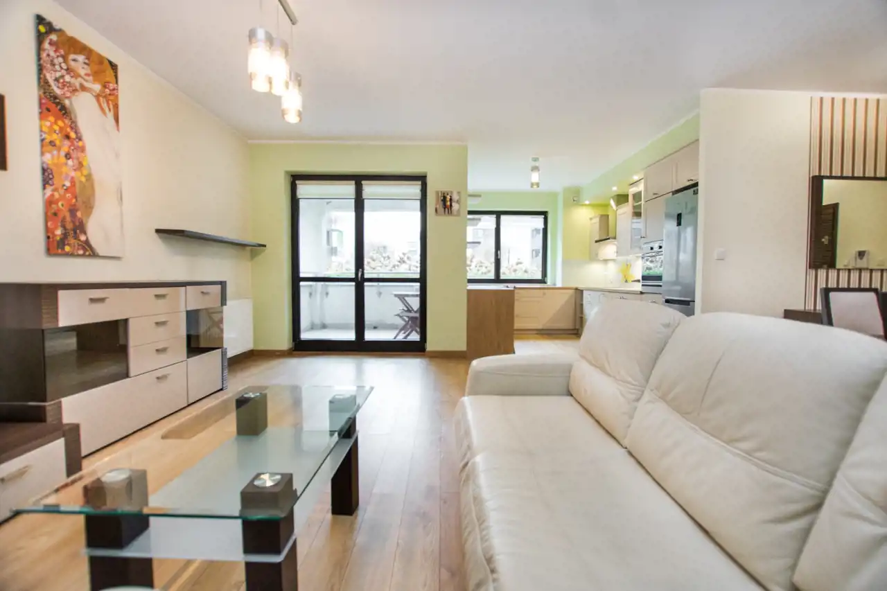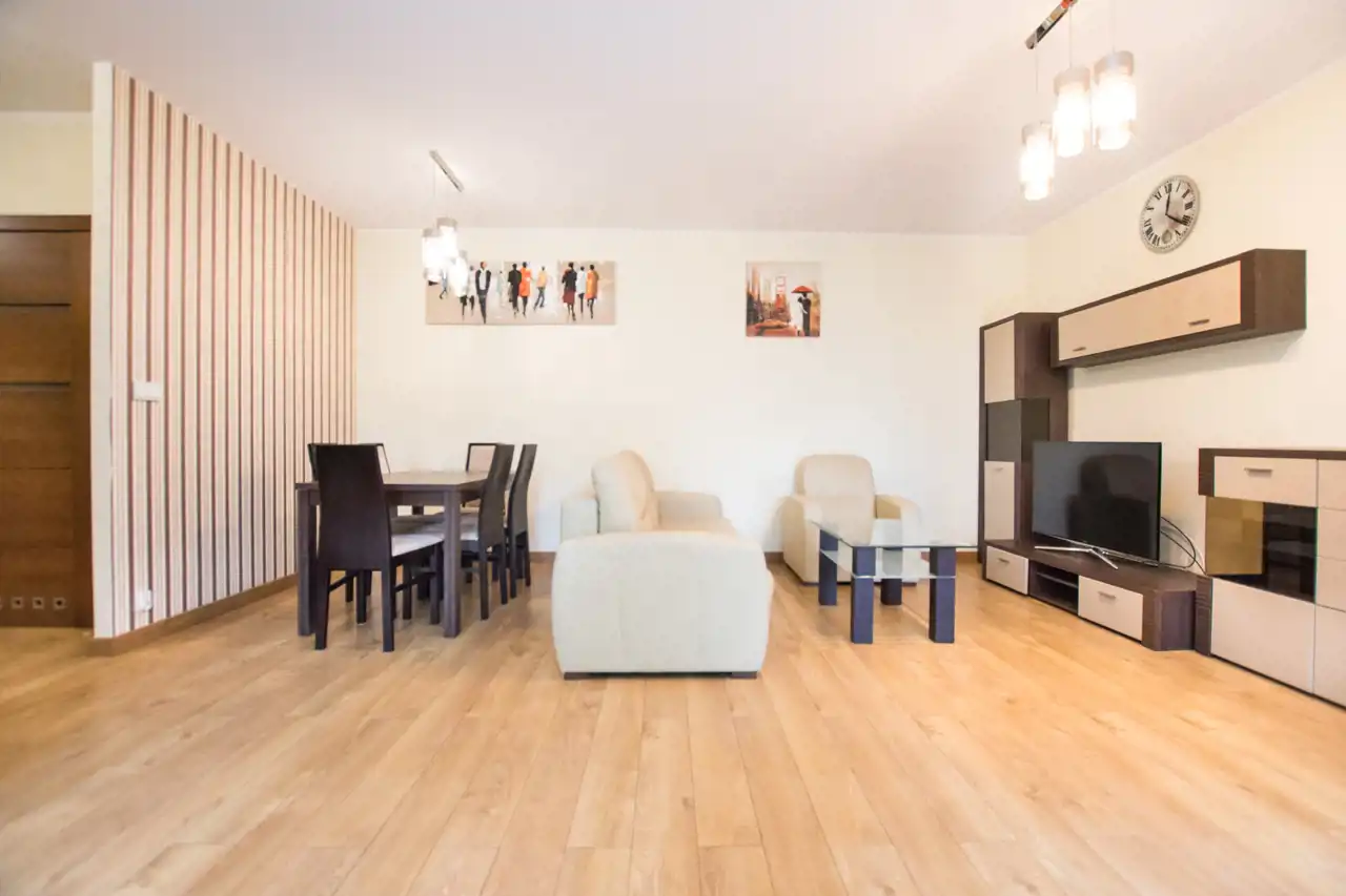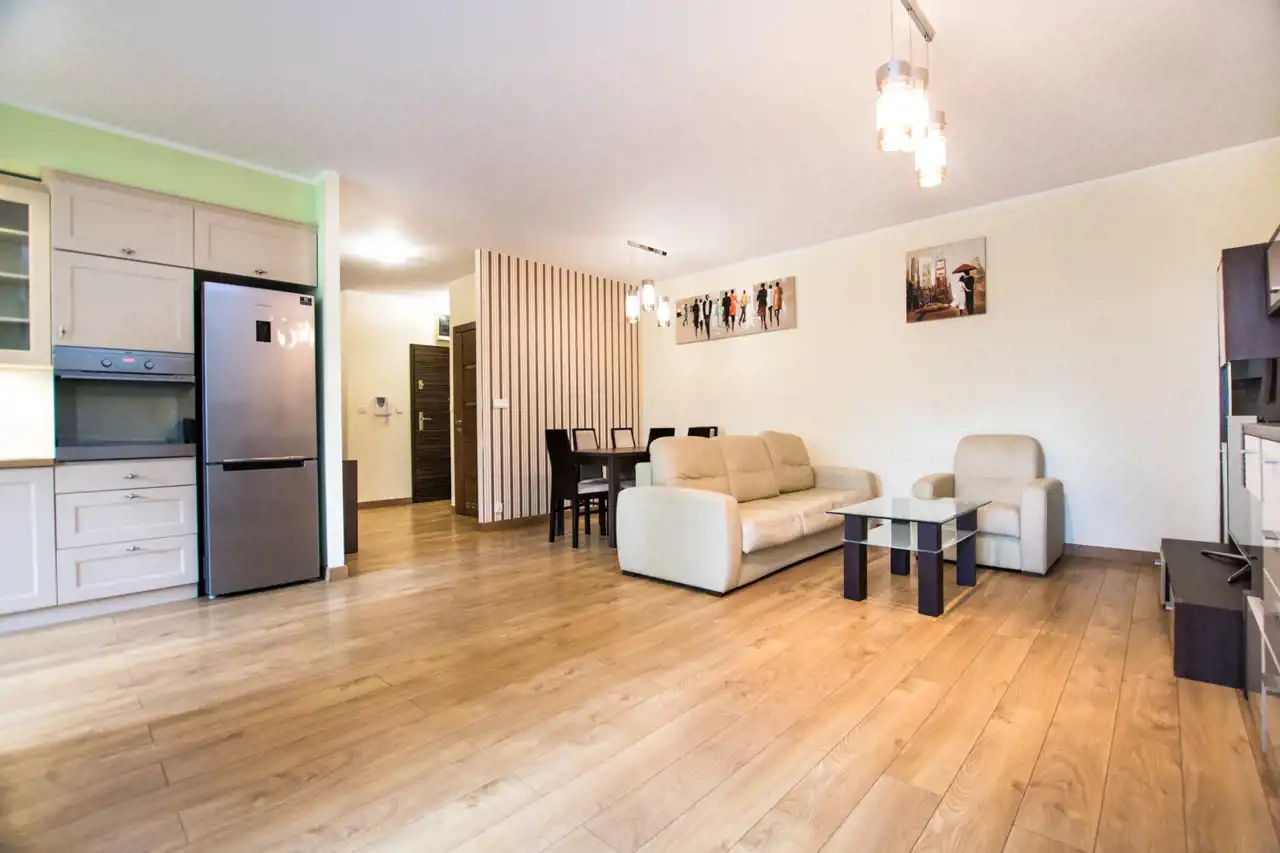 Salon wyposażony dużą sofę, Telewizor, zabudowę szaf, stół z krzesłami oraz wyjście na balkon. Kuchnia wyposażona w zabudowę kuchenną z dużą ilością miejsca do przechowywania, sprzęty takie jak lodówko-zamrażarka, piekarnik, zmywarka, płyta indukcyjna, okap. Całe pomieszczenie jasne i przestronne. Sypialnia wyposażona w duże 2-osobowe łóżko szafki nocne oraz szafę. Łazienka z kabiną prysznicową wyposażona w umywalkę z szafką, duże lustro oraz WC. Pokój jest nieumeblowany - do własnej aranżacji. W przedpokoju komoda. Dużym atutem mieszkania jest garderoba.