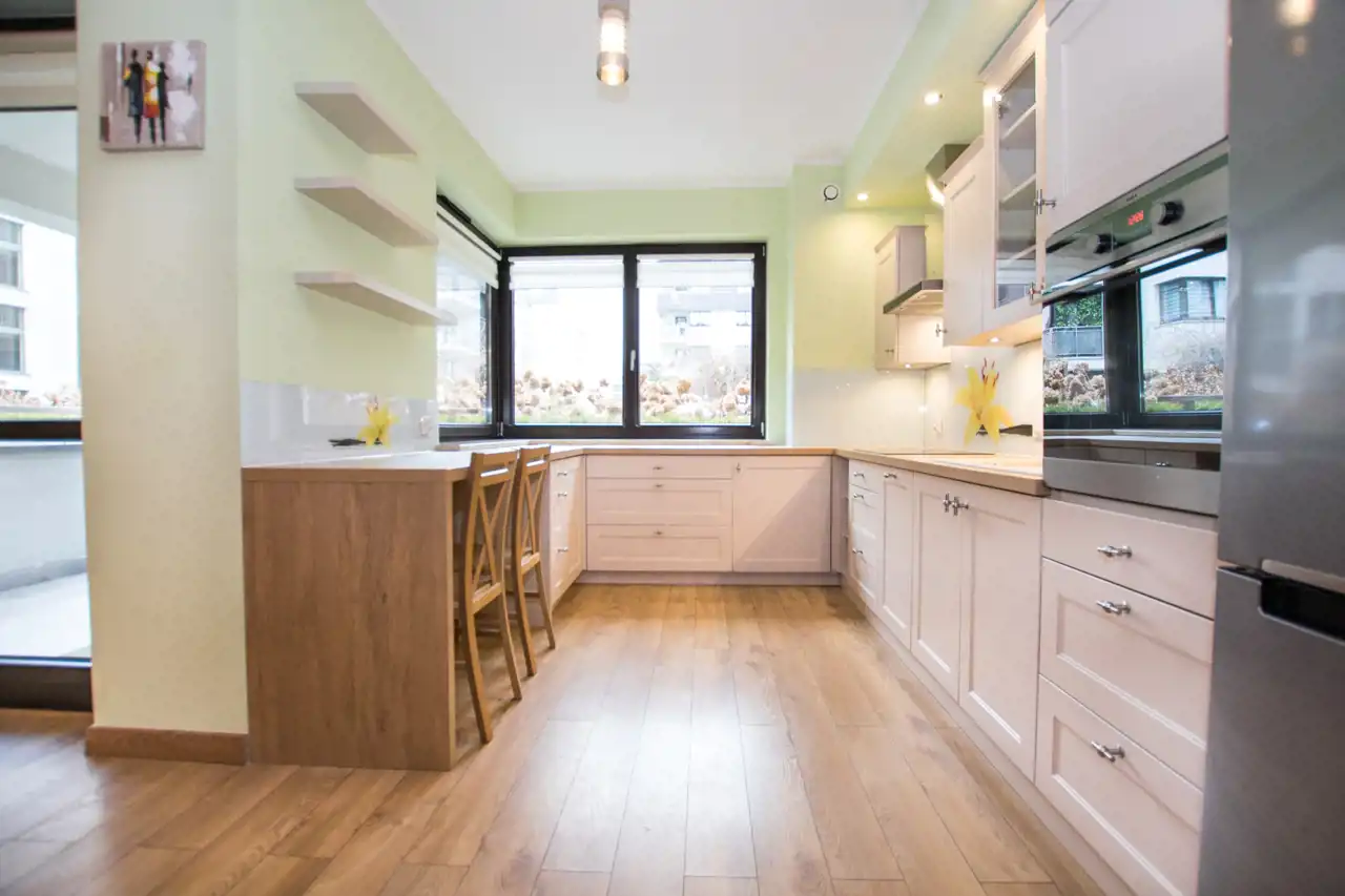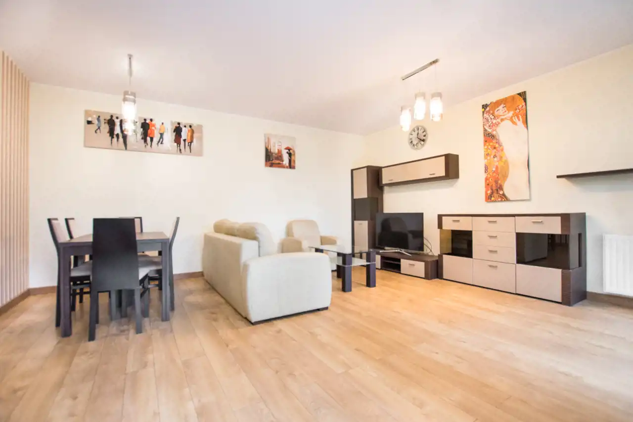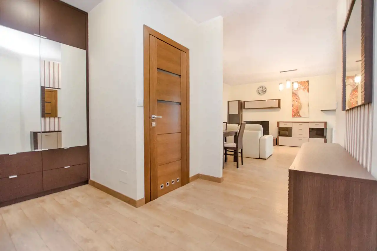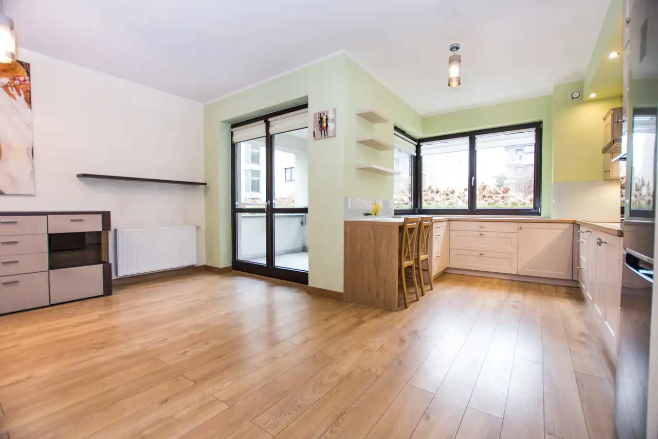 Salon wyposażony dużą sofę, Telewizor, zabudowę szaf, stół z krzesłami oraz wyjście na balkon. Kuchnia wyposażona w zabudowę kuchenną z dużą ilością miejsca do przechowywania, sprzęty takie jak lodówko-zamrażarka, piekarnik, zmywarka, płyta indukcyjna, okap. Całe pomieszczenie jasne i przestronne. Sypialnia wyposażona w duże 2-osobowe łóżko szafki nocne oraz szafę. Łazienka z kabiną prysznicową wyposażona w umywalkę z szafką, duże lustro oraz WC. Pokój jest nieumeblowany - do własnej aranżacji. W przedpokoju komoda. Dużym atutem mieszkania jest garderoba.