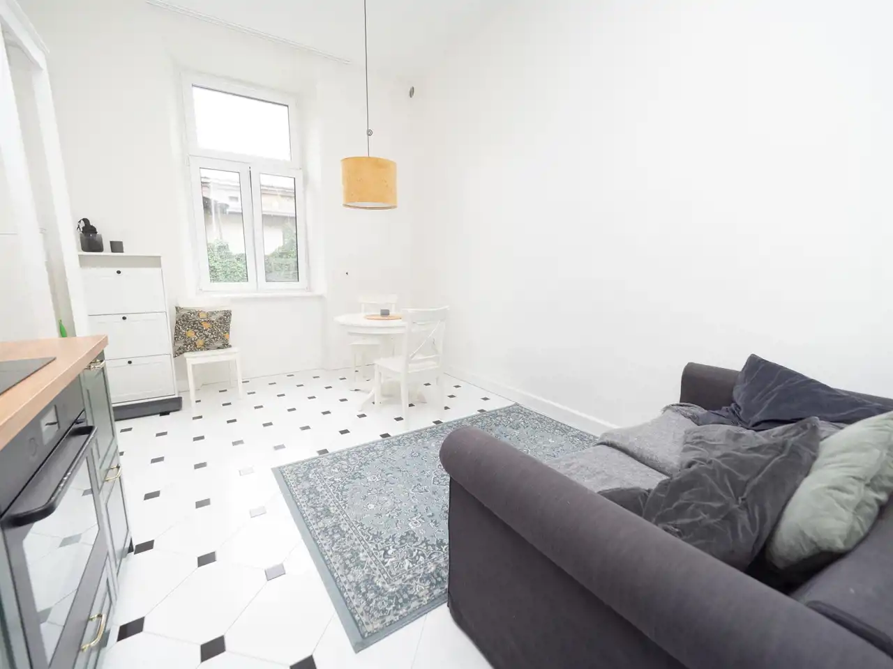 - salon z aneksem kuchennym (zmywarka, piekarnik, płyta, lodówko - zamrażarka, meble w zabudowie)