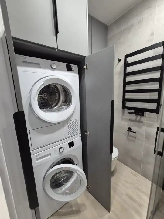 Sypialnia ma swoje osobne wyjście na balkon. Przedpokój zabudowany szafami, które doskonale komponują się z wnętrzem, tworząc bardzo funkcjonalne przestrzenie. Łazienka połączona wc, wyposażona we wbudowaną pralkę oraz suszarkę do prania.