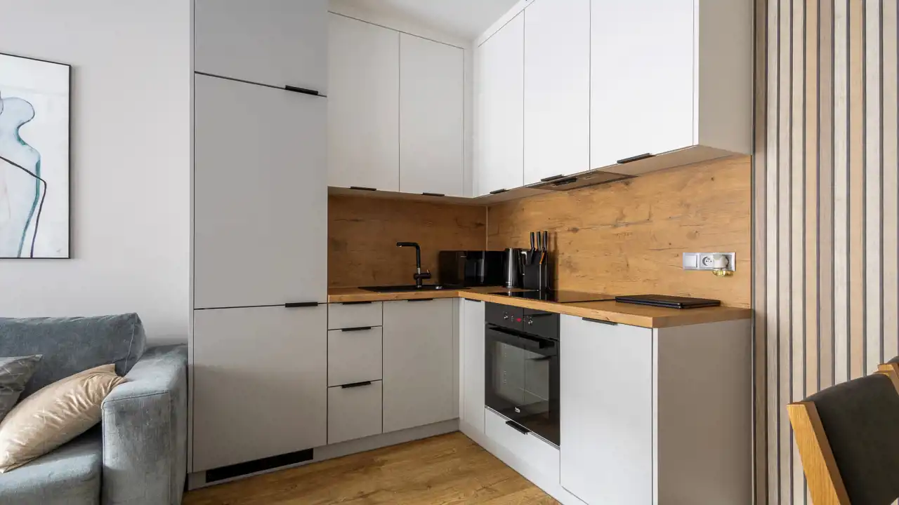 -kompaktowa kuchnia wyposażona w zmywarkę, piekarnik, płytę, mikrofalę, okap oraz lodówkę z zamrażalnikiem,