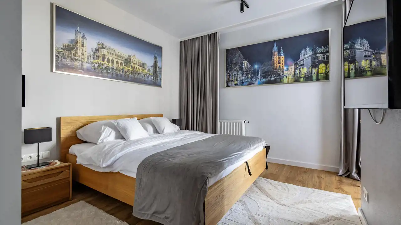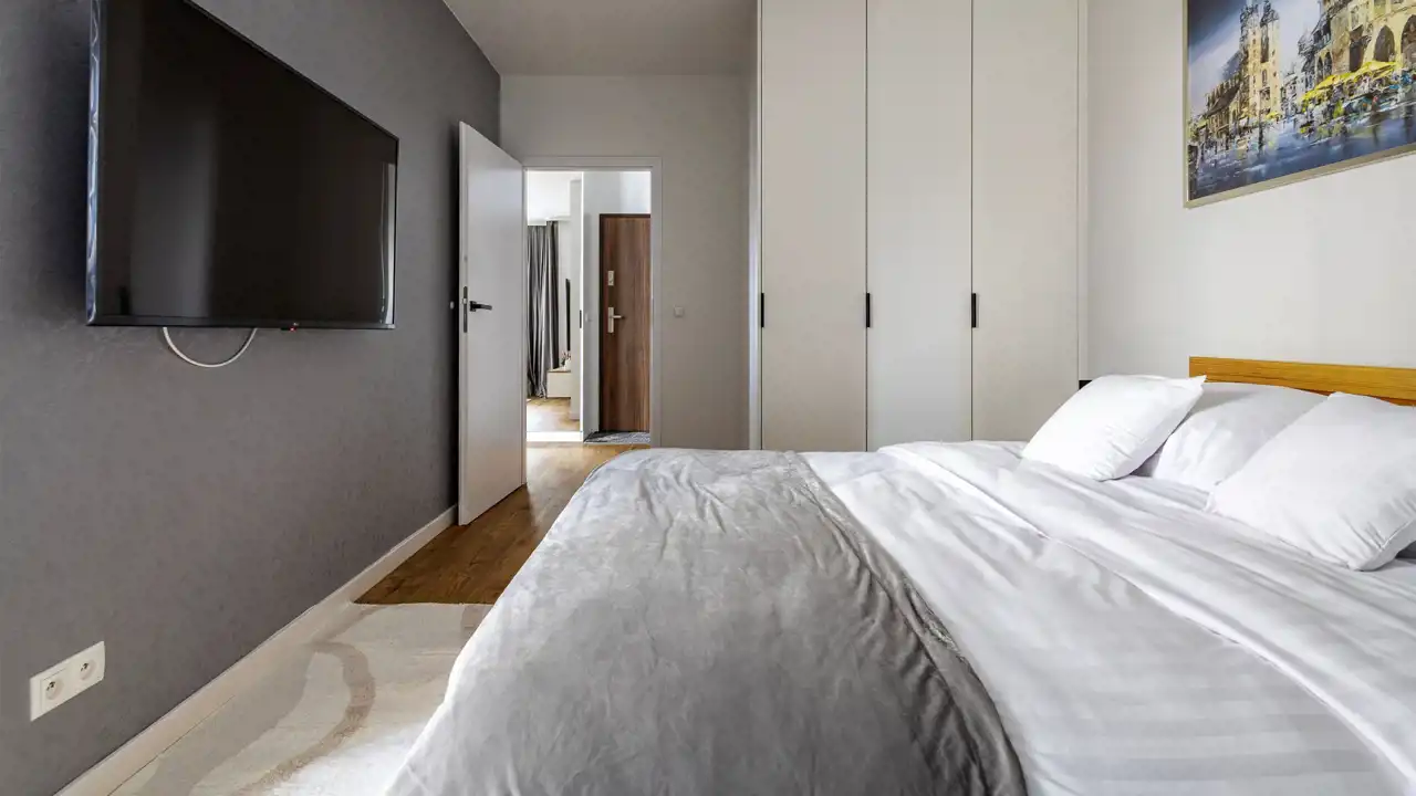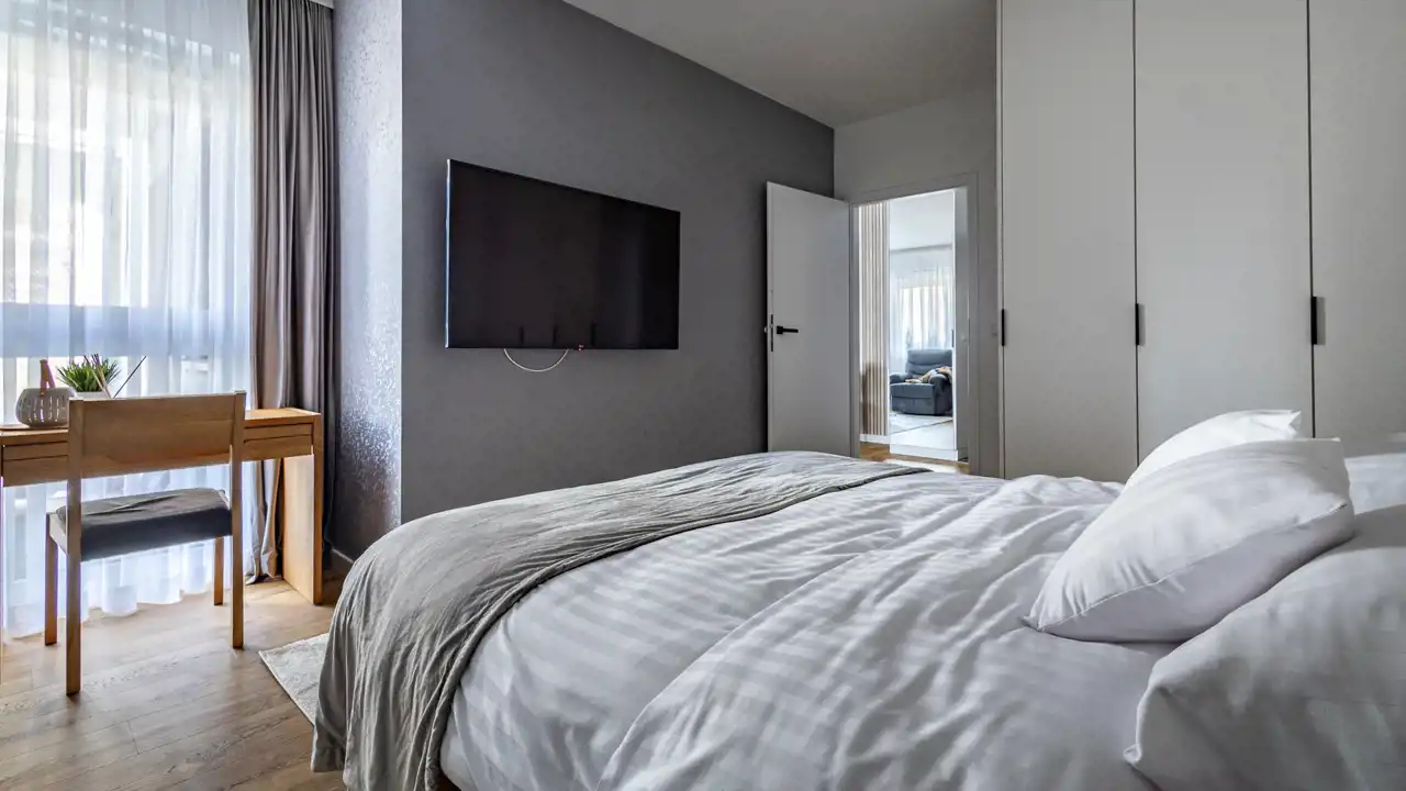 -oddzielna sypialnia z wygodnym dużym łóżkiem, pojemną szafą, biurkiem do pracy a także wyposażona w drugi telewizor.