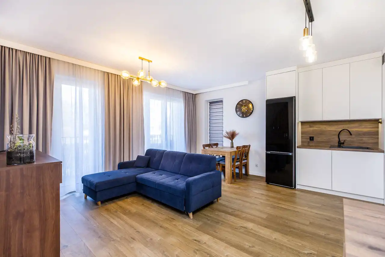 Mieszkanie jest w pełni umeblowane i wyposażone, gotowe do zamieszkania od zaraz. Wnętrze zostało urządzone w nowoczesnym stylu z dbałością o funkcjonalność. Zostało wykończone i wyposażone z myślą o własnym użytkowaniu, dzięki czemu wyróżnia się wysokim standardem oraz funkcjonalnością.