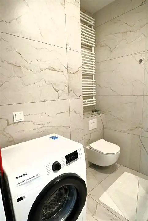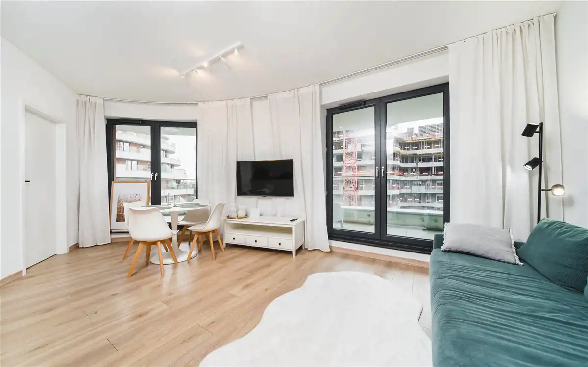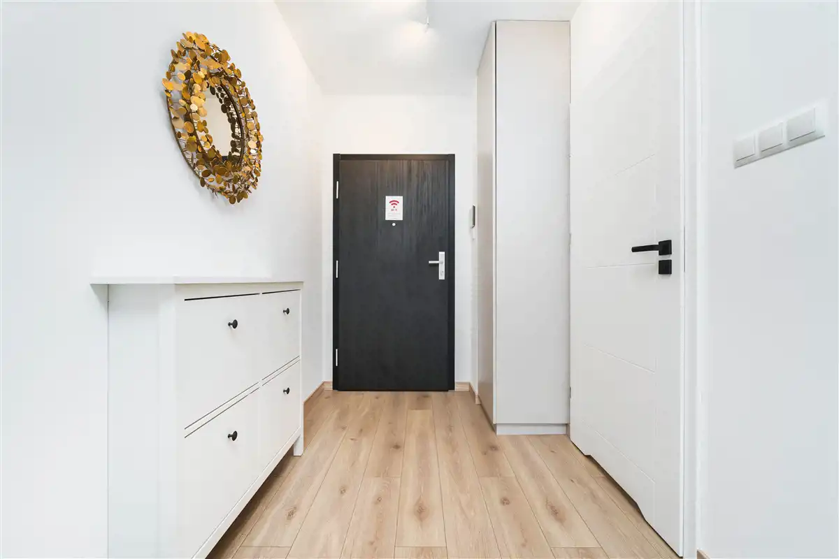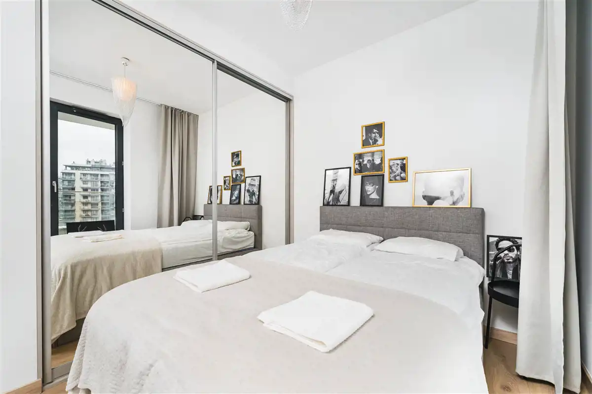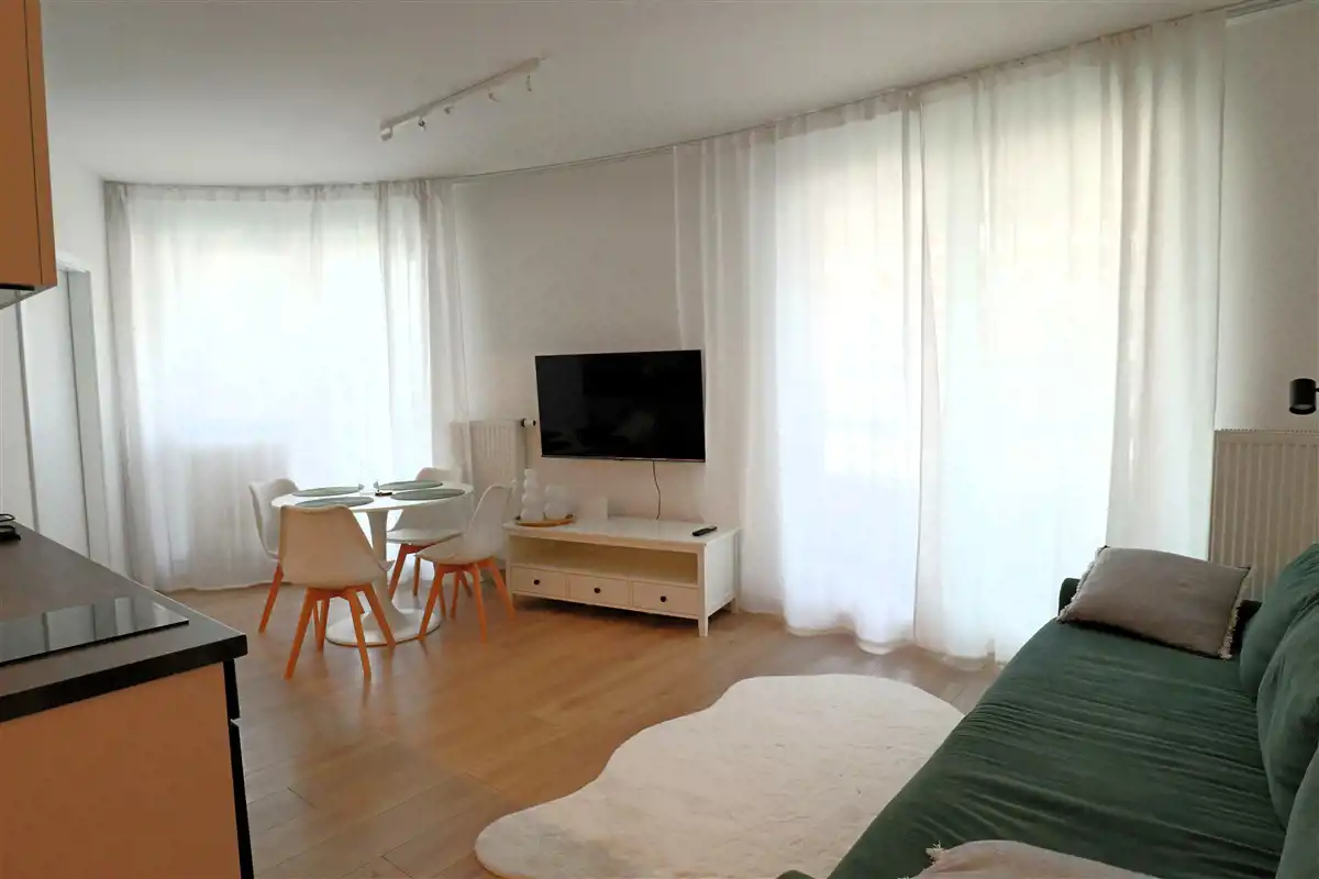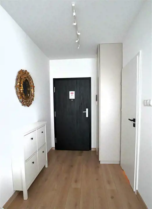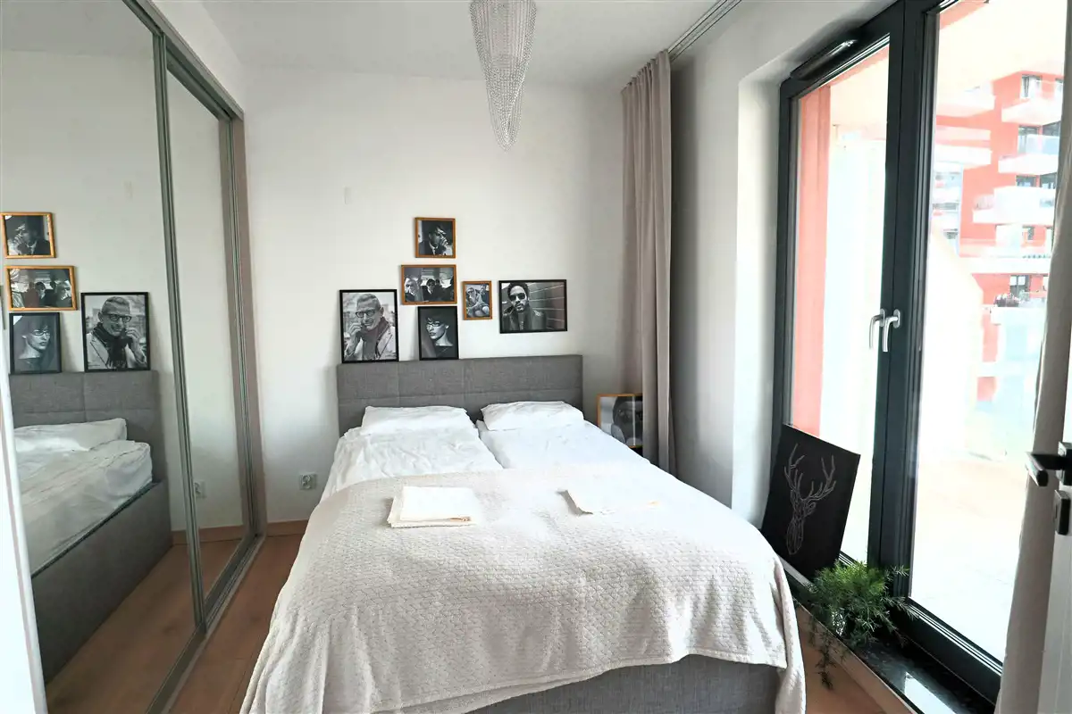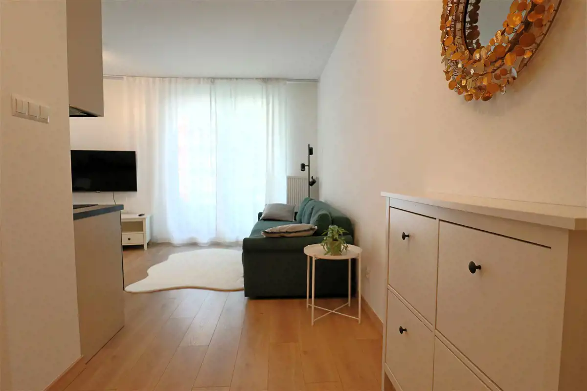 Mieszkanie w pełni umeblowane i wyposażone. W salonie sofa, stół z krzesłami, szafka rtv, telewizor. W części kuchennej płyta, piekarnik, zmywarka, lodówka. W sypialni podwójne łóżko i duża szafa w zabudowie. Łazienka z prysznicem, toaletą i umywalką. W przedpokoju szafa i szafka na buty.