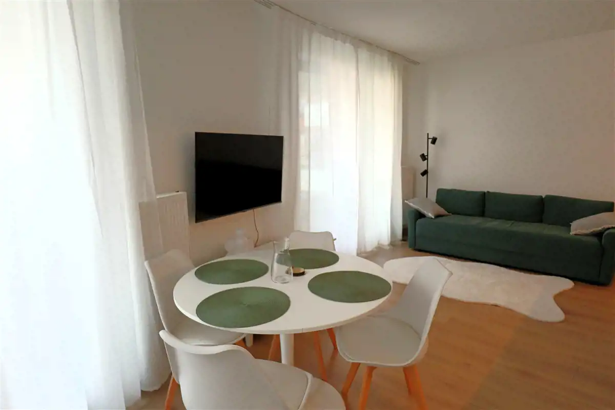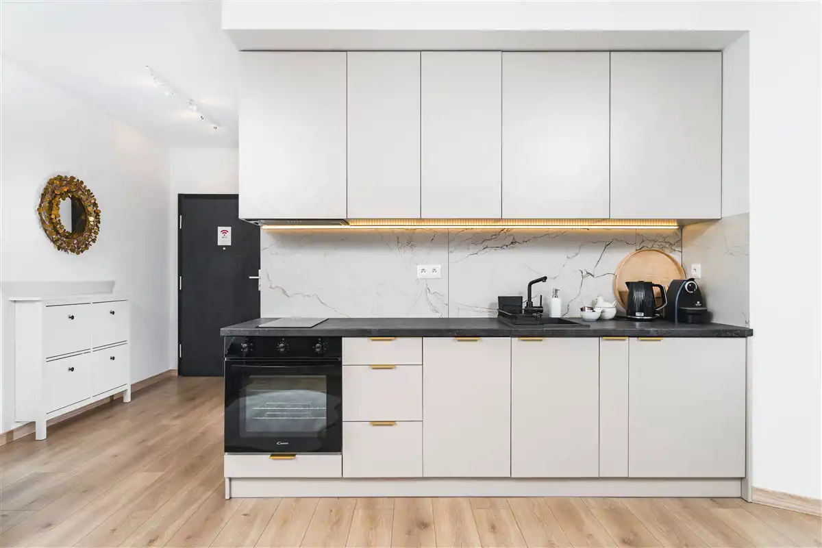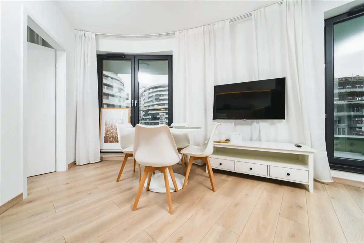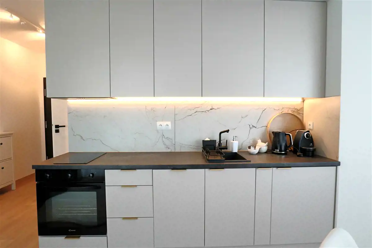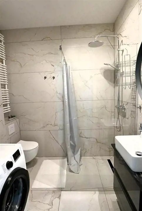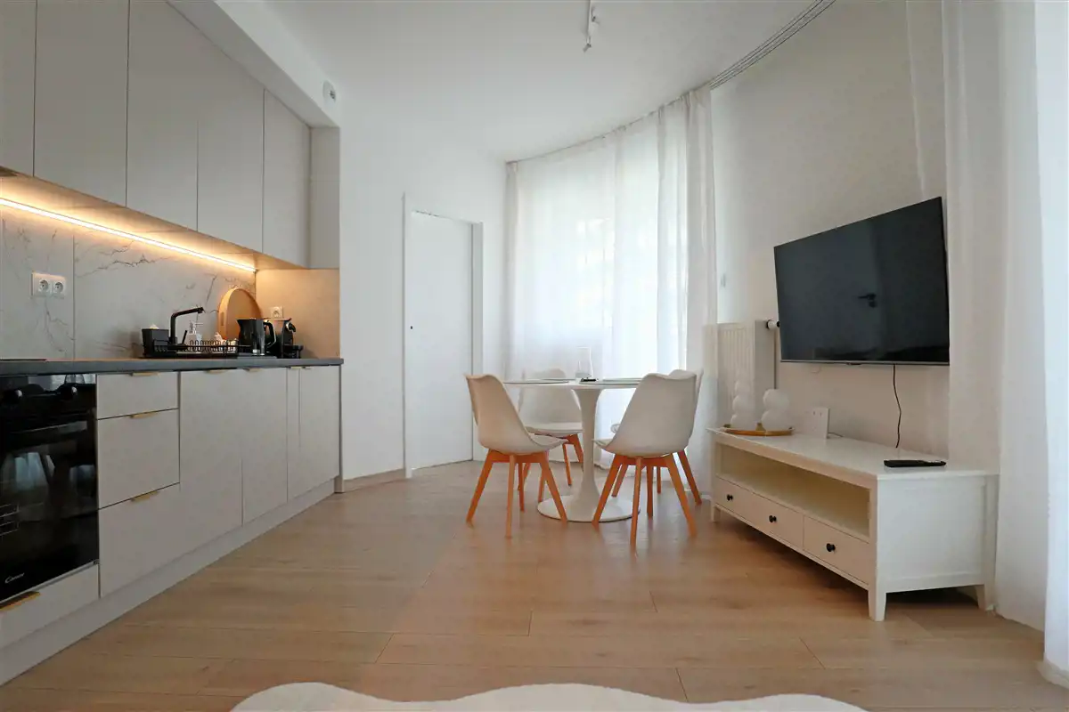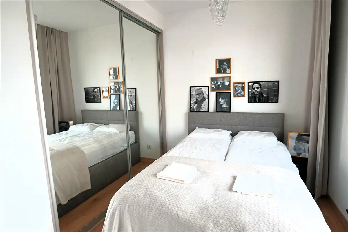 Mieszkanie w pełni umeblowane i wyposażone. W salonie sofa, stół z krzesłami, szafka rtv, telewizor. W części kuchennej płyta, piekarnik, zmywarka, lodówka. W sypialni podwójne łóżko i duża szafa w zabudowie. Łazienka z prysznicem, toaletą i umywalką. W przedpokoju szafa i szafka na buty.