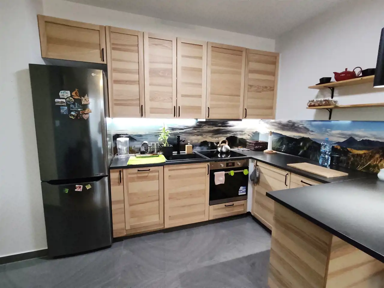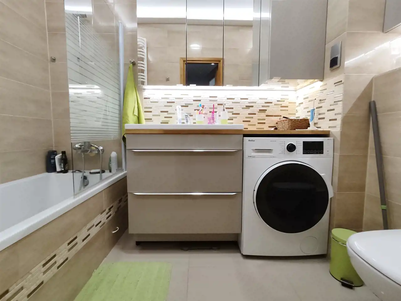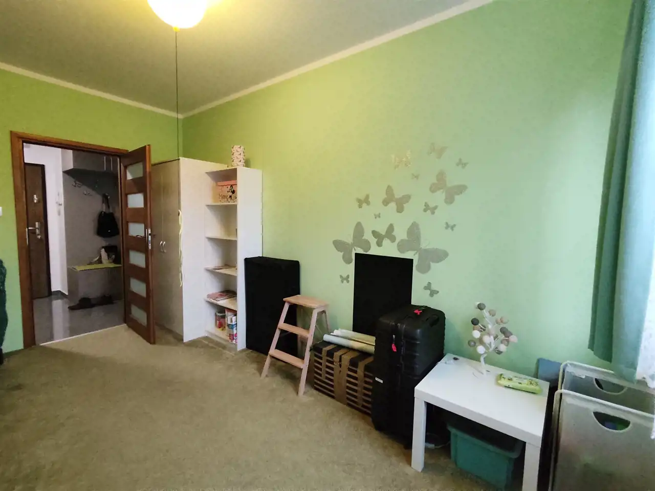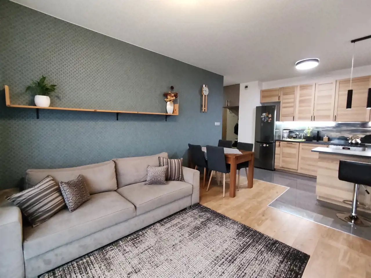 Salon wyposażony dużą sofę, zabudowę szaf oraz wyjście na balkon. Kuchnia wyposażona w zabudowę kuchenną z dużą ilością miejsca do przechowywania, sprzęty takie jak lodówko-zamrażarka, piekarnik, zmywarka, płyta indukcyjna, okap oraz stół z krzesłami. Całe pomieszczenie jasne i przestronne. Sypialnia wyposażona w duże 2-osobowe łóżko szafki nocne oraz szafę. Łazienka z wanną oraz szklana kabina prysznicowa wyposażona w umywalkę, duże lustro, szafki oraz WC. Pokój jest częściowo umeblowany - do własnej aranżacji lub możliwość doposażenia przez właścicieli w jedno lub dwa pojedyncze łóżka. W przedpokoju szafa oraz miejsce na kurtki oraz buty.