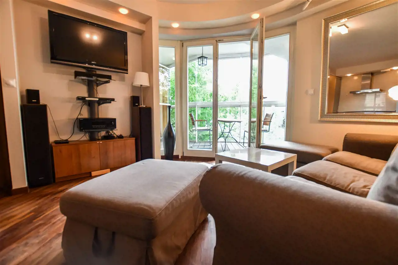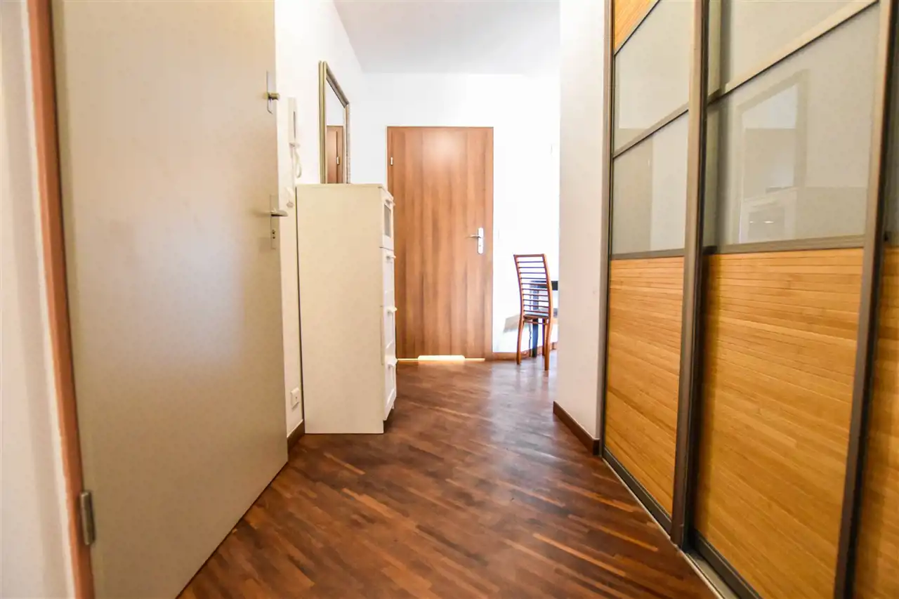 W salonie znajduje się wygodna rozkładana narożna sofa, stół z krzesłami oraz telewizor z zestaw audio. W przedpokoju mamy pojemną szafę oraz mniejszą szafkę na buty.