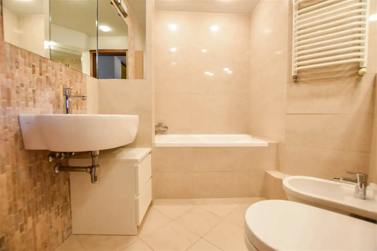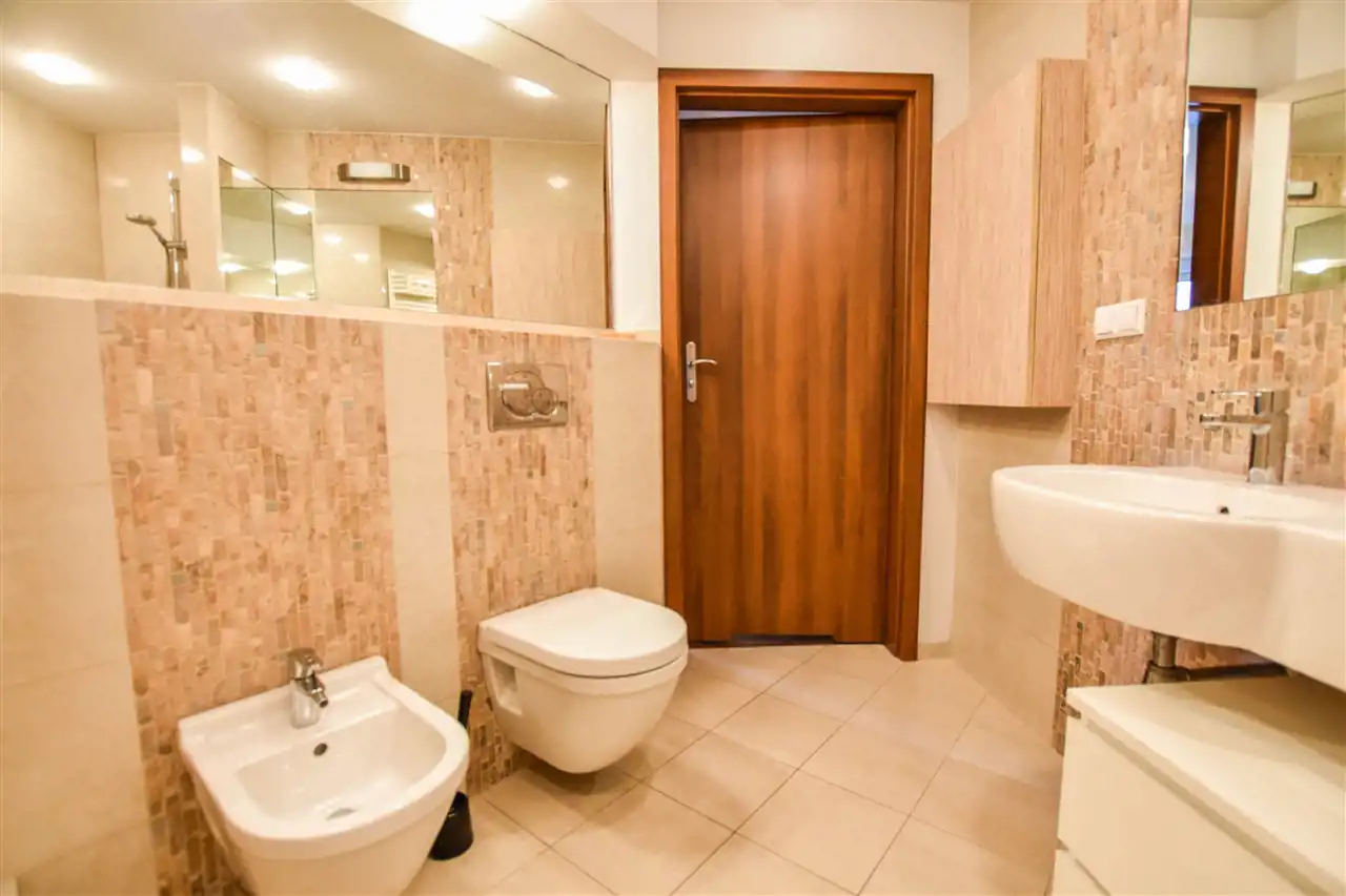 Gustownie urządzona łazienka posiada wannę, toaletę, lustro oraz półkę. W mieszkaniu jest również klimatyzacja.