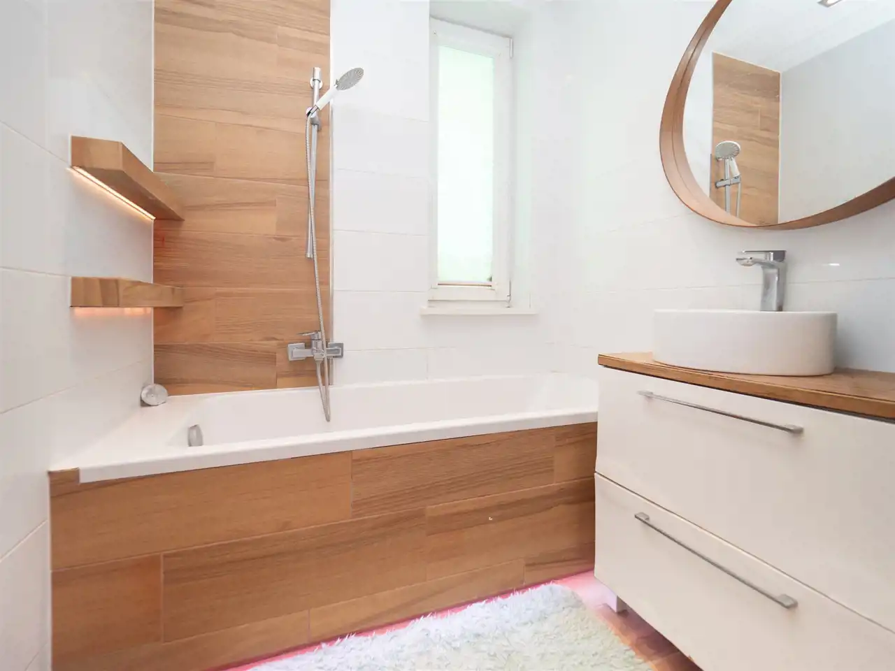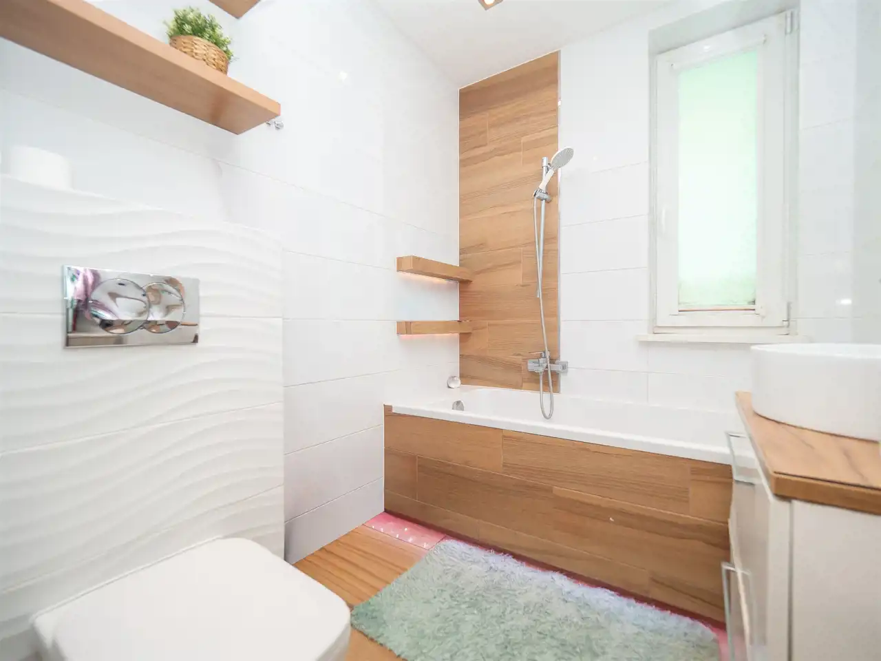 - jasna łazienka z oknem, przestronną wanną, pralką oraz dużą szafą do przechowywania,