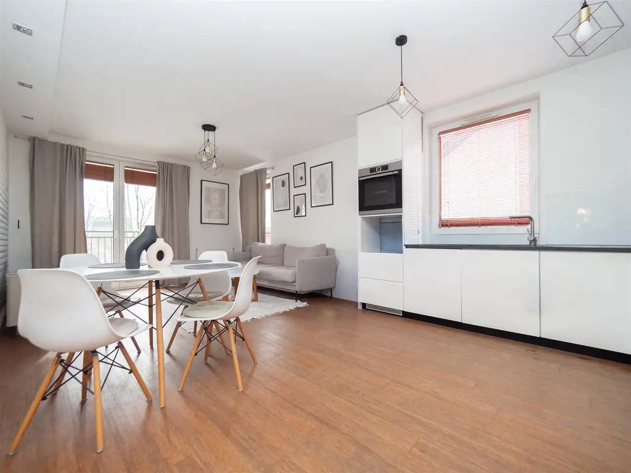 - aneks kuchenny z meblami w zabudowie, kamiennymi blatami oraz energooszczędnym sprzętem AGD: zmywarka, lodówka z zamrażarką, płyta indukcyjna, piekarnik oraz ekspres do kawy,