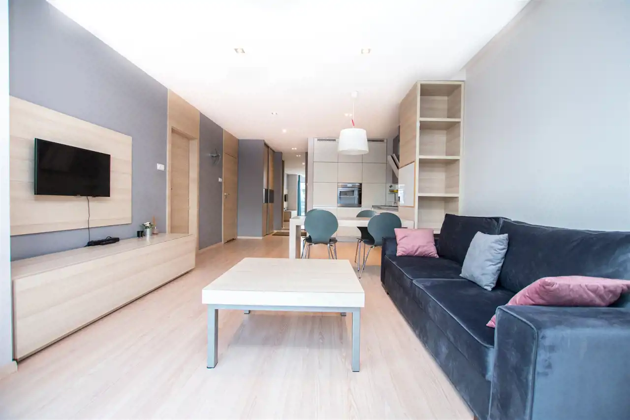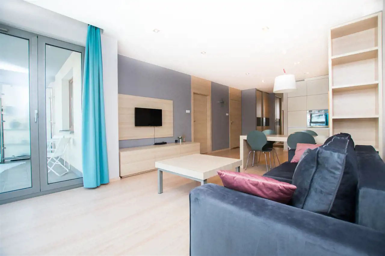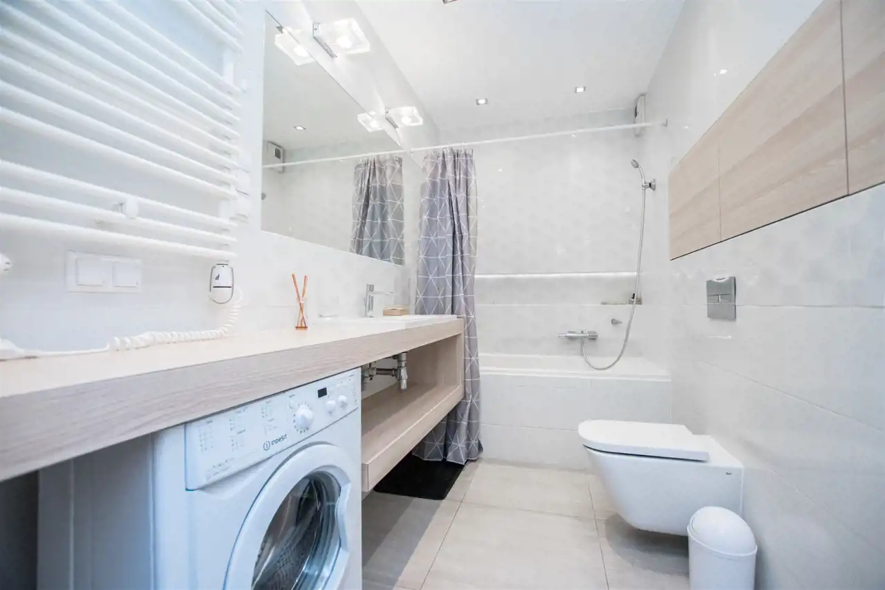 W pełni umeblowany i wyposażony apartament zaprojektowane z dbałością o każdy szczegół. Nowoczesny salon z sofą, stolikami kawowymi, szafkami, telewizorem. Aneks kuchenny w pełni wyposażony w sprzęt AGD tj. płyta indukcyjna, piekarnik, lodówka z zamrażalnikiem, zmywarkę, ekspres czajnik, stół z krzesłami. W sypialni podwójne łóżko, duża szafa w zabudowie, komody. Nowoczesna Łazienka z wanną oraz opcją prysznicową, pralką, umywalka i toaleta, szafki. Mieszkanie w pełni umeblowane wyposażone i gotowe do zamieszkania. Mieszkanie posiada duży balkon z stolikiem kawowym oraz krzesłami.