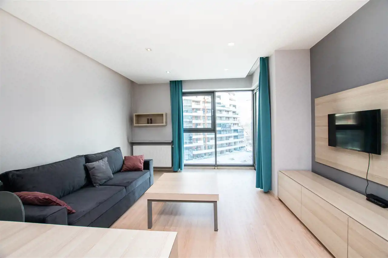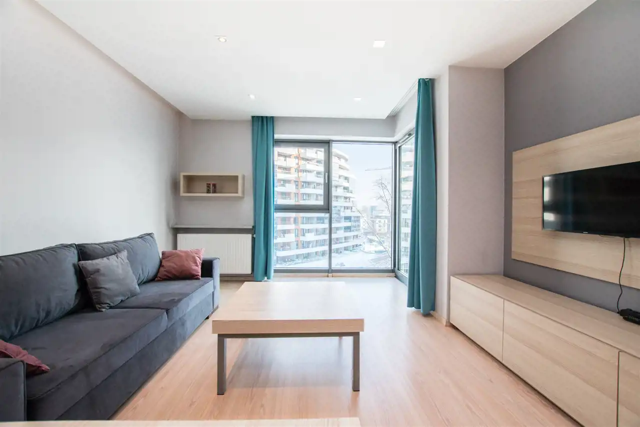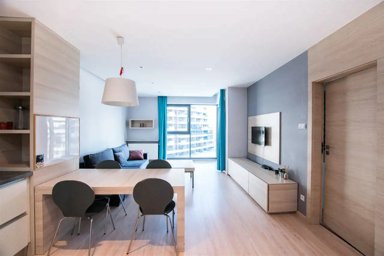 W pełni umeblowany i wyposażony apartament zaprojektowane z dbałością o każdy szczegół. Nowoczesny salon z sofą, stolikami kawowymi, szafkami, telewizorem. Aneks kuchenny w pełni wyposażony w sprzęt AGD tj. płyta indukcyjna, piekarnik, lodówka z zamrażalnikiem, zmywarkę, ekspres czajnik, stół z krzesłami. W sypialni podwójne łóżko, duża szafa w zabudowie, komody. Nowoczesna Łazienka z wanną oraz opcją prysznicową, pralką, umywalka i toaleta, szafki. Mieszkanie w pełni umeblowane wyposażone i gotowe do zamieszkania. Mieszkanie posiada duży balkon z stolikiem kawowym oraz krzesłami.
