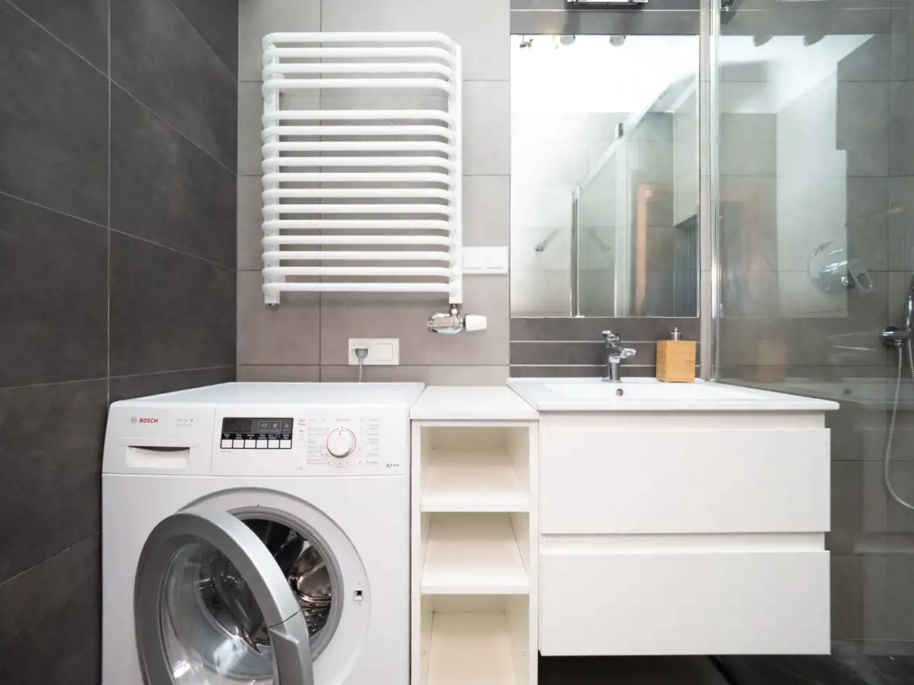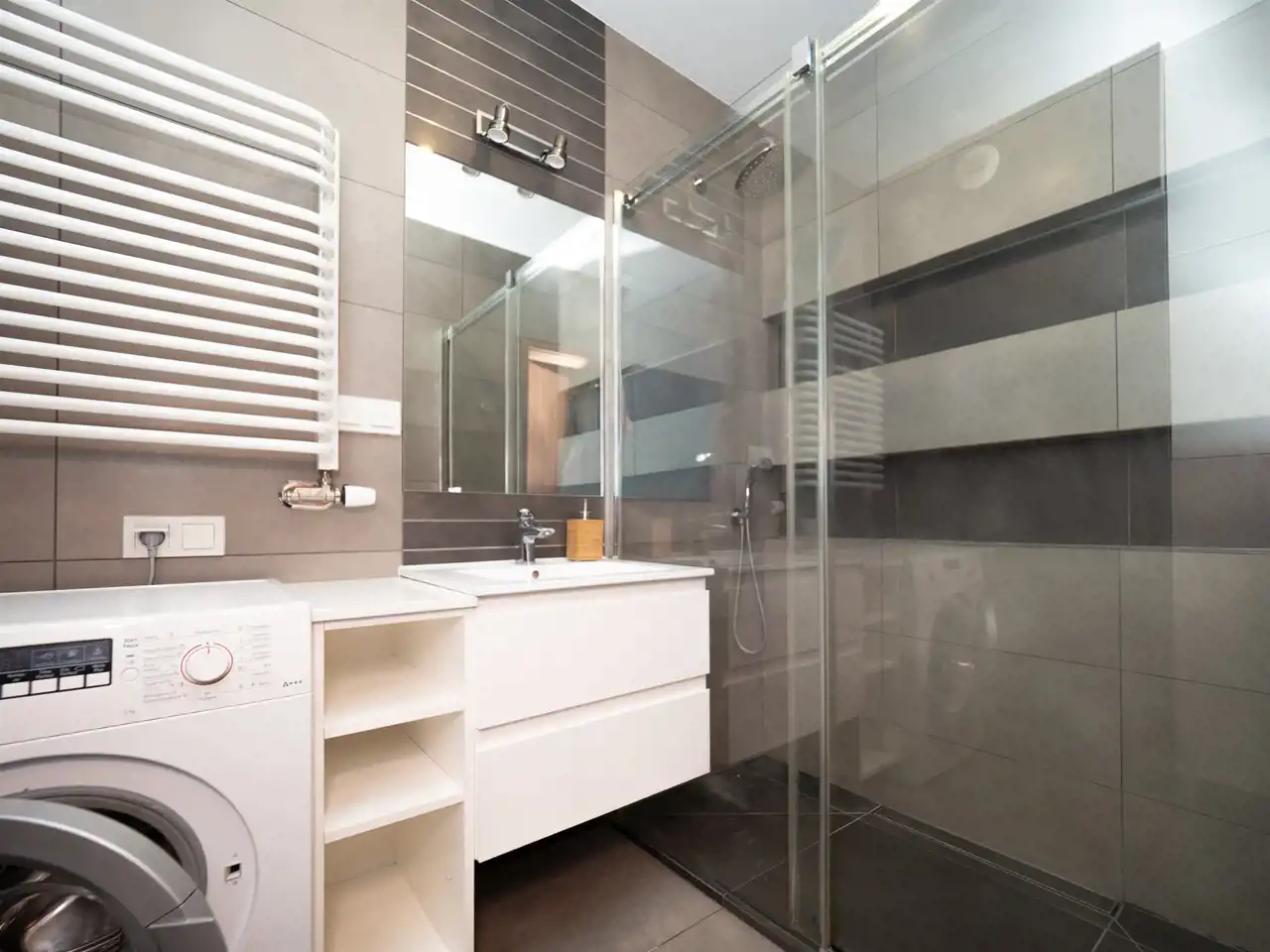 - a bathroom with a shower cabin and a washing machine (3.93 m²),