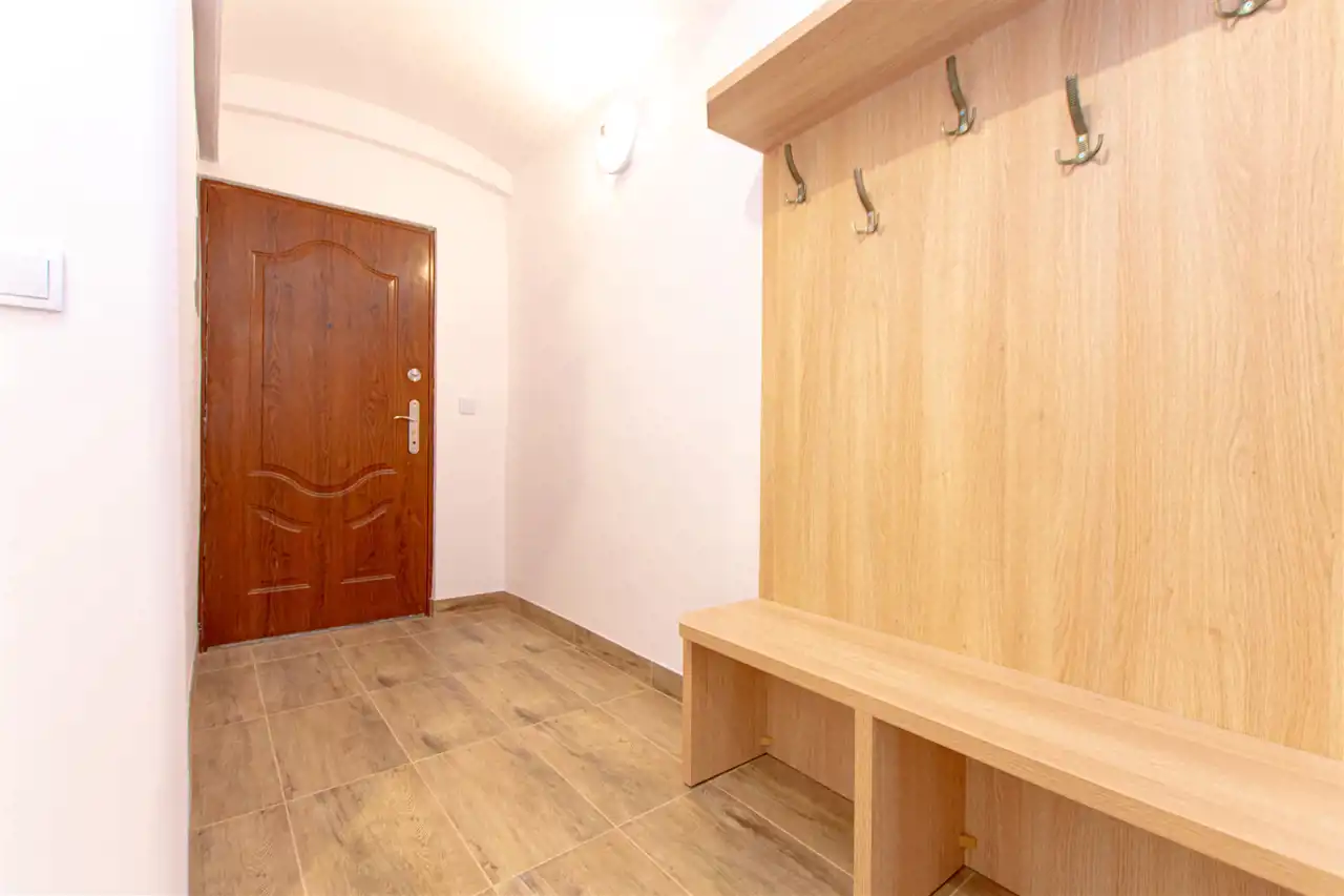 - przedpokój z szafą w zabudowie i szafką z wieszakiem.