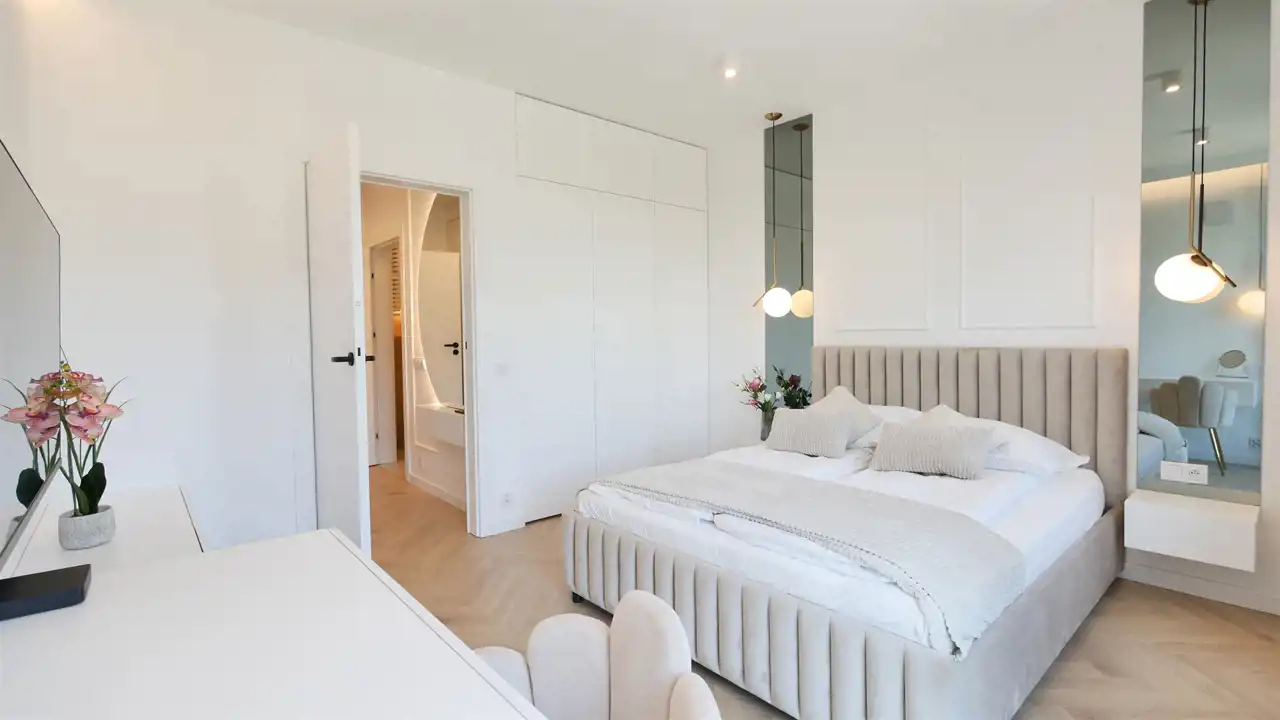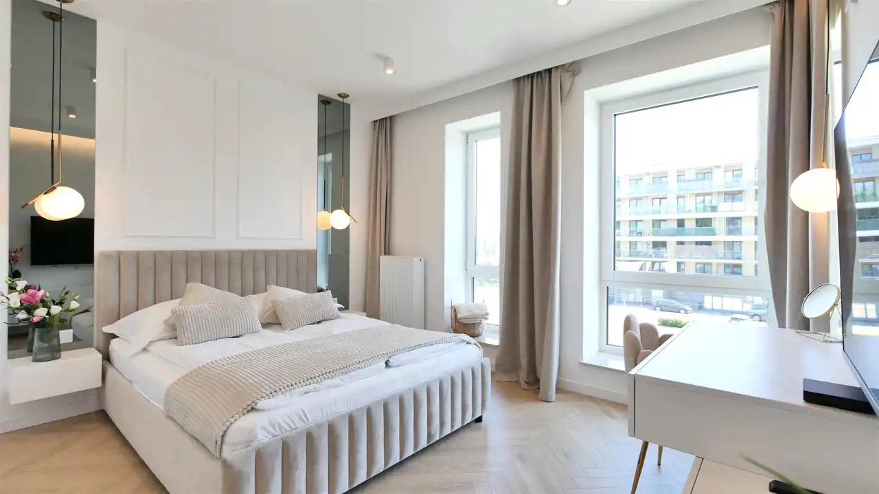- sypialnia z łóżkiem, pojemną szafą, szafki i smart TV