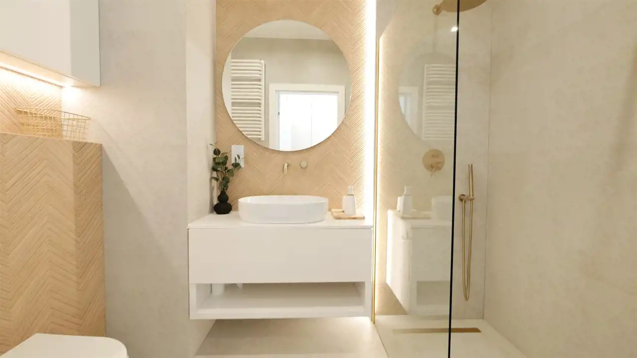 - łazienka z prysznicem z deszczownicą, umywalką oraz toaletą,