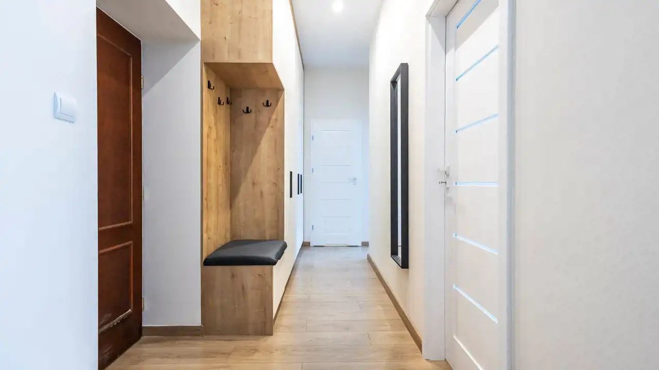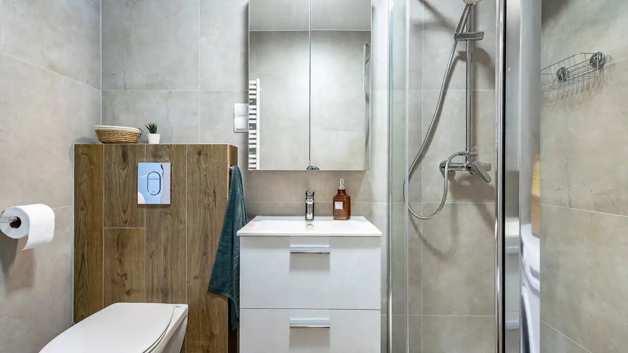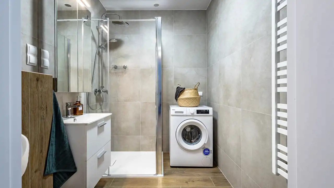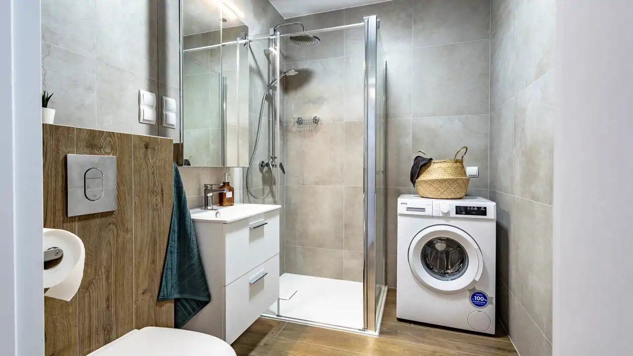 Elegancka łazienka z kabiną prysznicową, WC i pralką. W przedpokoju – praktyczna zabudowa z dużą ilością miejsca do przechowywania.