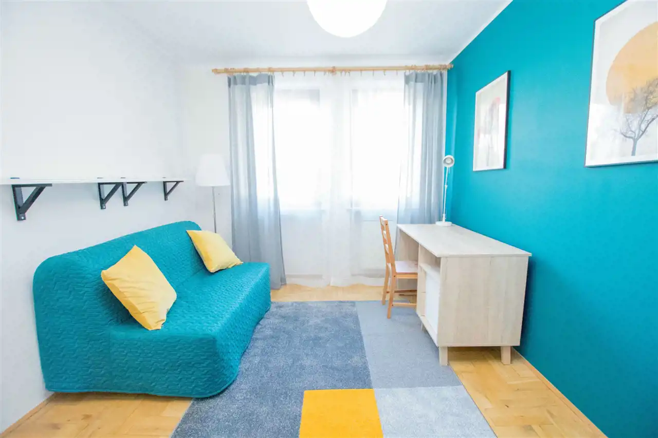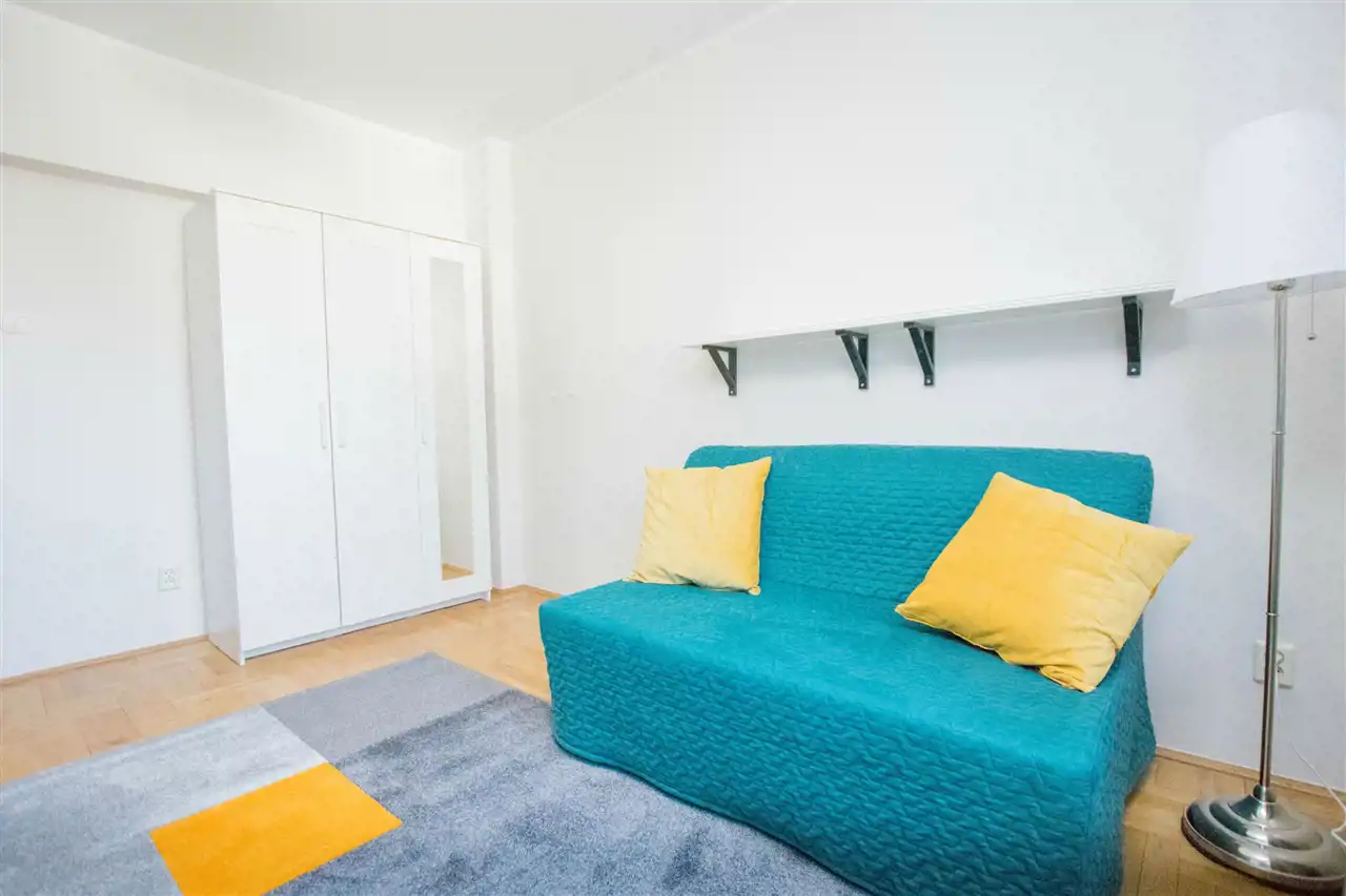 Salon jest jasny i przestronny. Wyposażony jest w dwie sofy, szafę, stół. Z salonu jest wyjście na duży balkon.