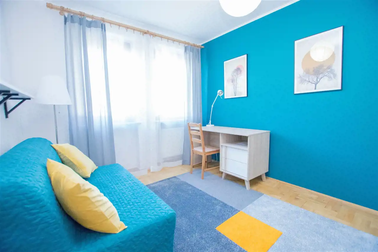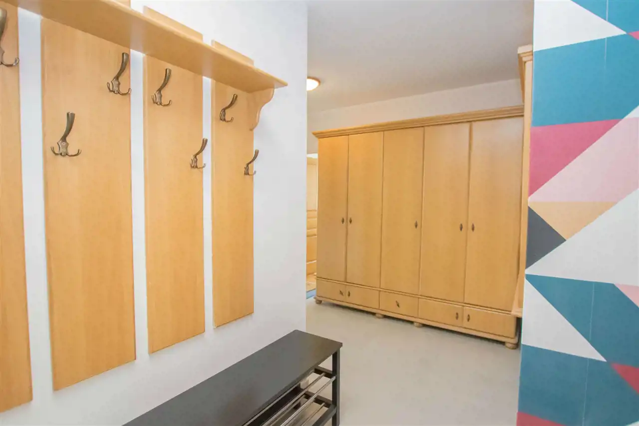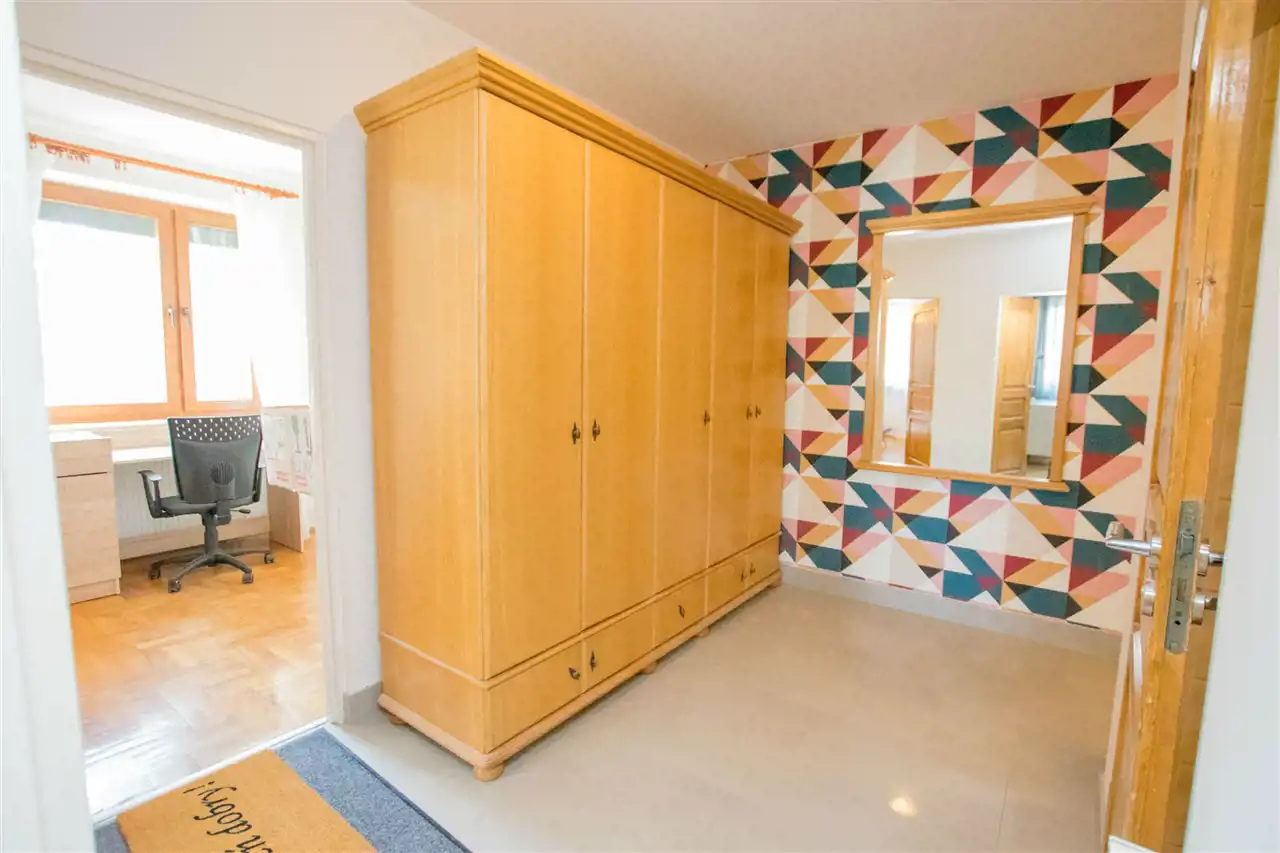 2 Pokoje wyposażone są w łóżka biurka i regały. Jeden z pokoi wyposażony jest w duże podwójne łóżko oraz dużą szafę. Jedna z łazienka wyposażona jest w wannę natomiast w drugiej łazience znajduje sie kabina prysznicowa oraz pralka. W przedpokoju znajduje się duża szafa w zabudowie oraz półki na buty.