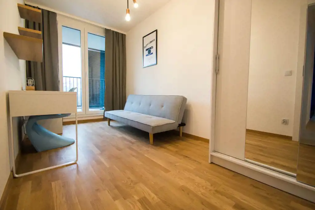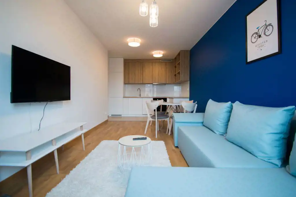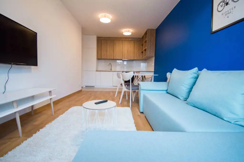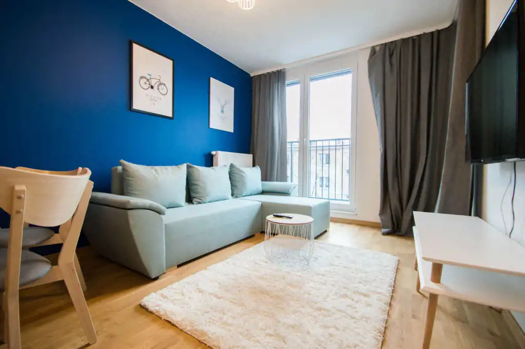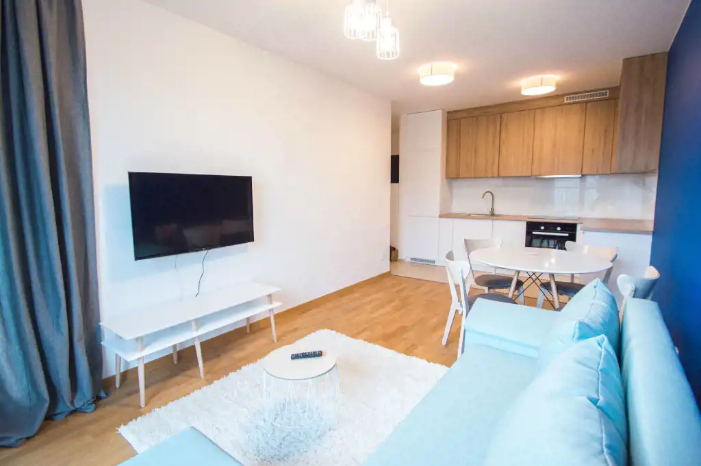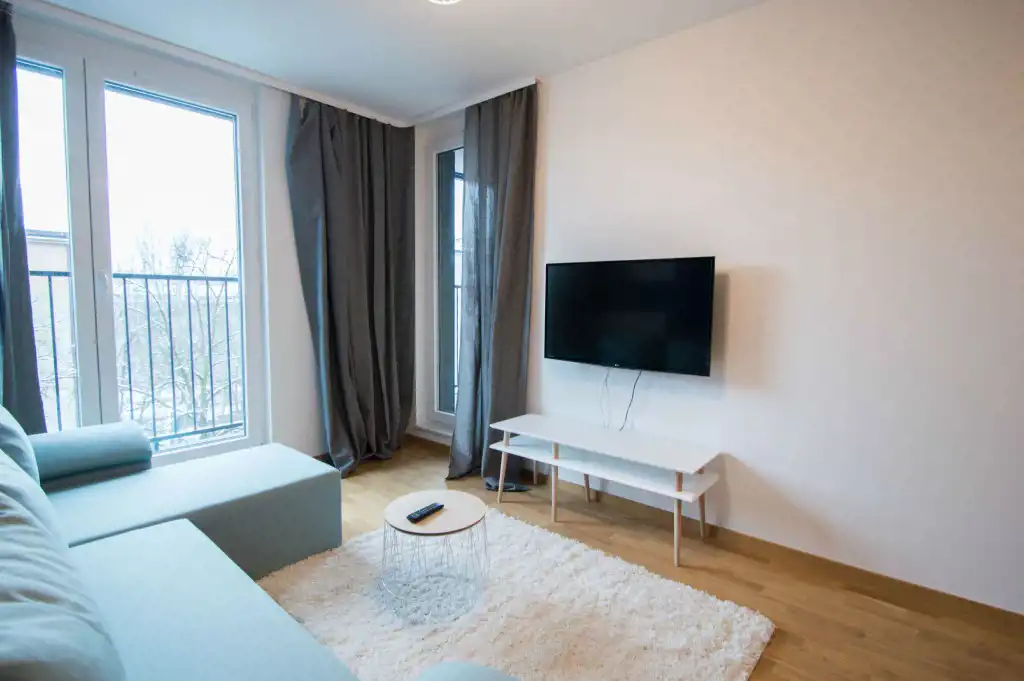 Apartament jest zupełnie nowy, wykończony w najwyższym standardzie. Mieszkanie jest przestronne, a duża ilość wysokich okien sprawia, że jest wyjątkowo jasne. W części dziennej znajdziemy wygodną rozkładaną sofę, stolik kawowy, telewizor, stół oraz krzesła. Kuchnia w pełni wyposażona w sprzęt AGD: płyta grzewcza, czajnik, zmywarka, piekarnik, lodówka z zamrażalnikiem, zlewozmywak z baterią. W sypialniach duże, podwójne, wygodne łóżko, pojemna szafa oraz biurko. W drugiej sypialni znajduje się nowoczesne biurko, szafa, rozkładana sofa. Zarówno z pokoju dziennego jak i z sypialni znajduje się wyjście na duży balkon. Łazienka wyposażona jest w prysznic, umywalkę, szafkę oraz pralkę.