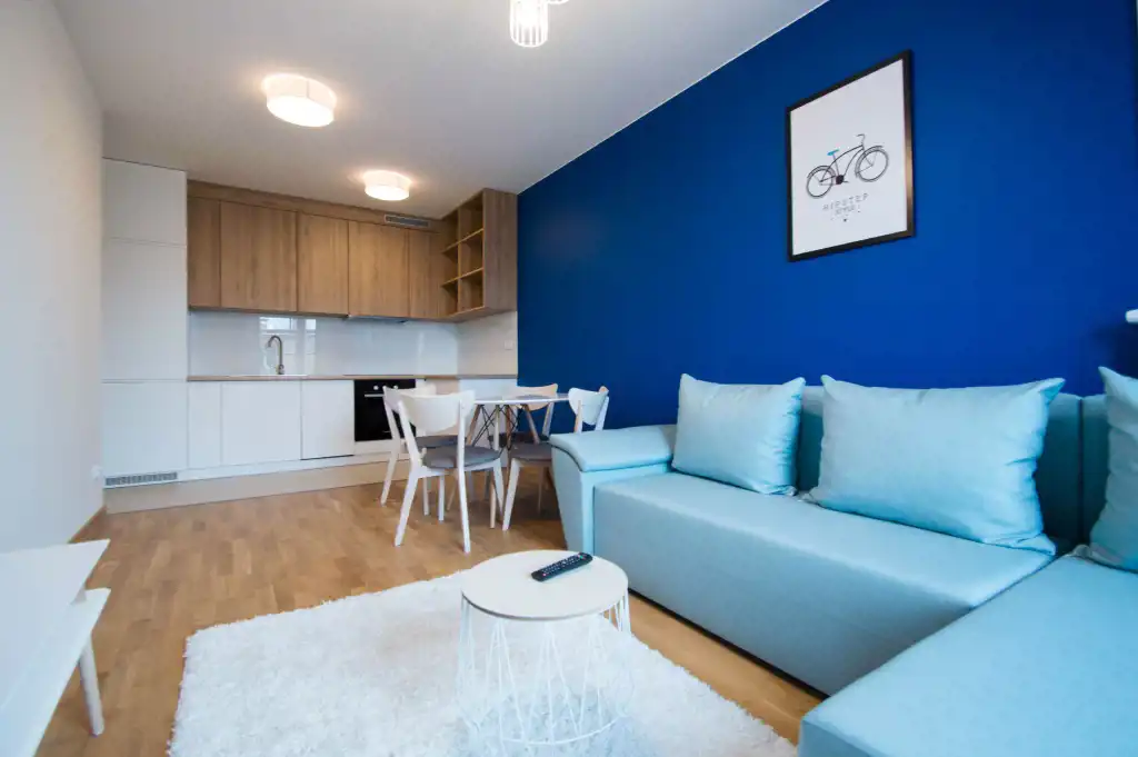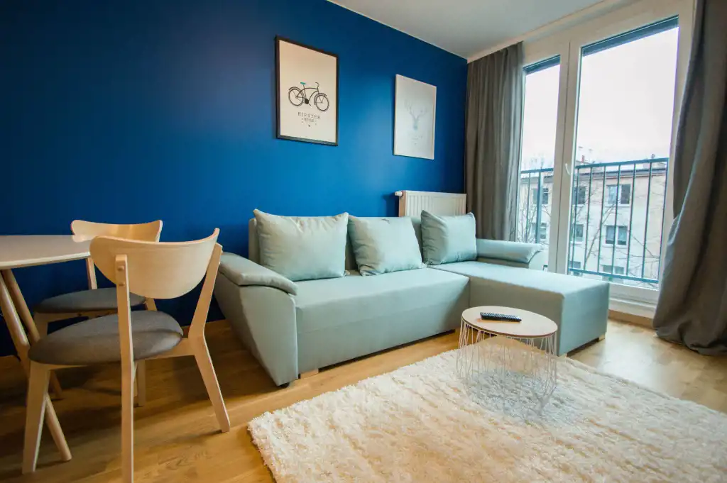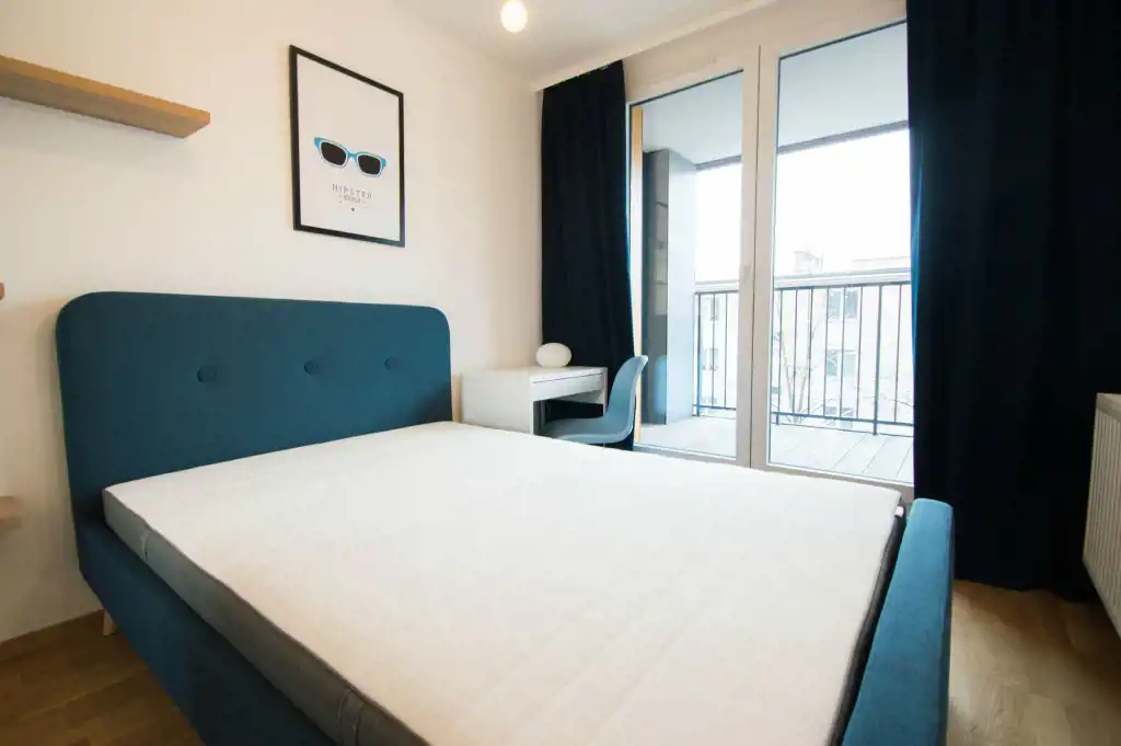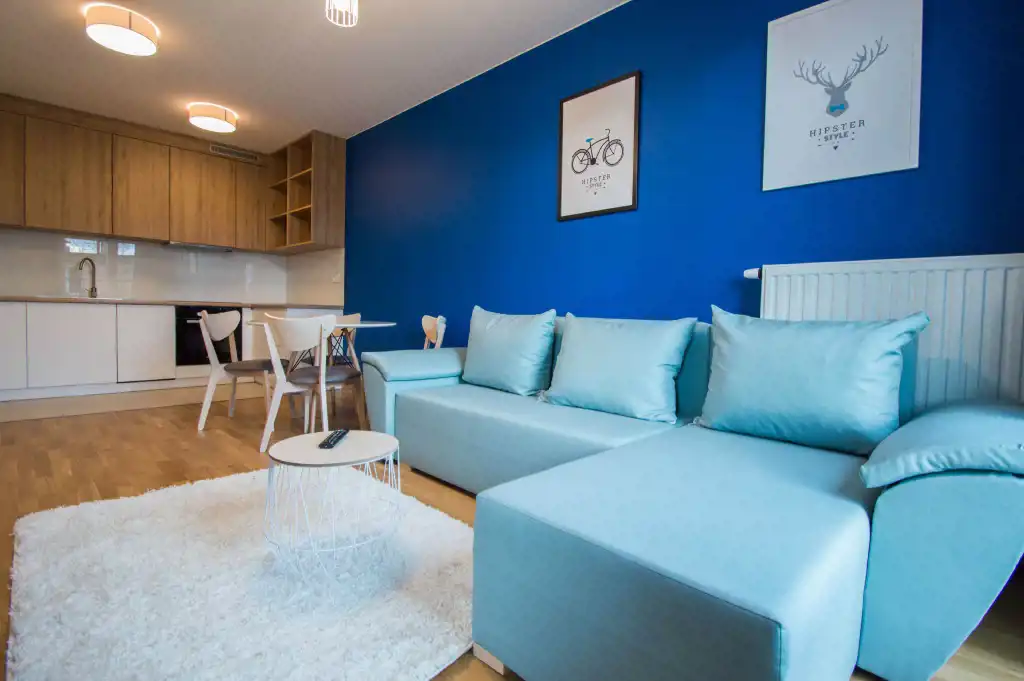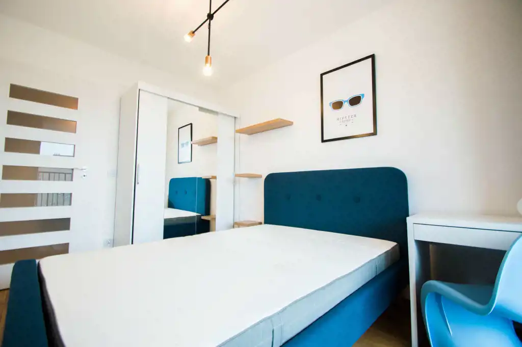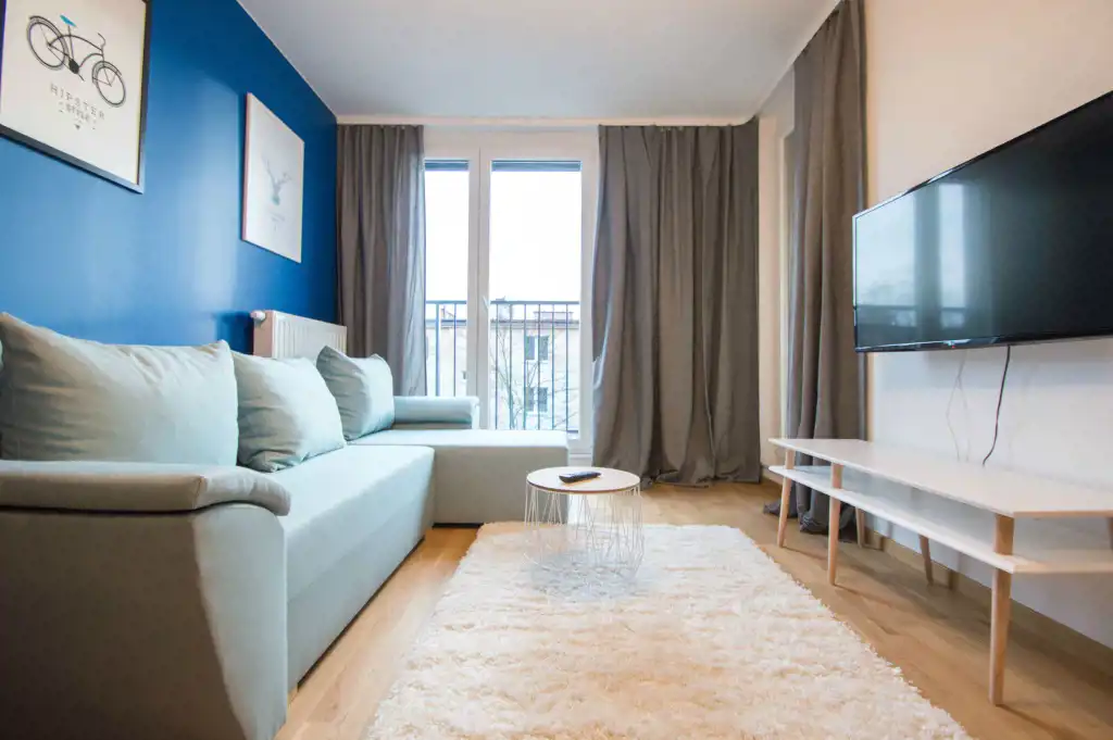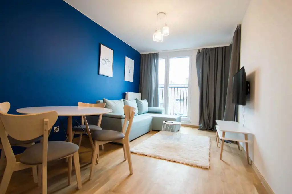 Apartament jest zupełnie nowy, wykończony w najwyższym standardzie. Mieszkanie jest przestronne, a duża ilość wysokich okien sprawia, że jest wyjątkowo jasne. W części dziennej znajdziemy wygodną rozkładaną sofę, stolik kawowy, telewizor, stół oraz krzesła. Kuchnia w pełni wyposażona w sprzęt AGD: płyta grzewcza, czajnik, zmywarka, piekarnik, lodówka z zamrażalnikiem, zlewozmywak z baterią. W sypialniach duże, podwójne, wygodne łóżko, pojemna szafa oraz biurko. W drugiej sypialni znajduje się nowoczesne biurko, szafa, rozkładana sofa. Zarówno z pokoju dziennego jak i z sypialni znajduje się wyjście na duży balkon. Łazienka wyposażona jest w prysznic, umywalkę, szafkę oraz pralkę.