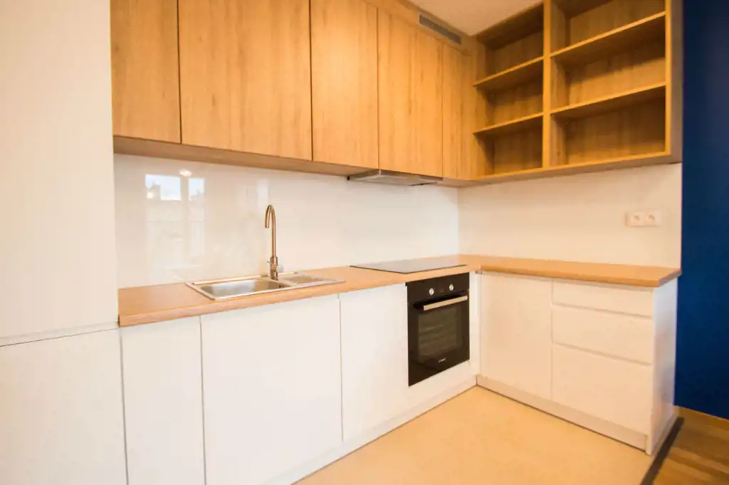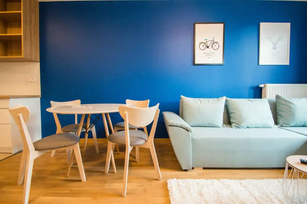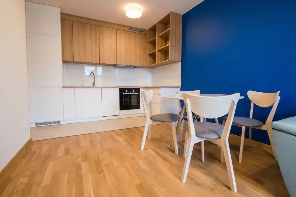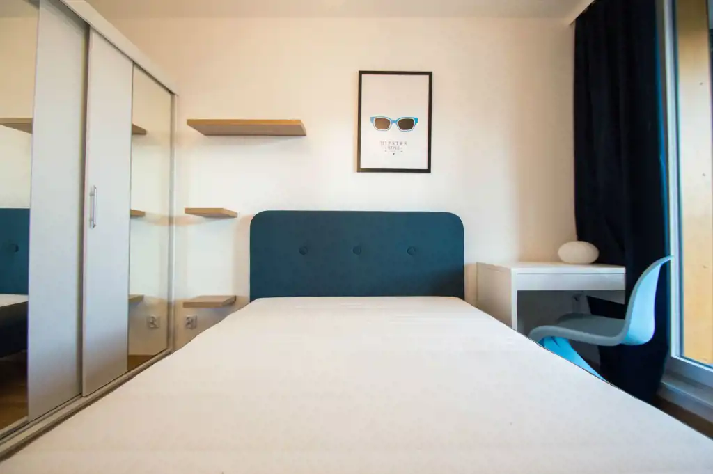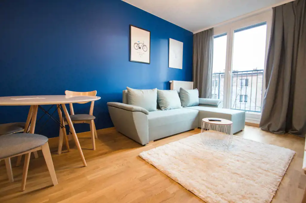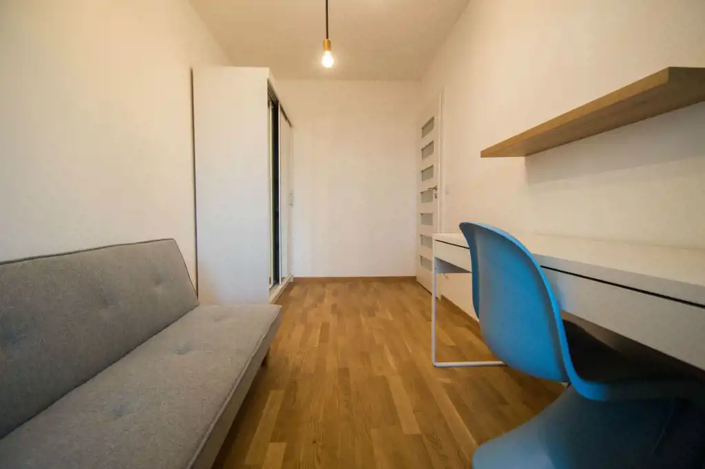 Apartament jest zupełnie nowy, wykończony w najwyższym standardzie. Mieszkanie jest przestronne, a duża ilość wysokich okien sprawia, że jest wyjątkowo jasne. W części dziennej znajdziemy wygodną rozkładaną sofę, stolik kawowy, telewizor, stół oraz krzesła. Kuchnia w pełni wyposażona w sprzęt AGD: płyta grzewcza, czajnik, zmywarka, piekarnik, lodówka z zamrażalnikiem, zlewozmywak z baterią. W sypialniach duże, podwójne, wygodne łóżko, pojemna szafa oraz biurko. W drugiej sypialni znajduje się nowoczesne biurko, szafa, rozkładana sofa. Zarówno z pokoju dziennego jak i z sypialni znajduje się wyjście na duży balkon. Łazienka wyposażona jest w prysznic, umywalkę, szafkę oraz pralkę.