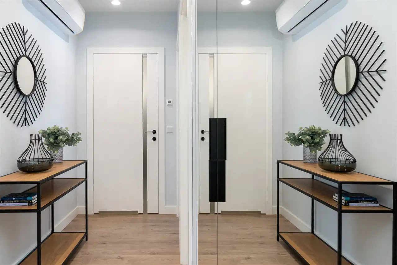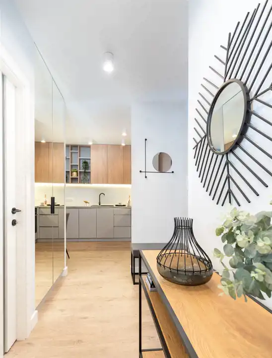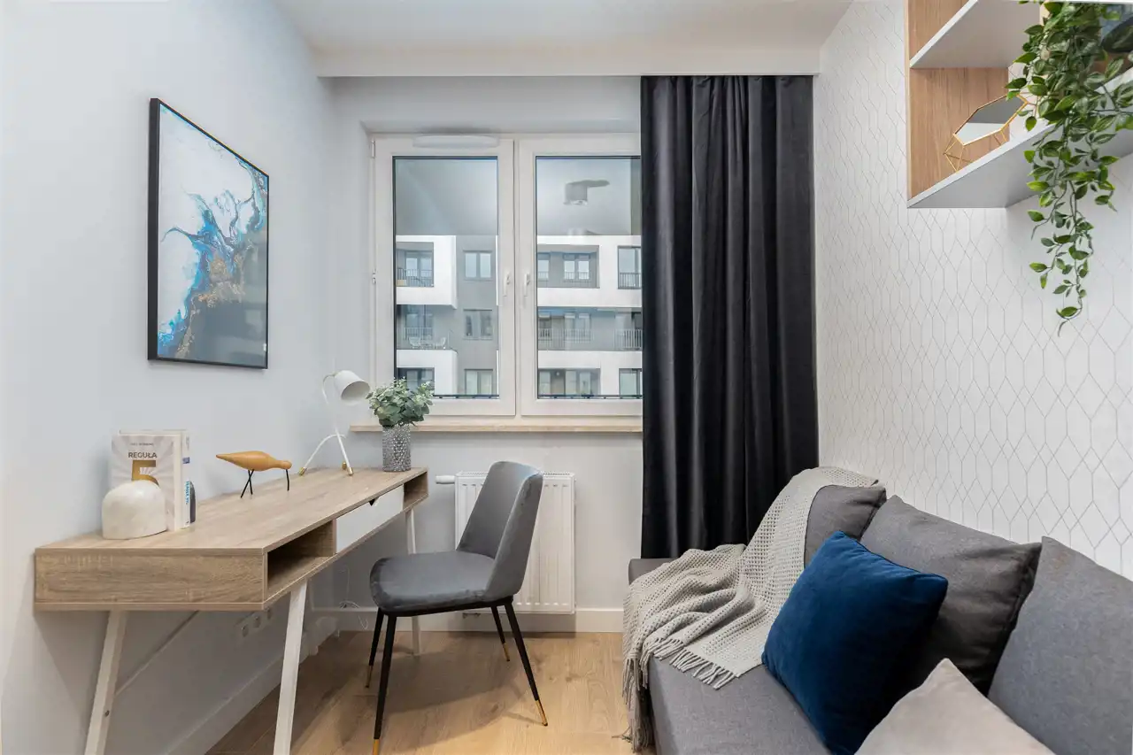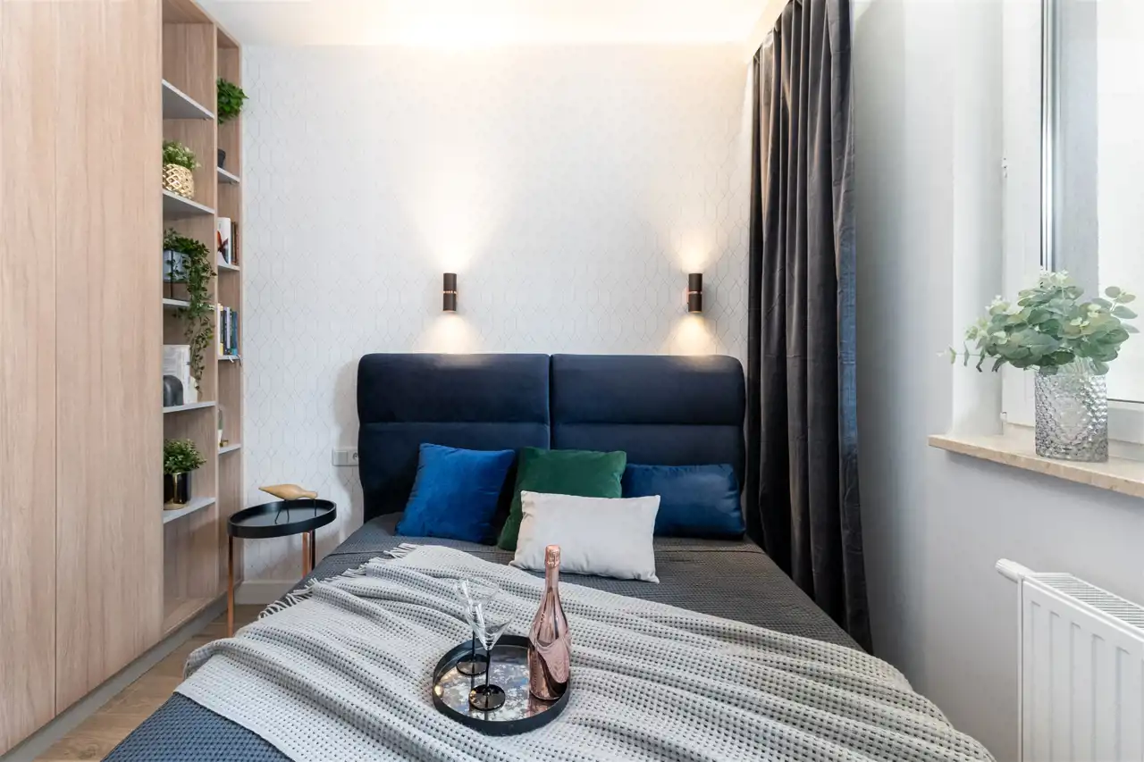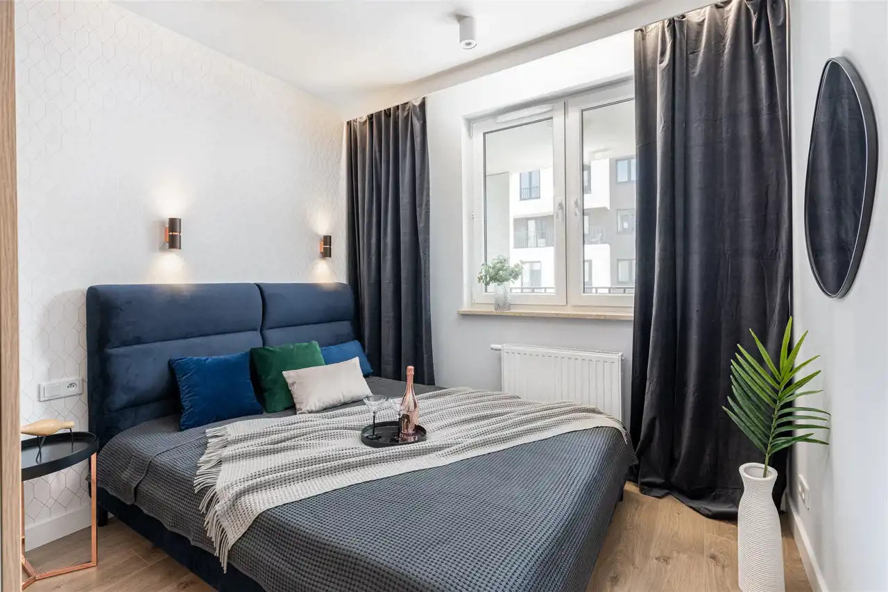 Mieszkanie ma powierzchnię 48 m2 i mieści się na 5 piętrze. W pełni umeblowane i wyposażone pod okiem architekta z dbałością o każdy szczegół aranżacji. W jednej z sypialni podwójne łóżko, szafa i półki.