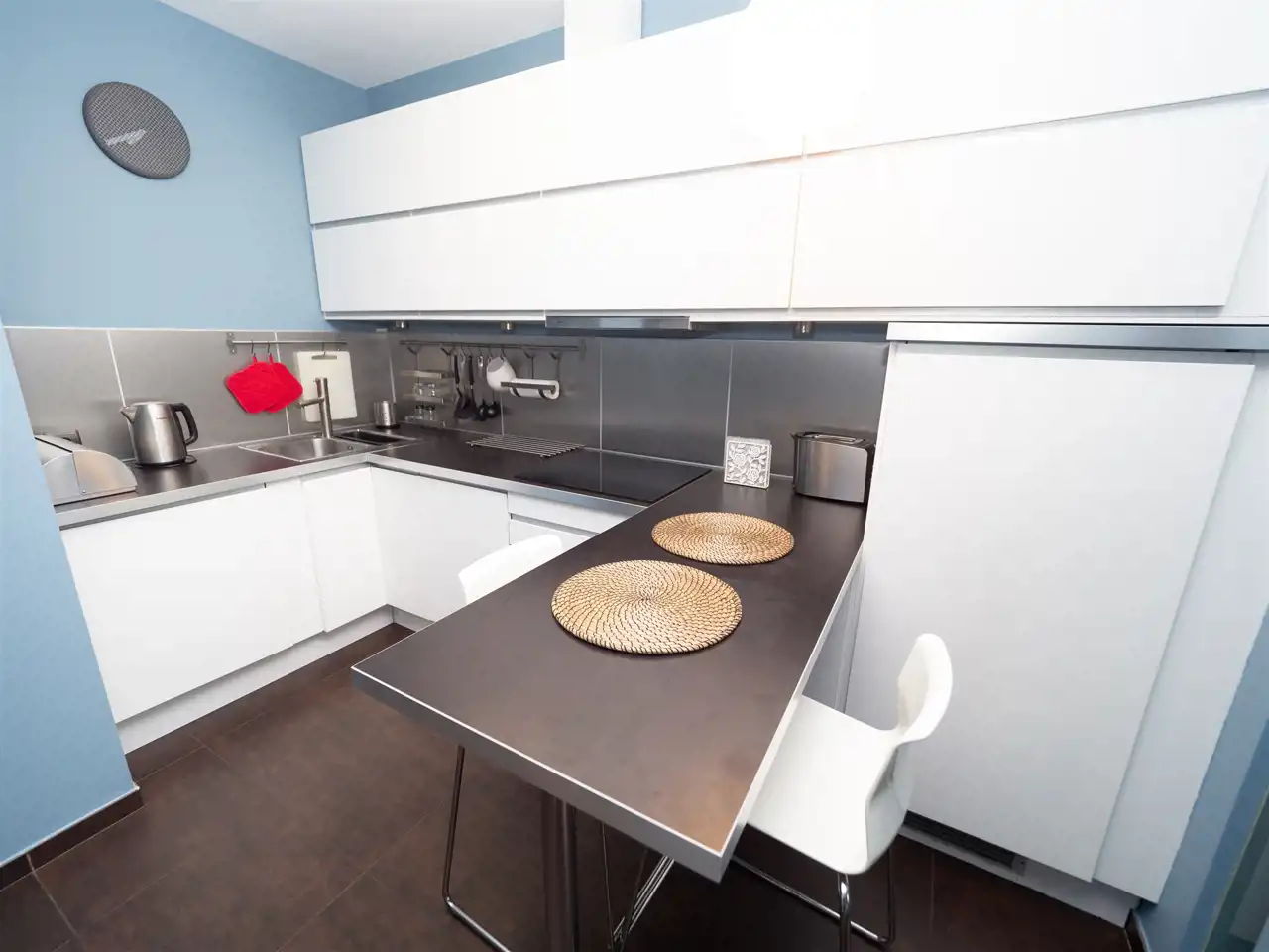 Mieszkanie składa się z dwóch osobnych pokoi, urządzonych w nowoczesnym stylu, w pełni wyposażonej kuchni oraz łazienki z prysznicem.