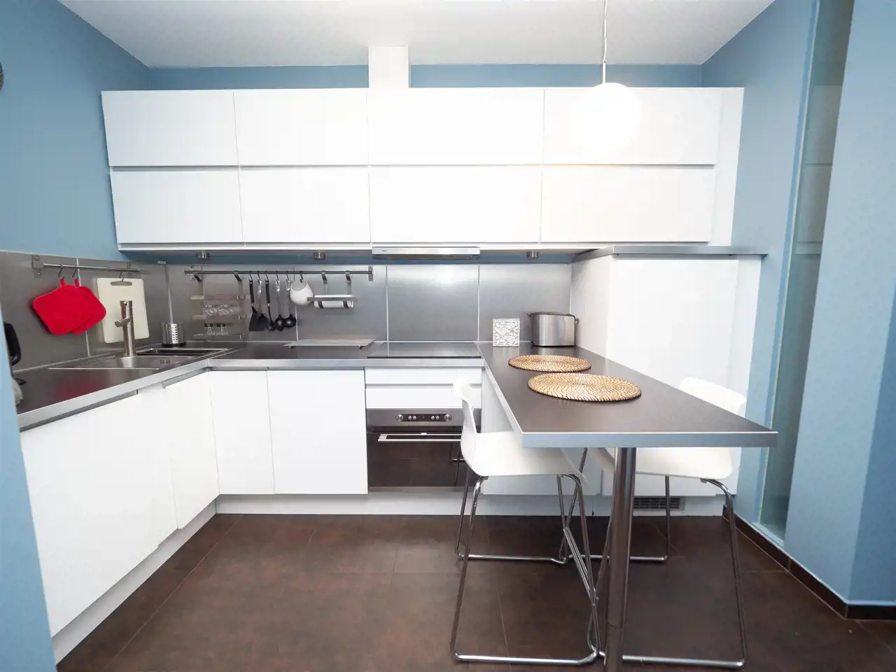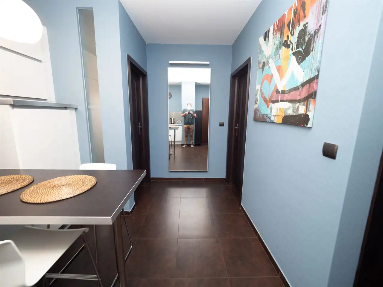 High-quality furniture, fixtures, and flooring. The apartment is air-conditioned.